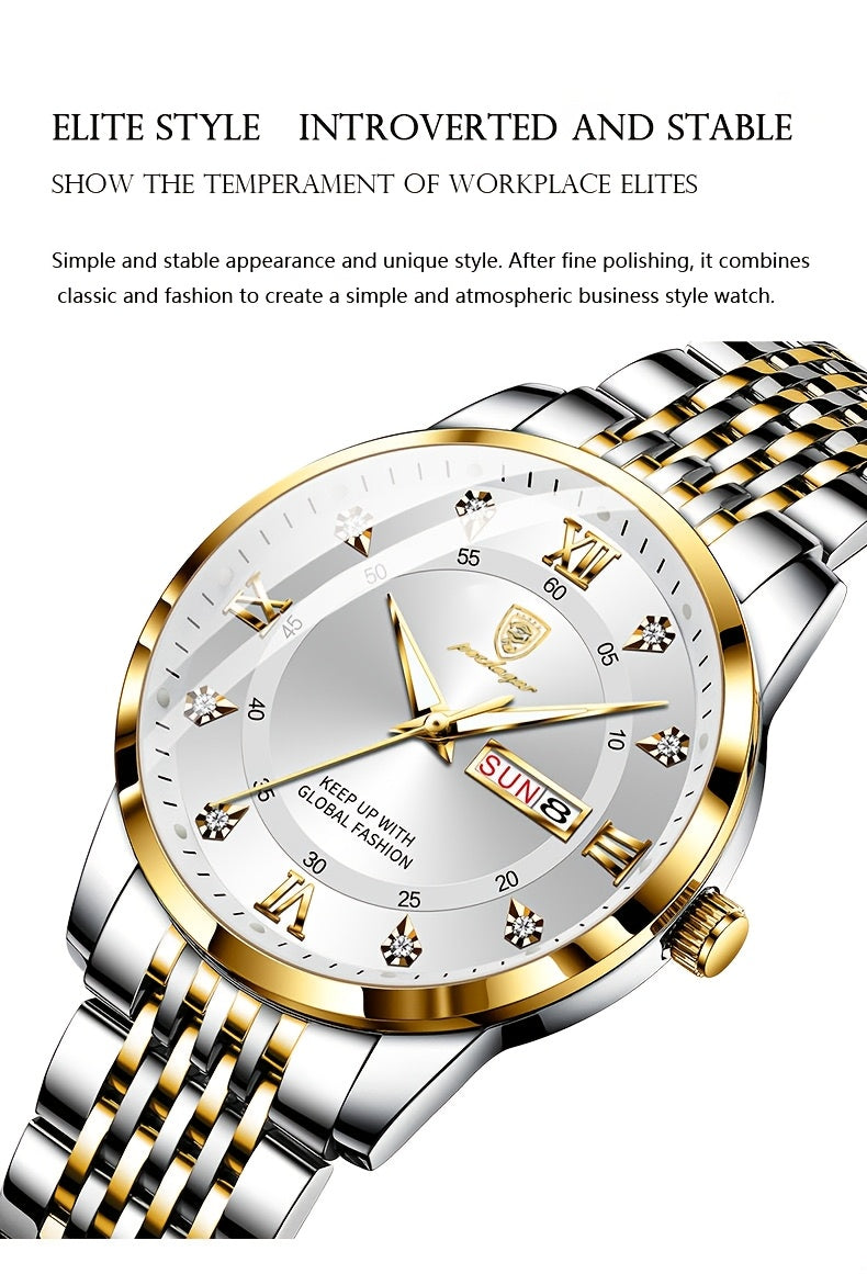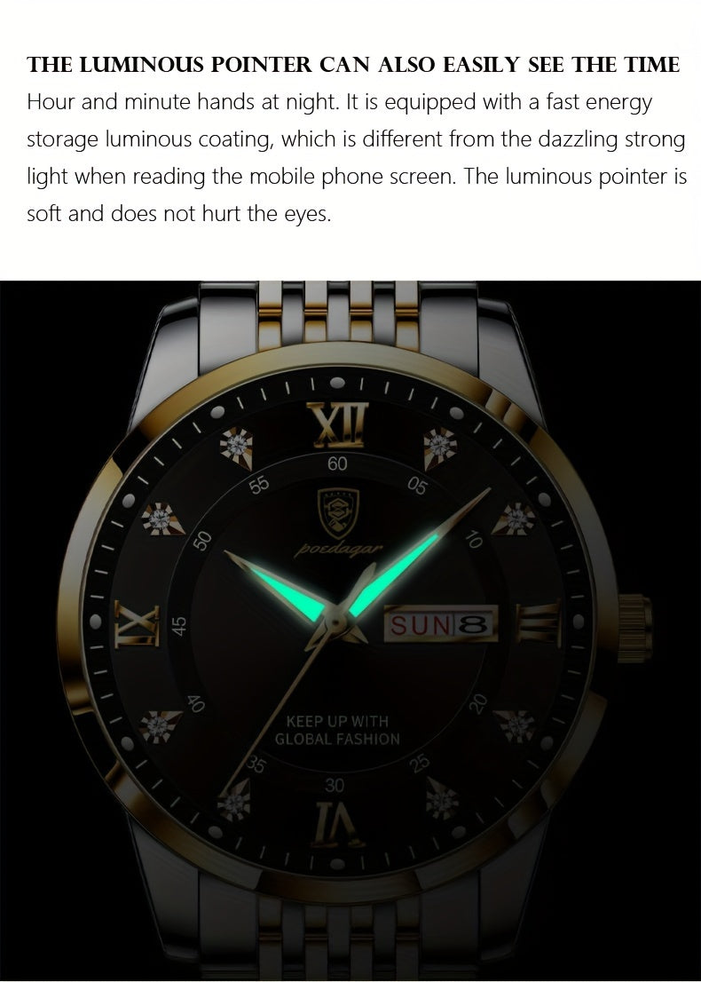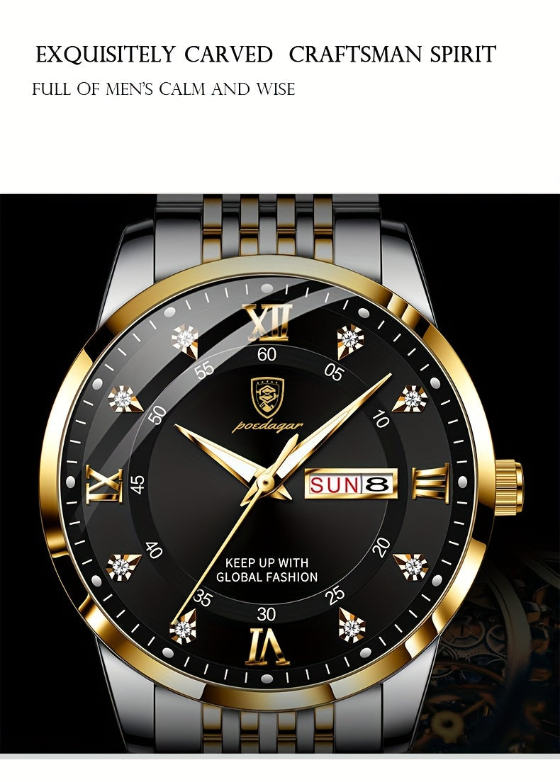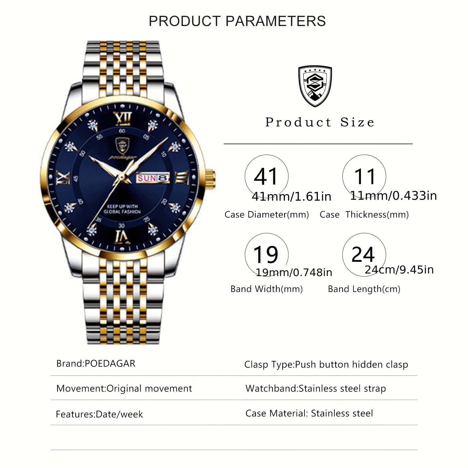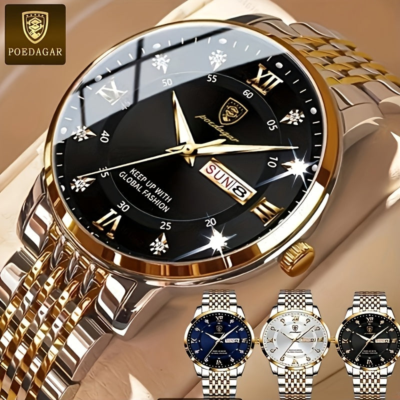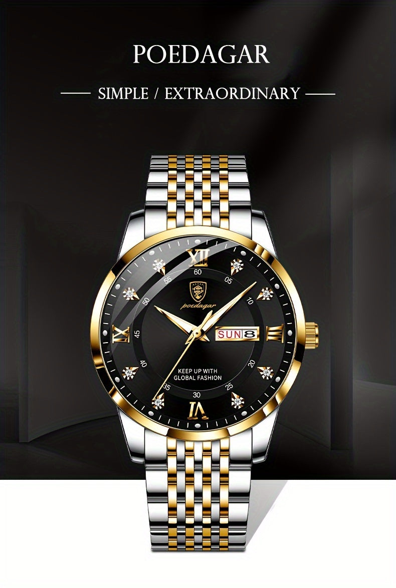 POEDAGAR Classic Men'S Stainless Steel Quartz Watch, IPX8 Luminous Weekly Calendar Watch for Men, Perfect Gift Option, Suitable for Women