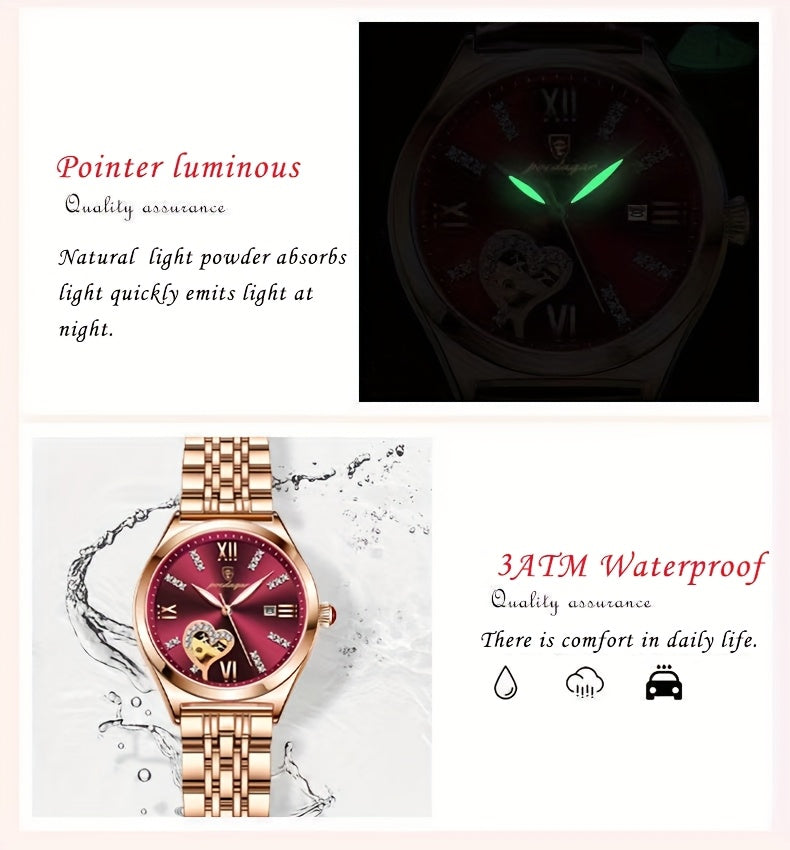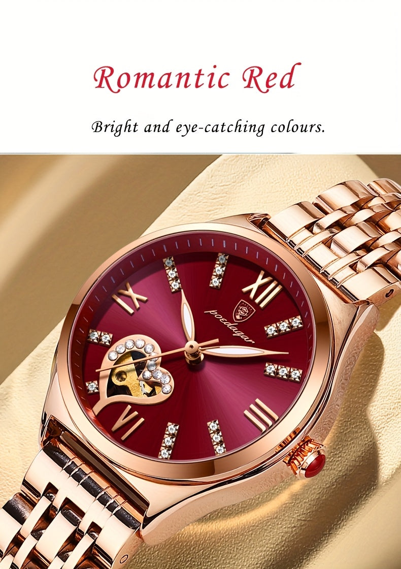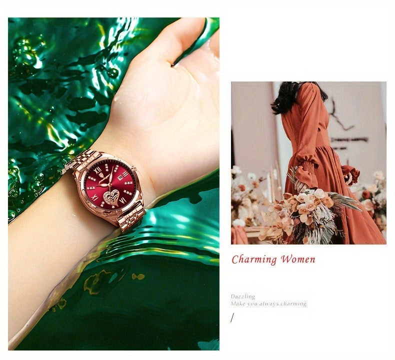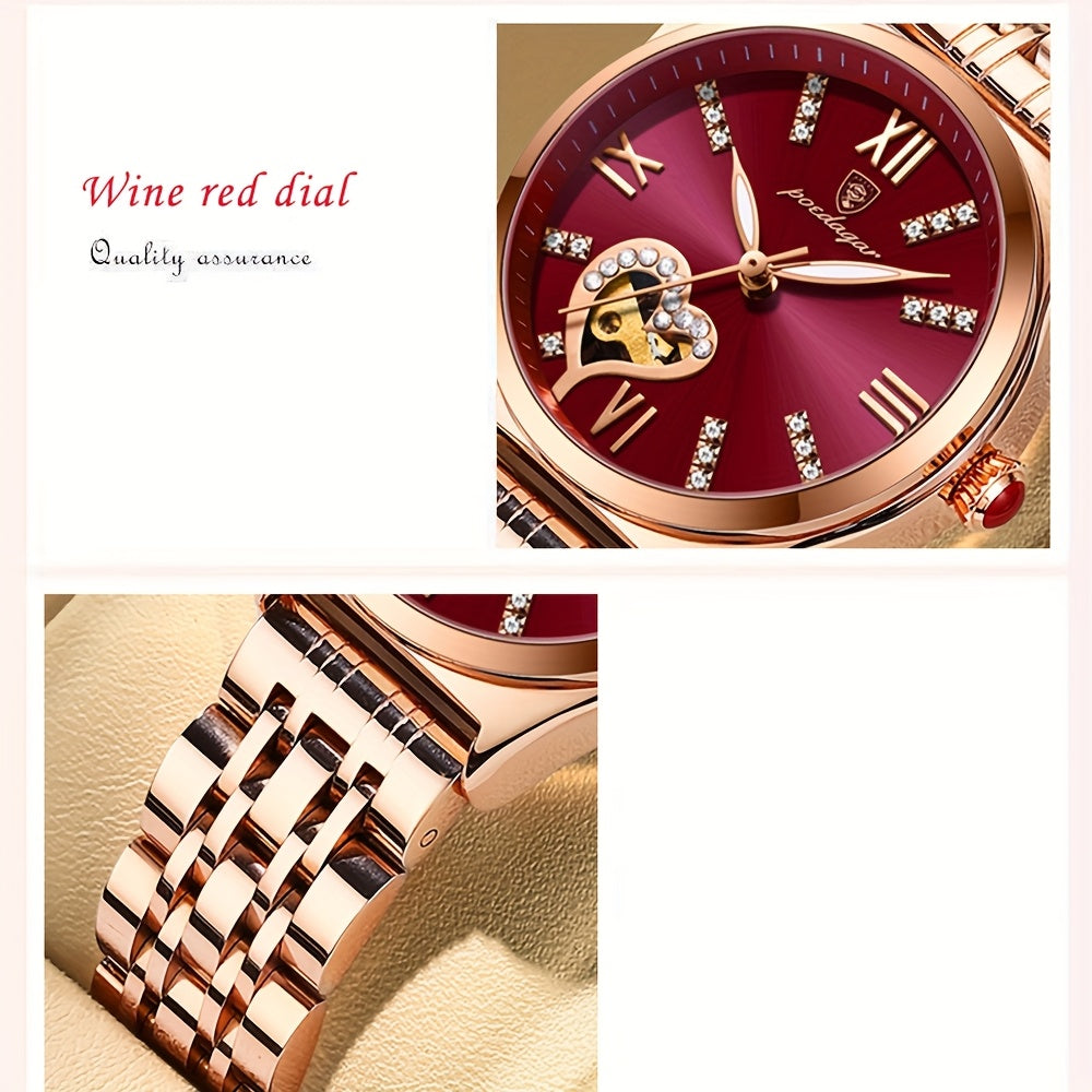 POEDAGAR Elegant Women's Quartz Watch - Rose Golden-Tone Stainless Steel, Luminous Hands & Calendar,, Date Display with Heart Detail
