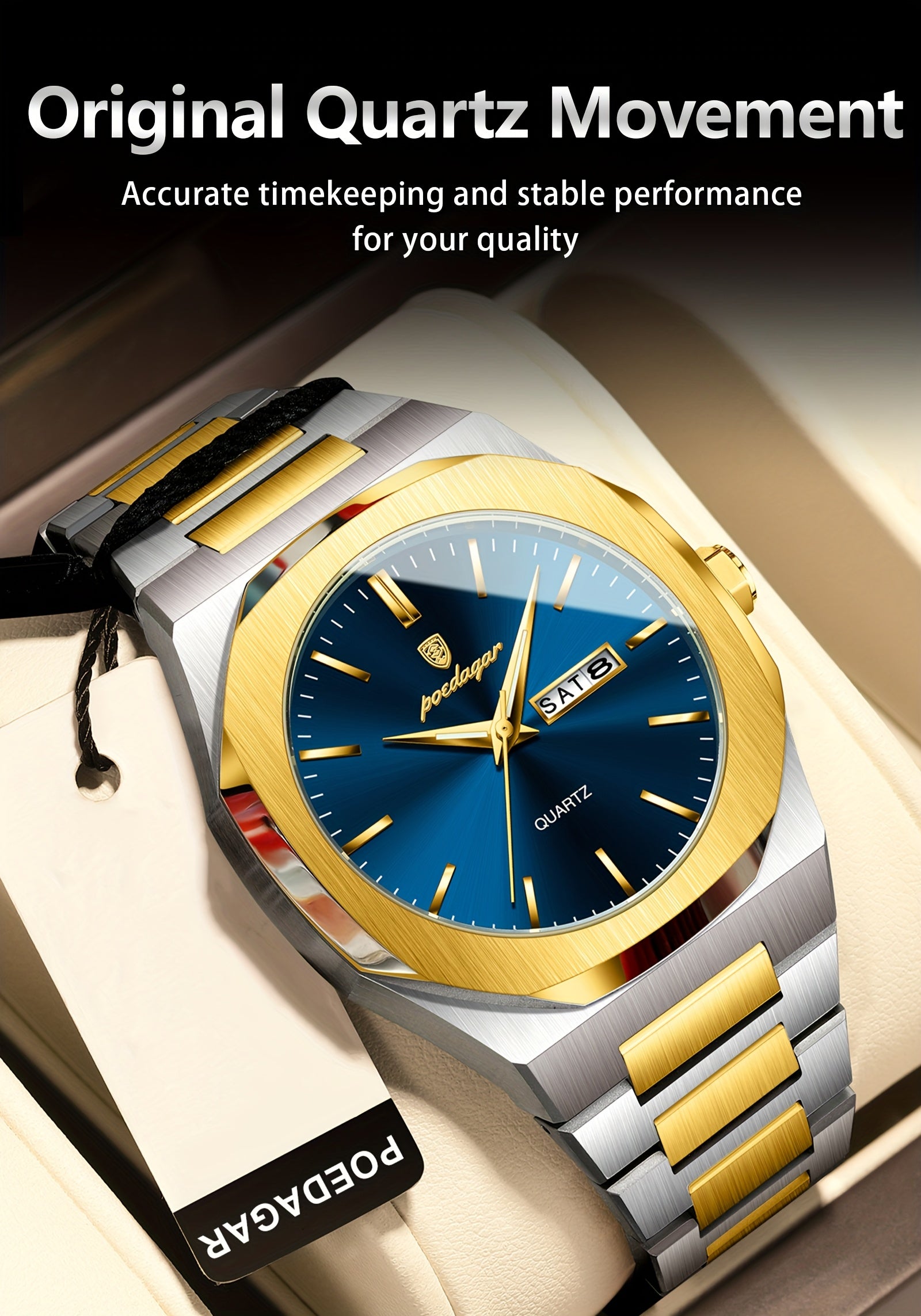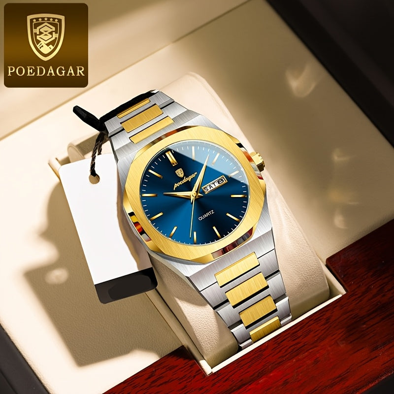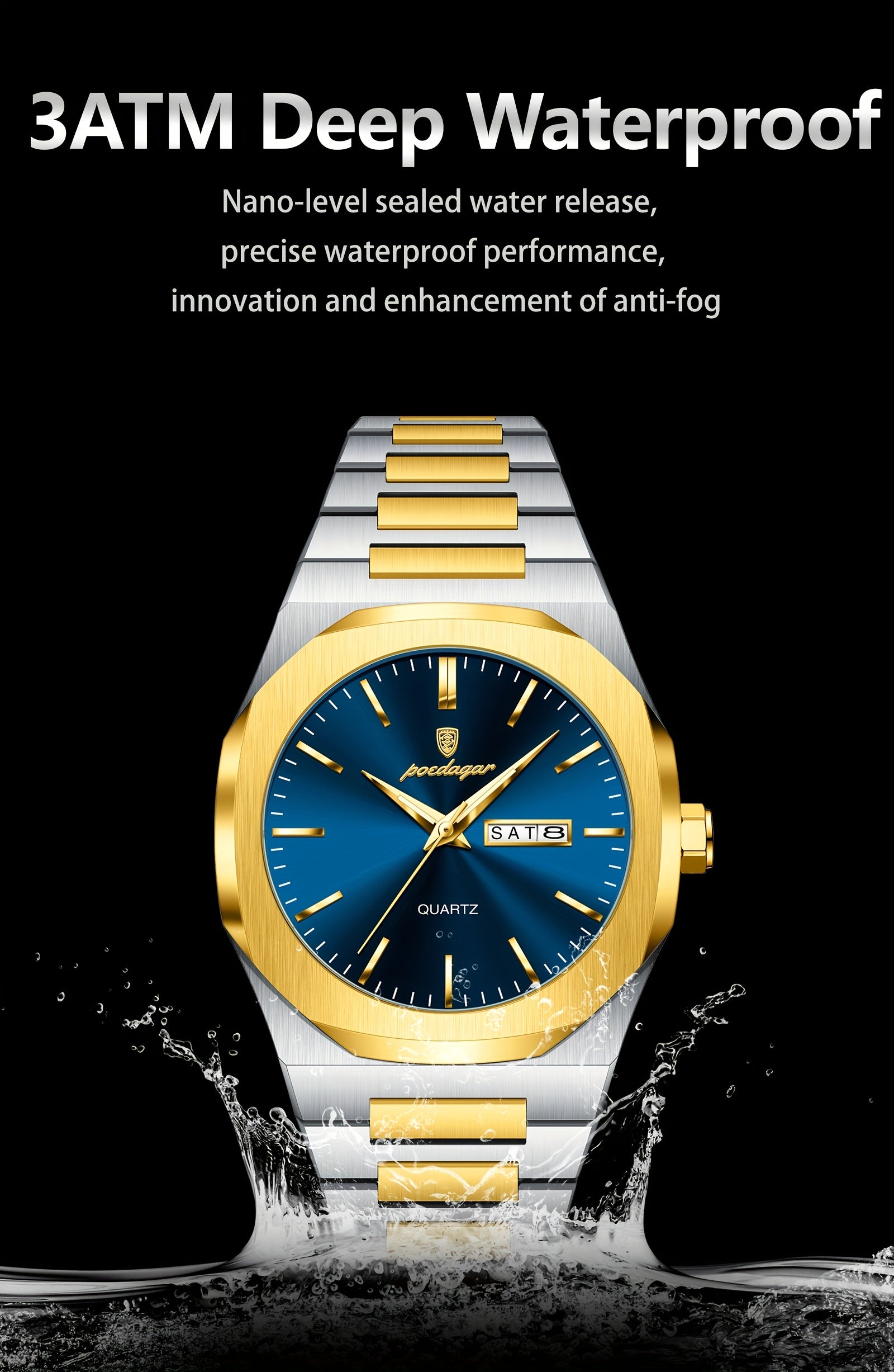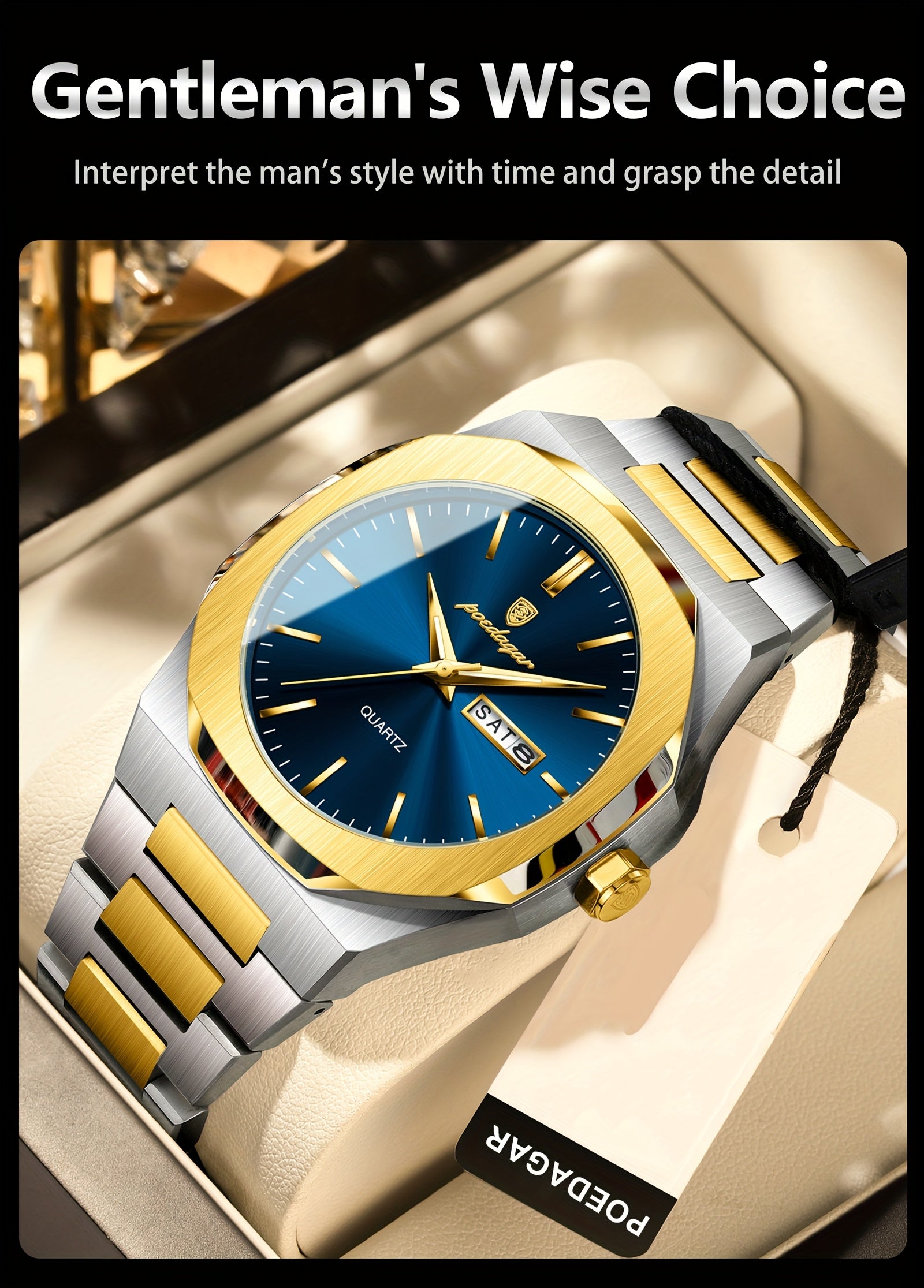 POEDAGAR Men'S Luxury Quartz Watch - Waterproof, Luminous Calendar, Stainless Steel Band, Business Style, Blue & Golden Accents, 3ATM, Non-Rechargeable Button Battery, Perfect for Spring Festival & Valentine'S Day Gifts