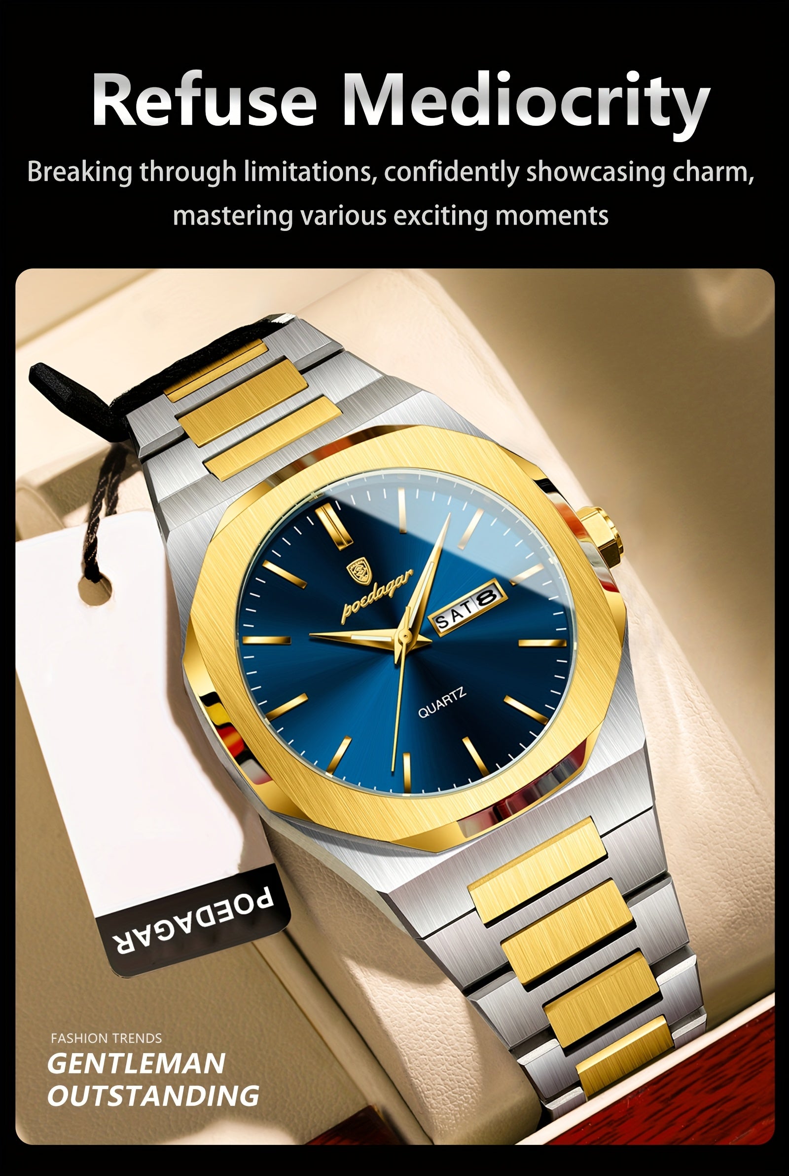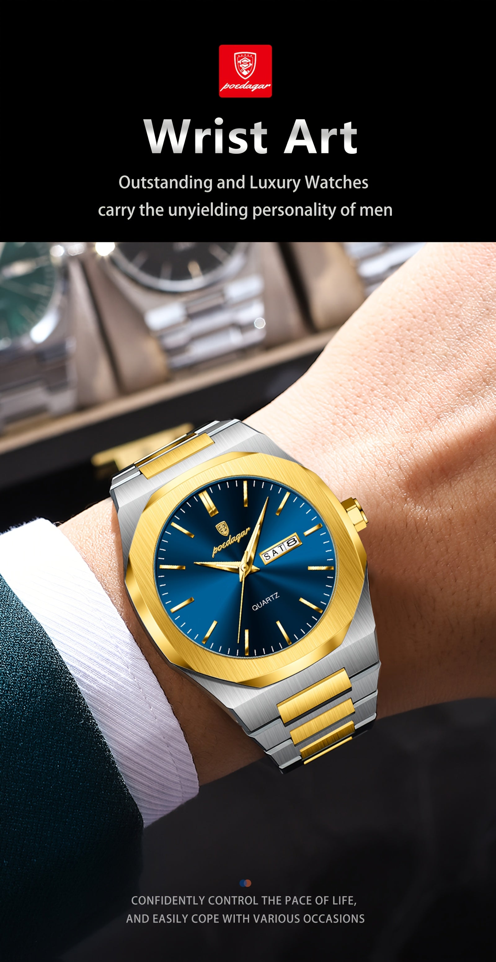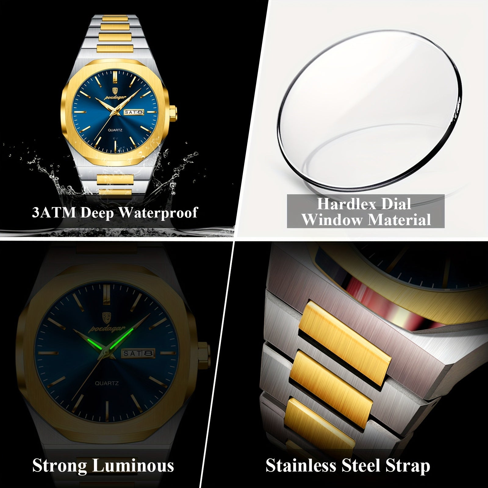 POEDAGAR Men'S Luxury Quartz Watch - Waterproof, Luminous Calendar, Stainless Steel Band, Business Style, Blue & Golden Accents, 3ATM, Non-Rechargeable Button Battery, Perfect for Spring Festival & Valentine'S Day Gifts