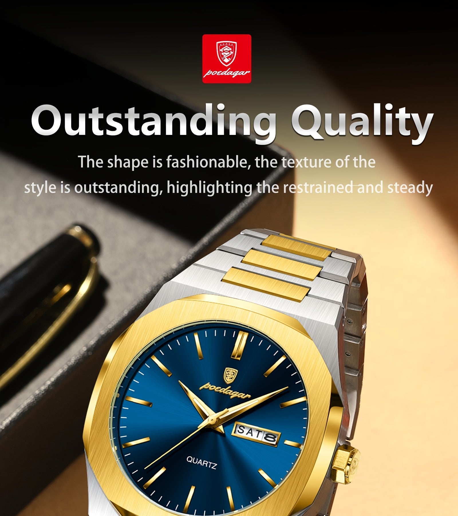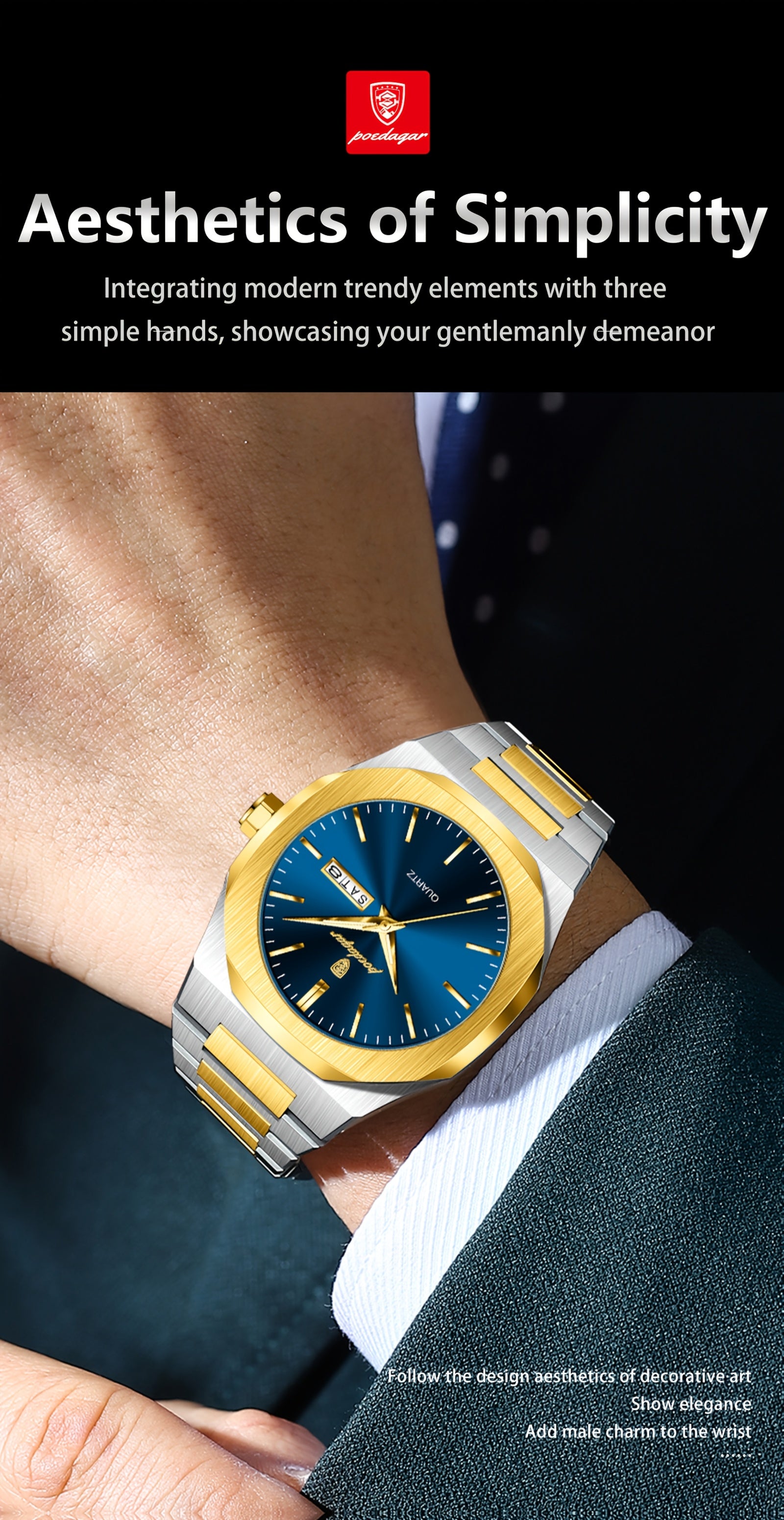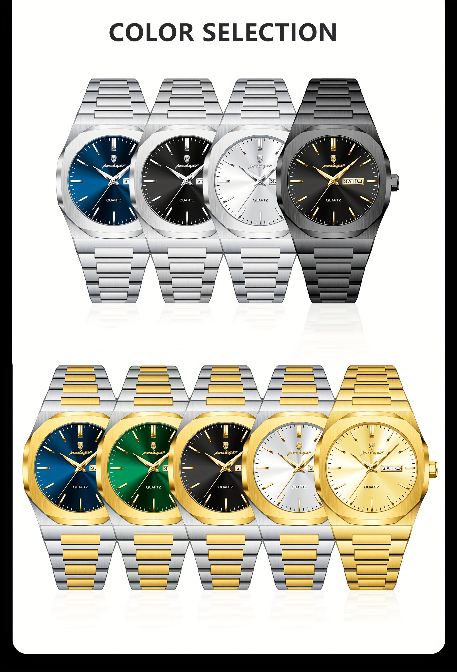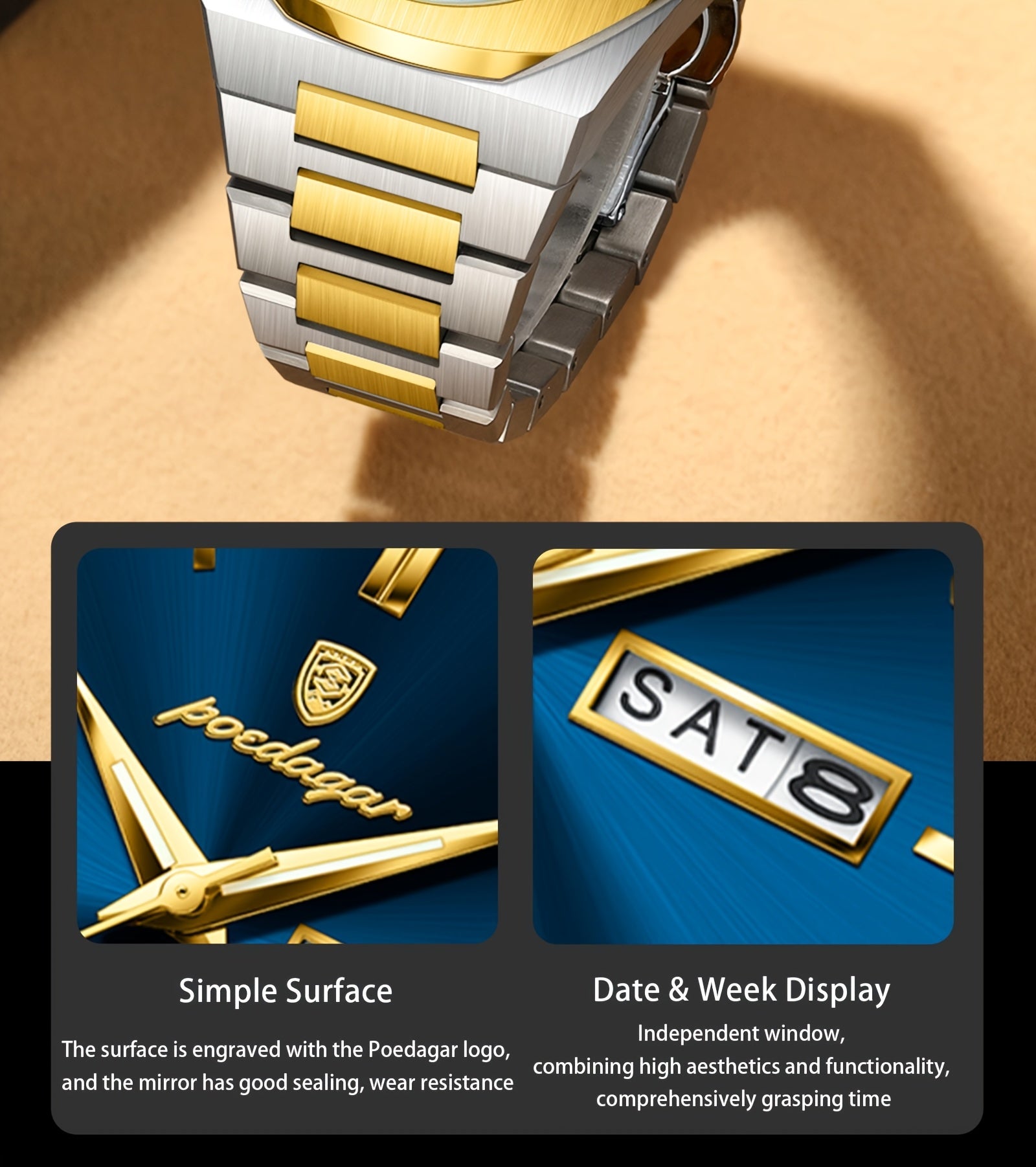 POEDAGAR Men'S Luxury Quartz Watch - Waterproof, Luminous Calendar, Stainless Steel Band, Business Style, Blue & Golden Accents, 3ATM, Non-Rechargeable Button Battery, Perfect for Spring Festival & Valentine'S Day Gifts