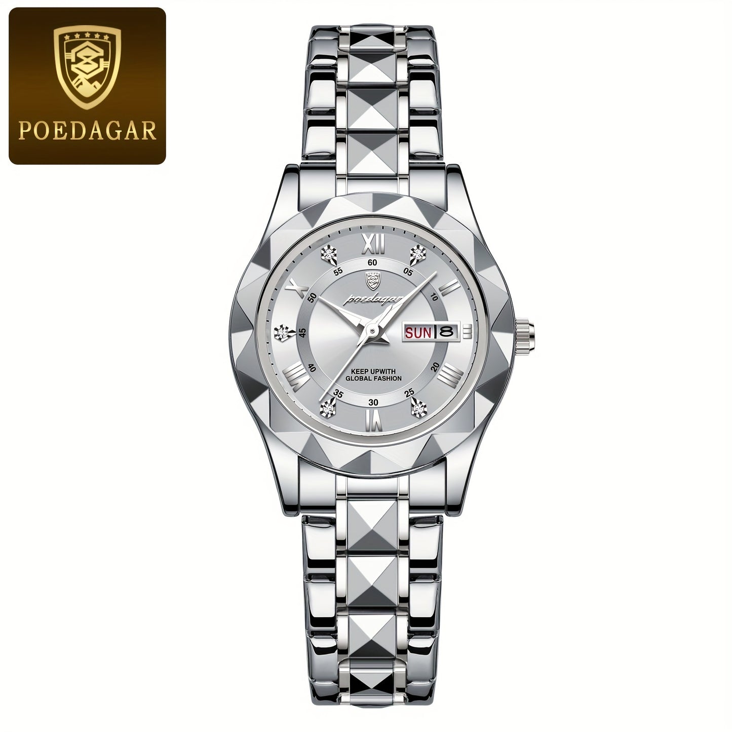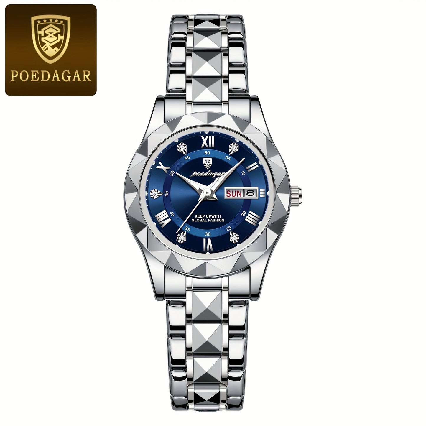POEDAGAR Women's Elegant Stainless Steel Quartz Watch with Luminous Blue Dial, Roman Numerals, Date Calendar, IPX7 High Quality & -Accented Band for Casual & Formal Wear