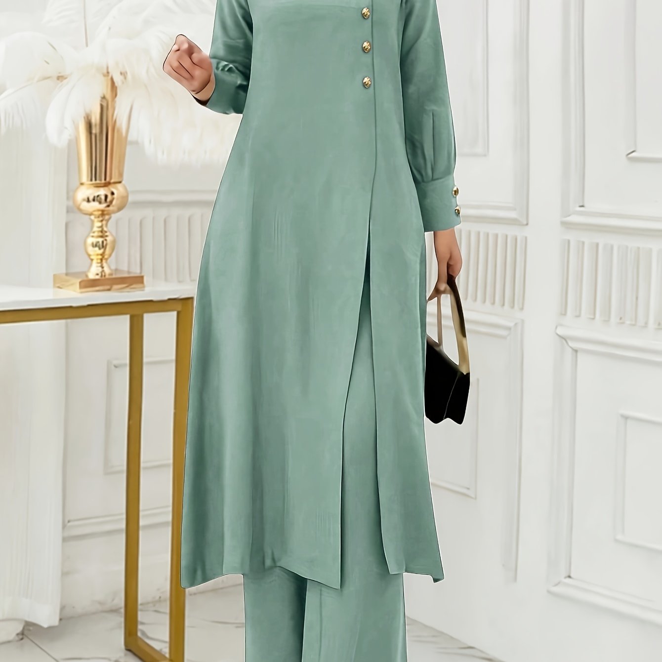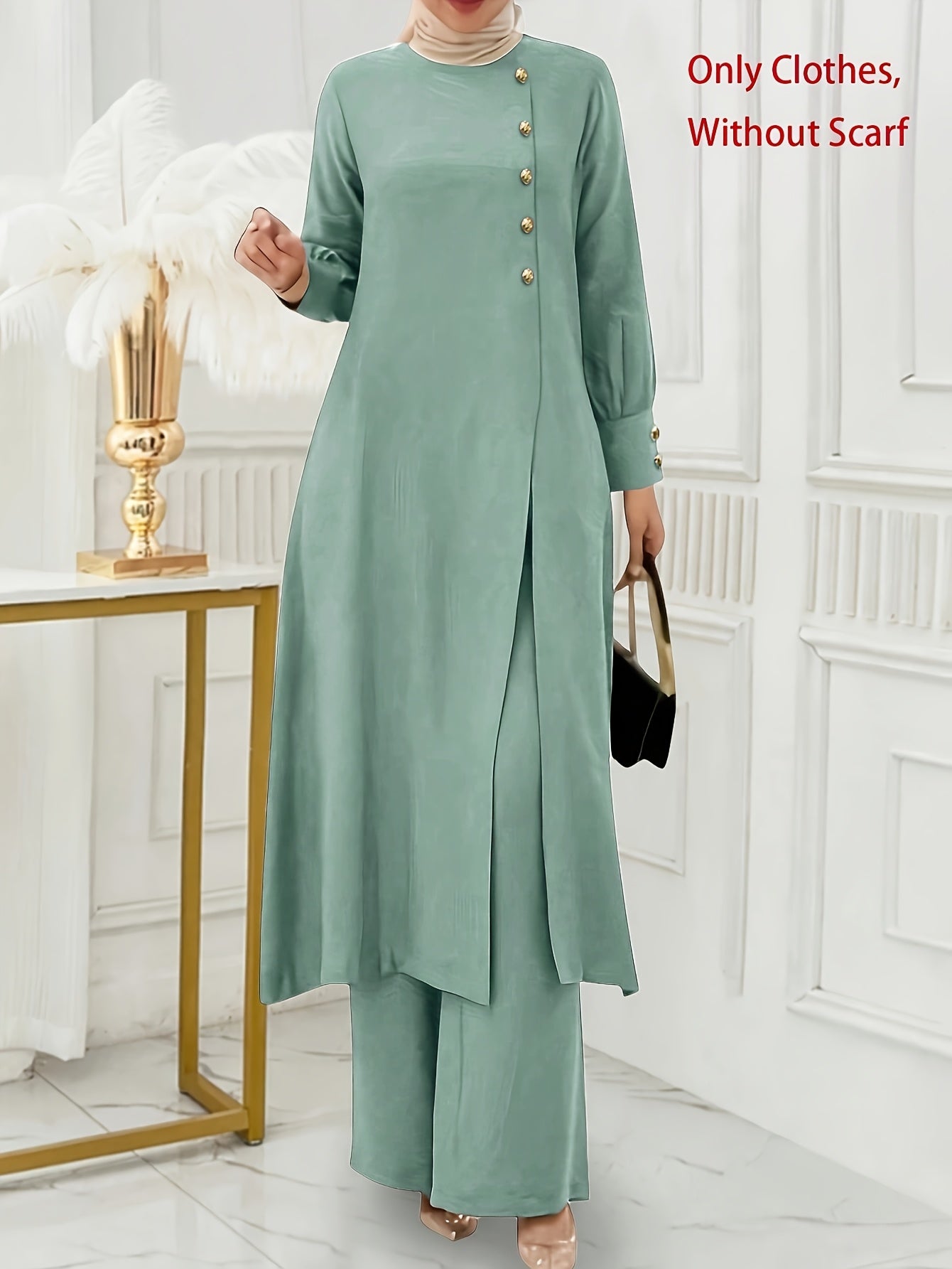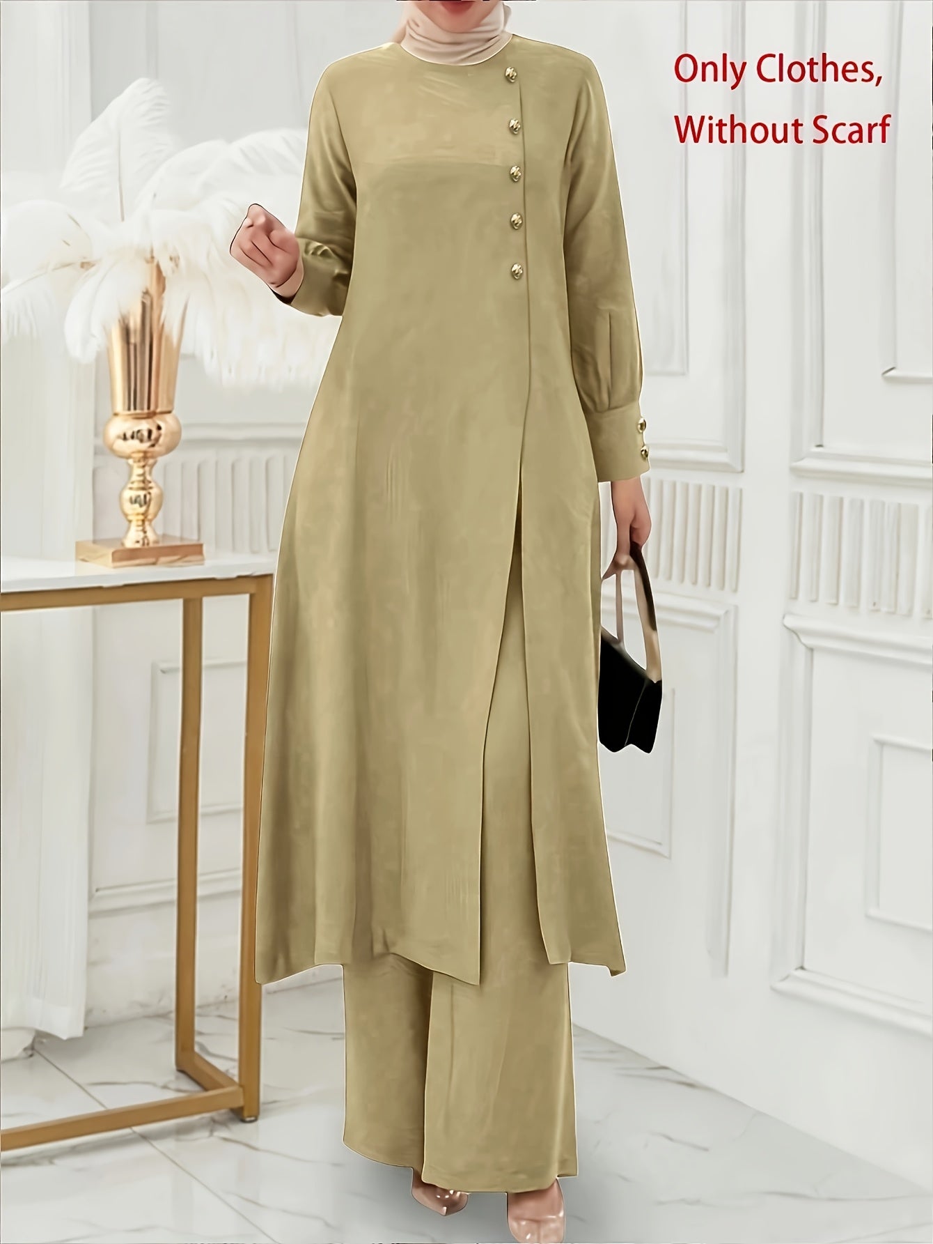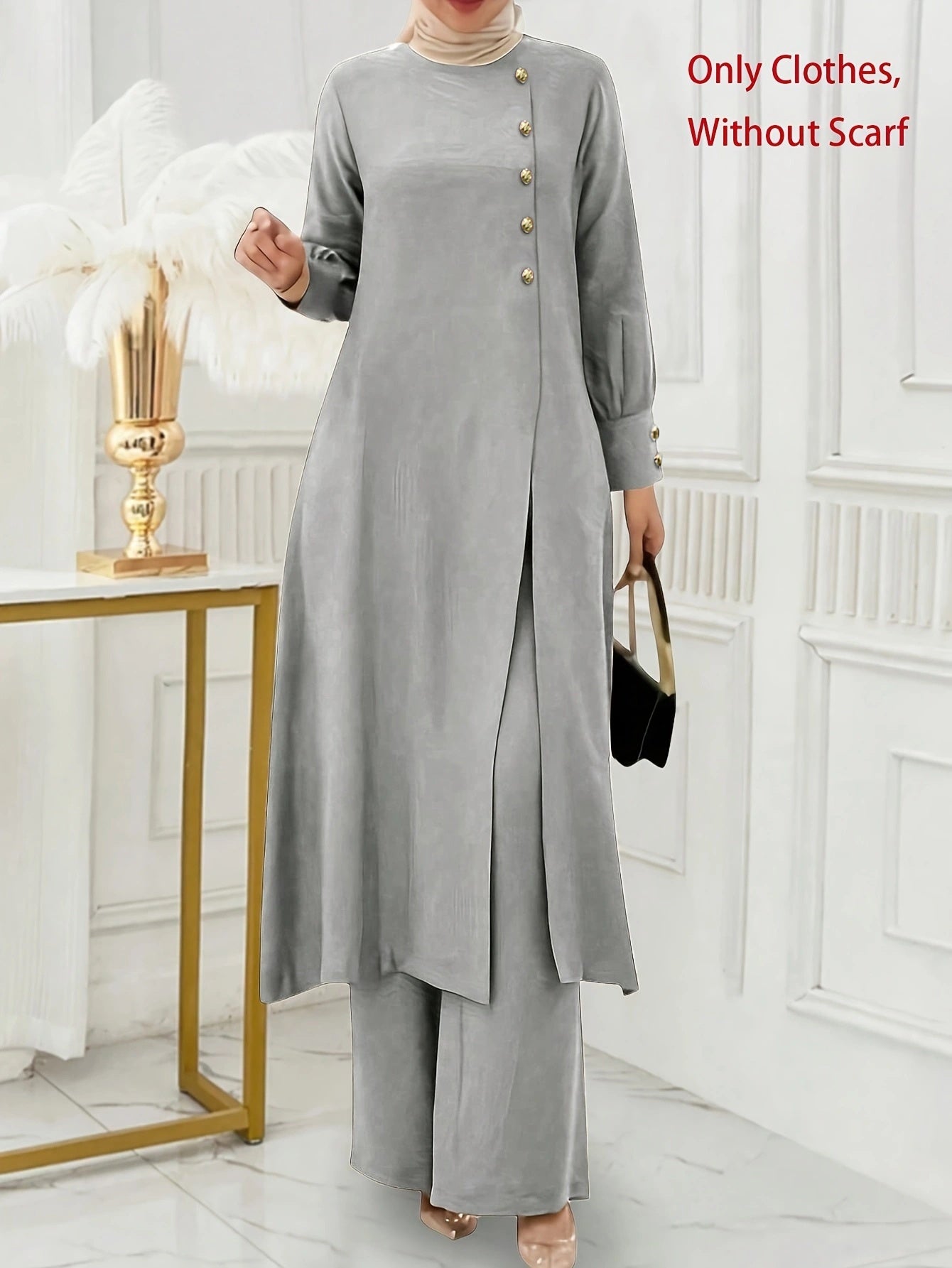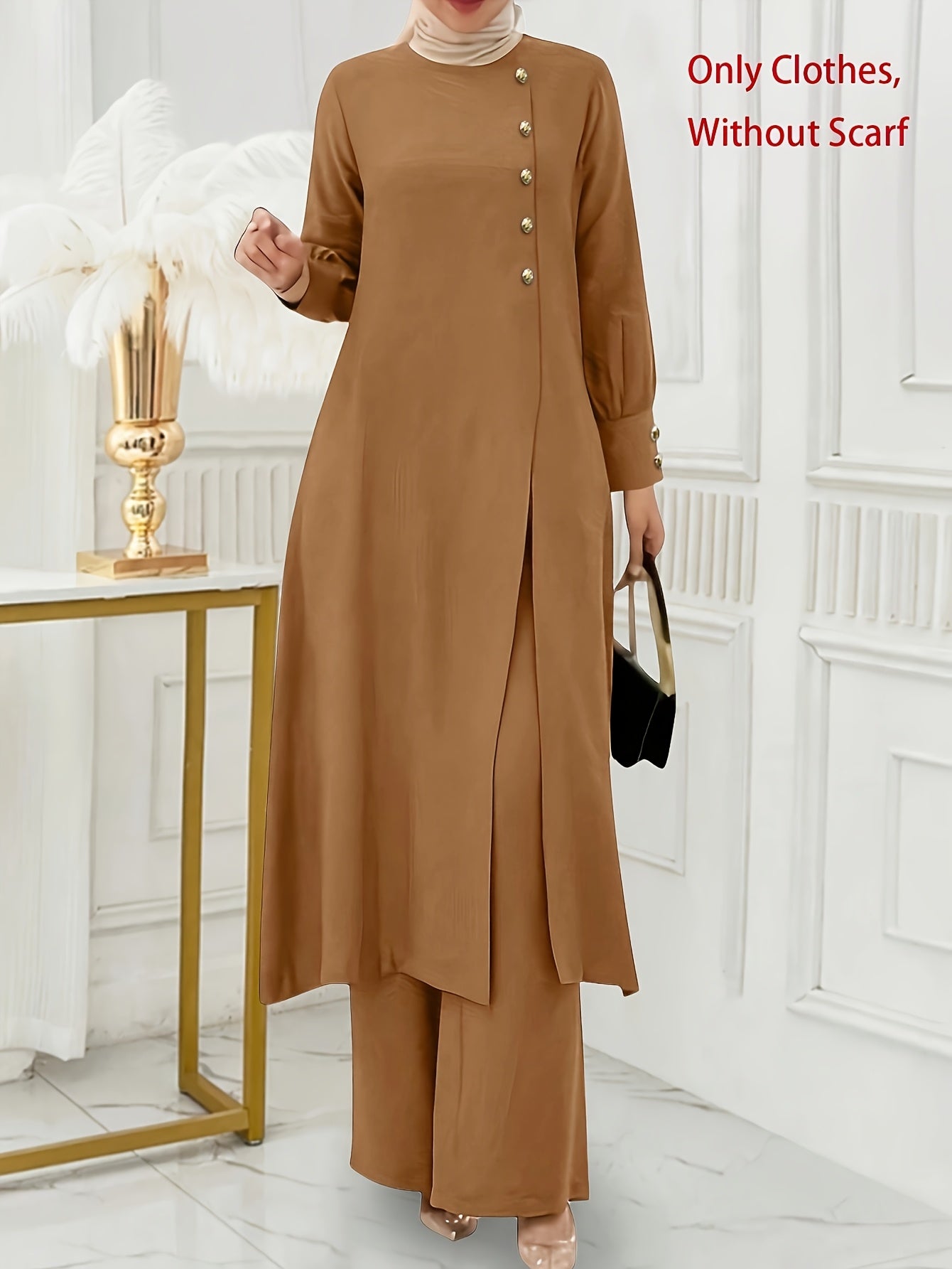 Ramadan, Women's Front-Button Long Sleeve Slit Dress & Pants Casual Arabic Style 2pcs Set, Only Clothes, Without Headscarf
