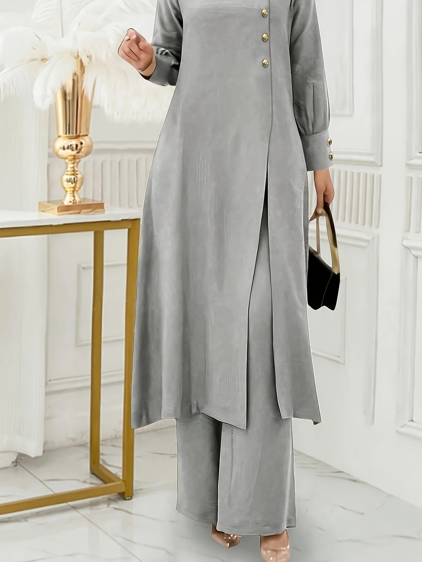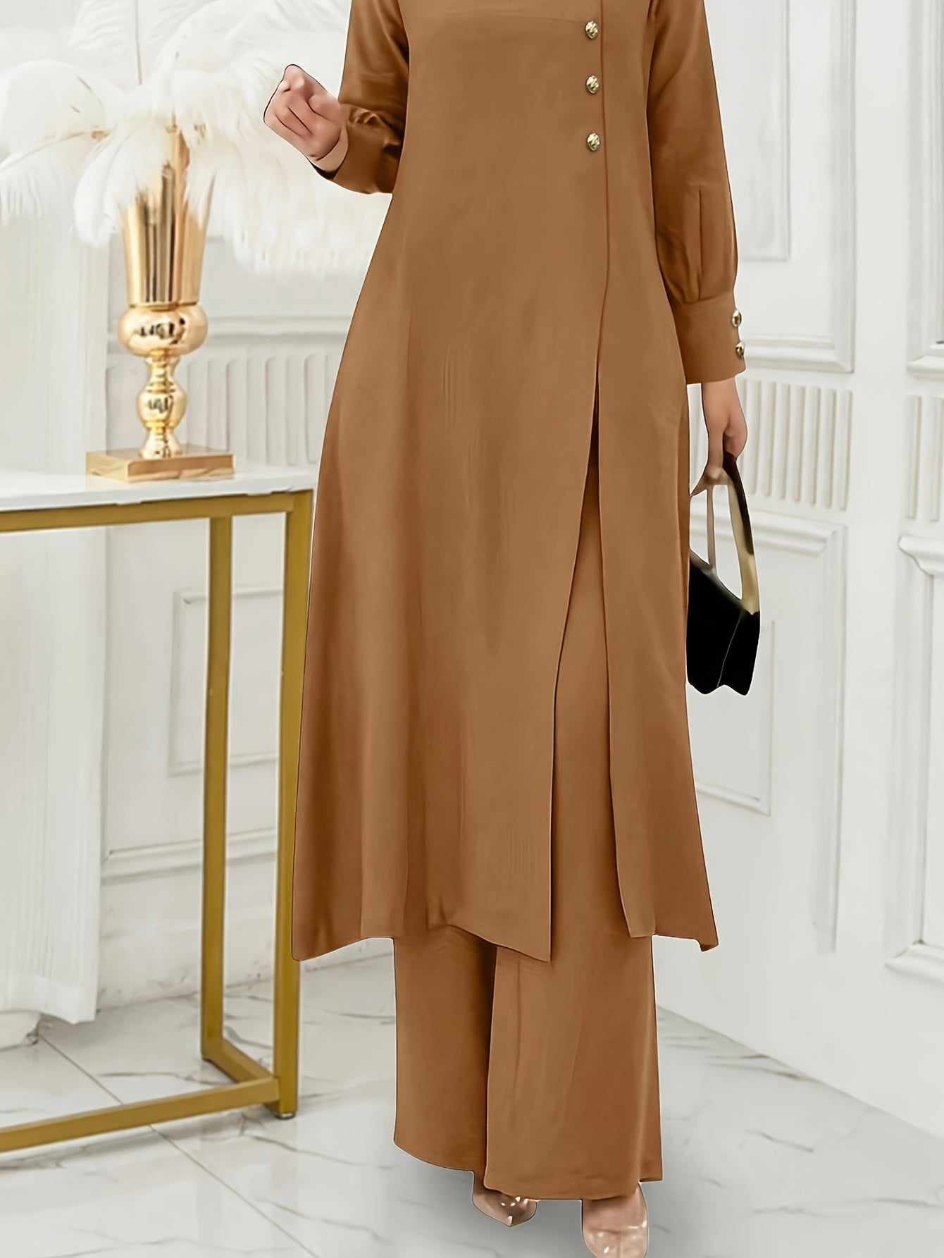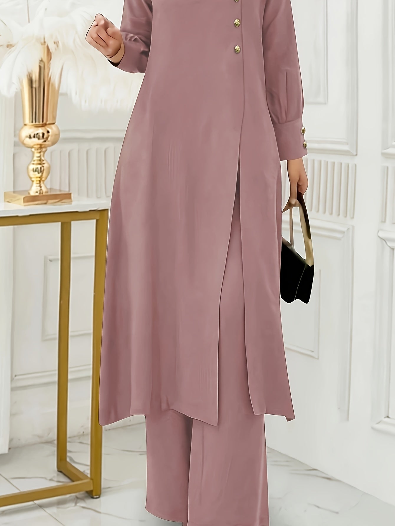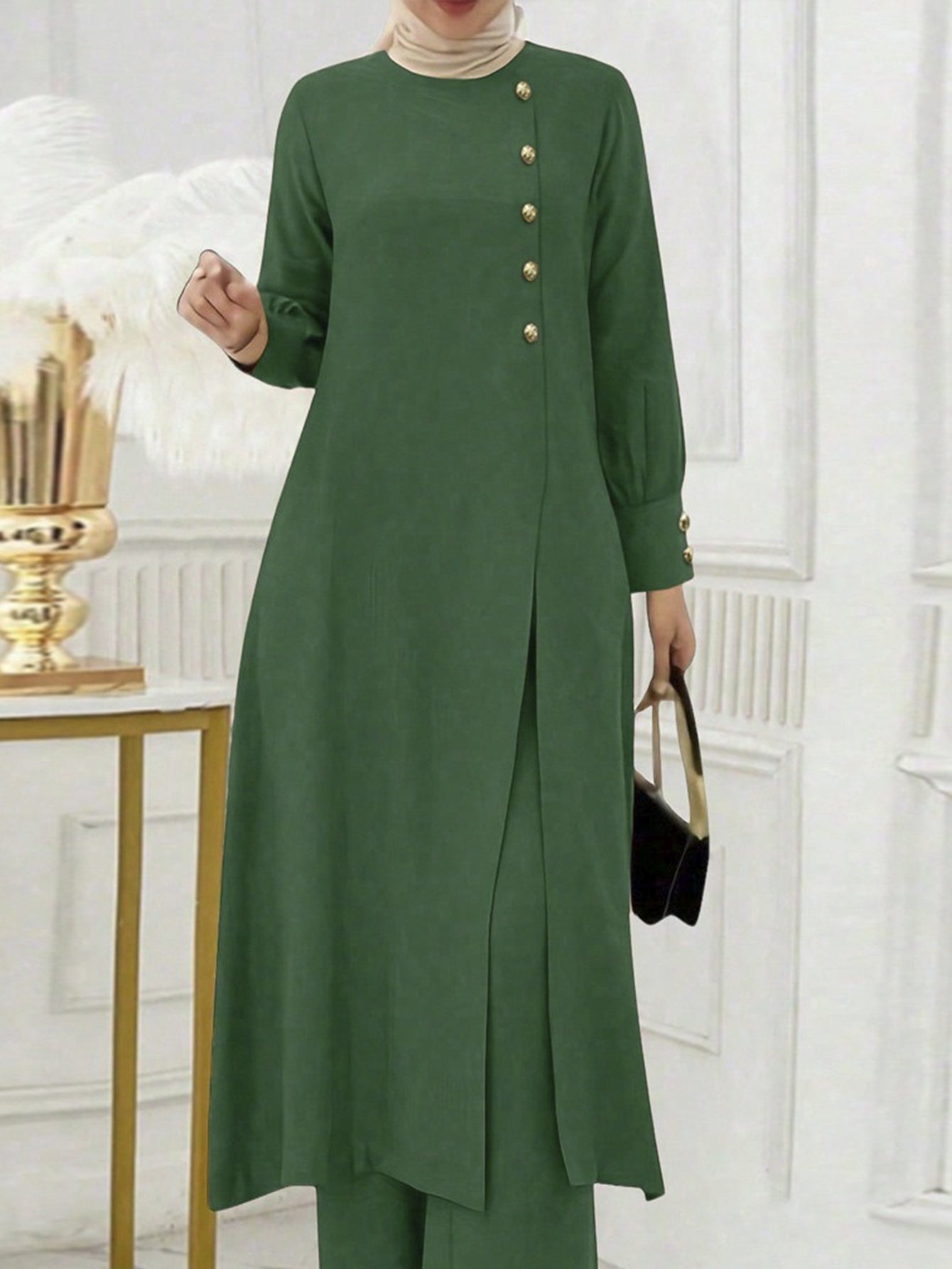 Ramadan, Women's Front-Button Long Sleeve Slit Dress & Pants Casual Arabic Style 2pcs Set, Only Clothes, Without Headscarf