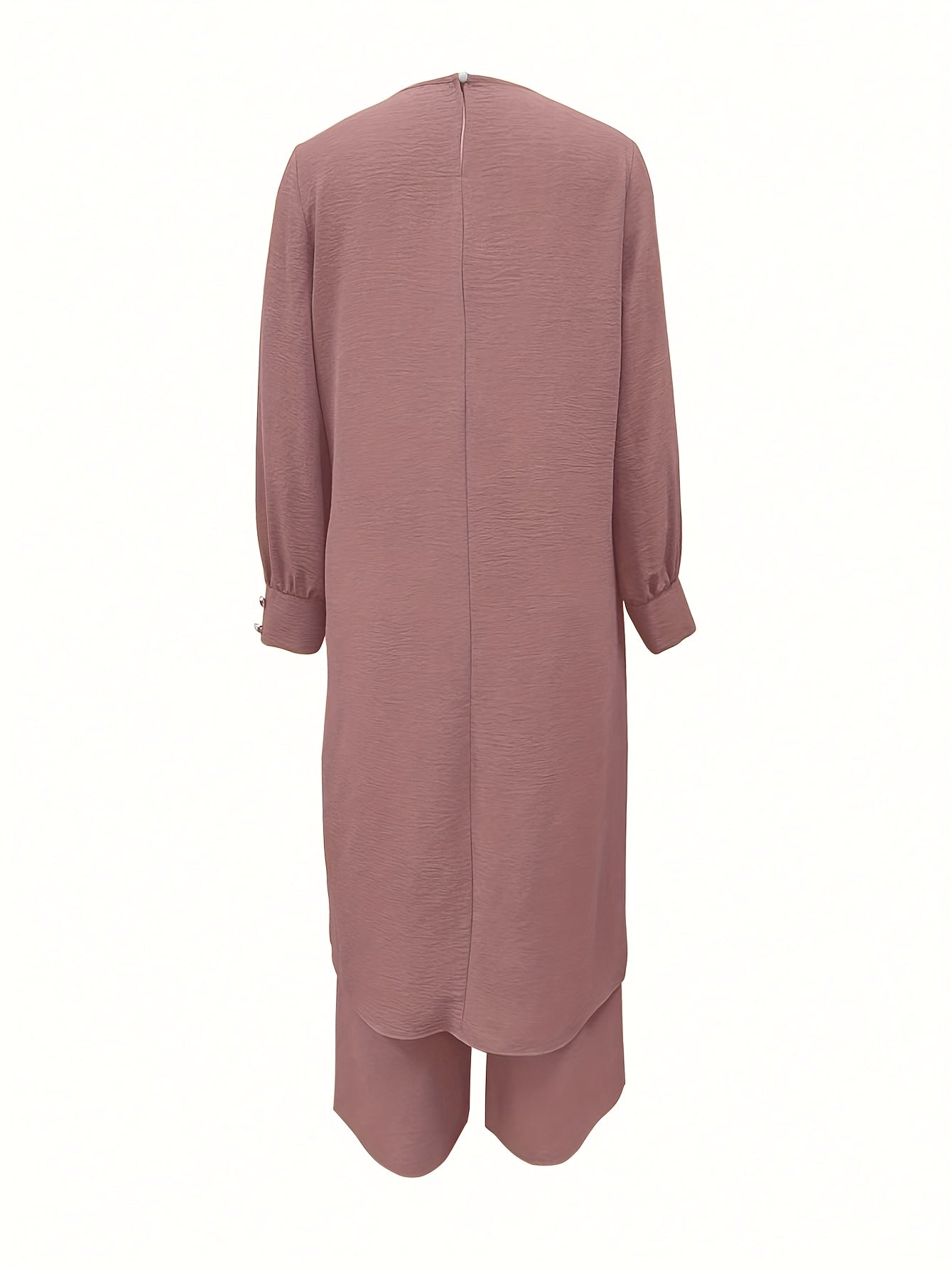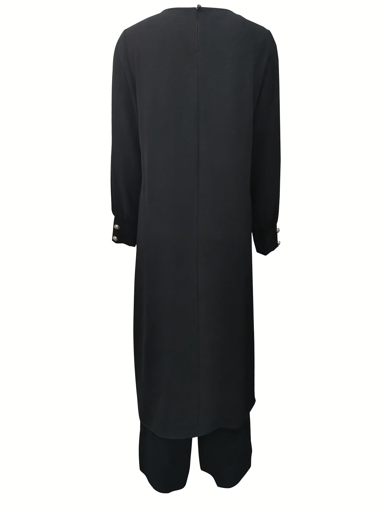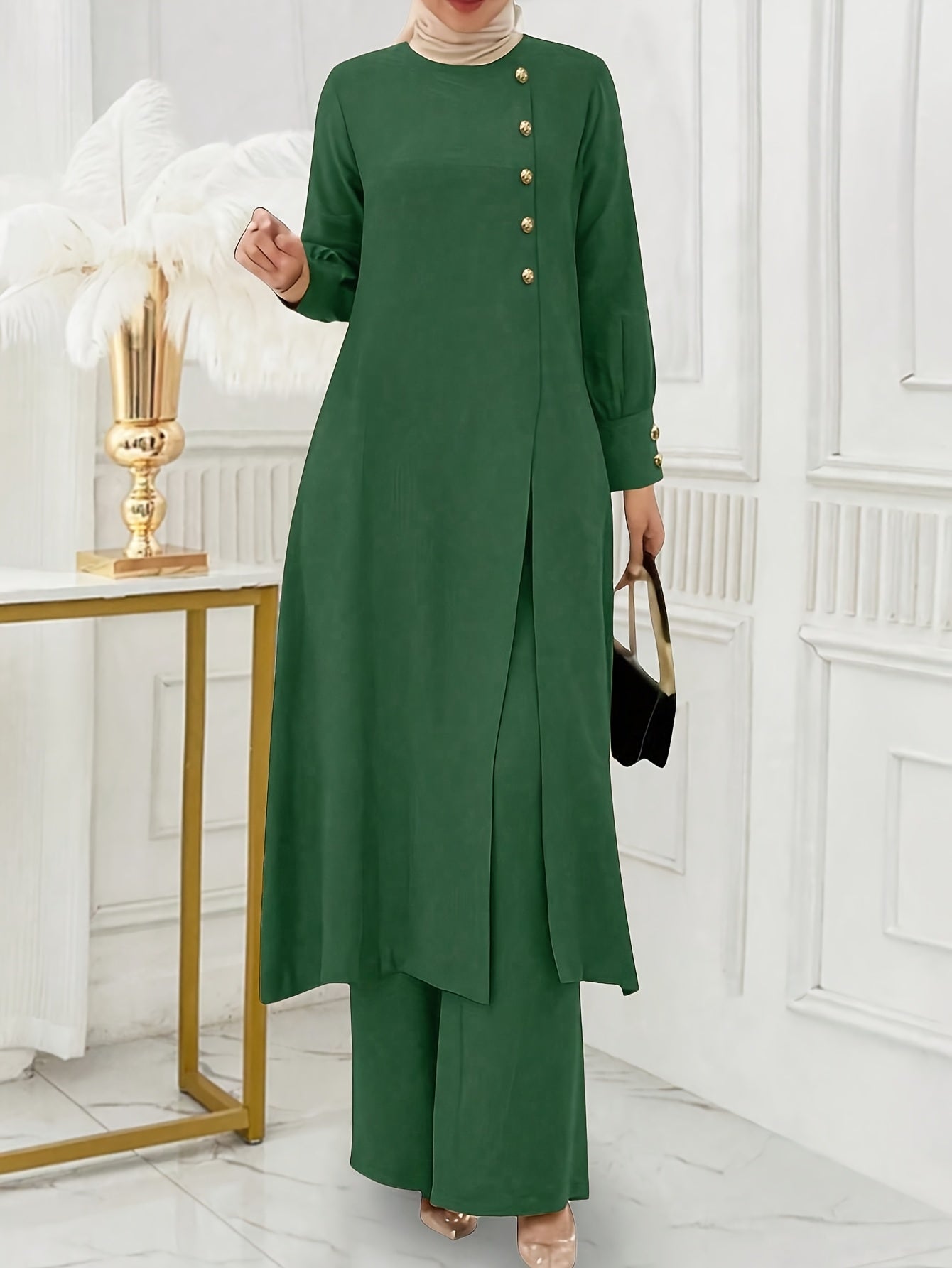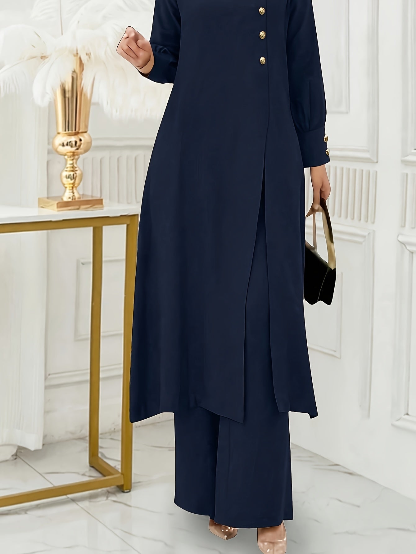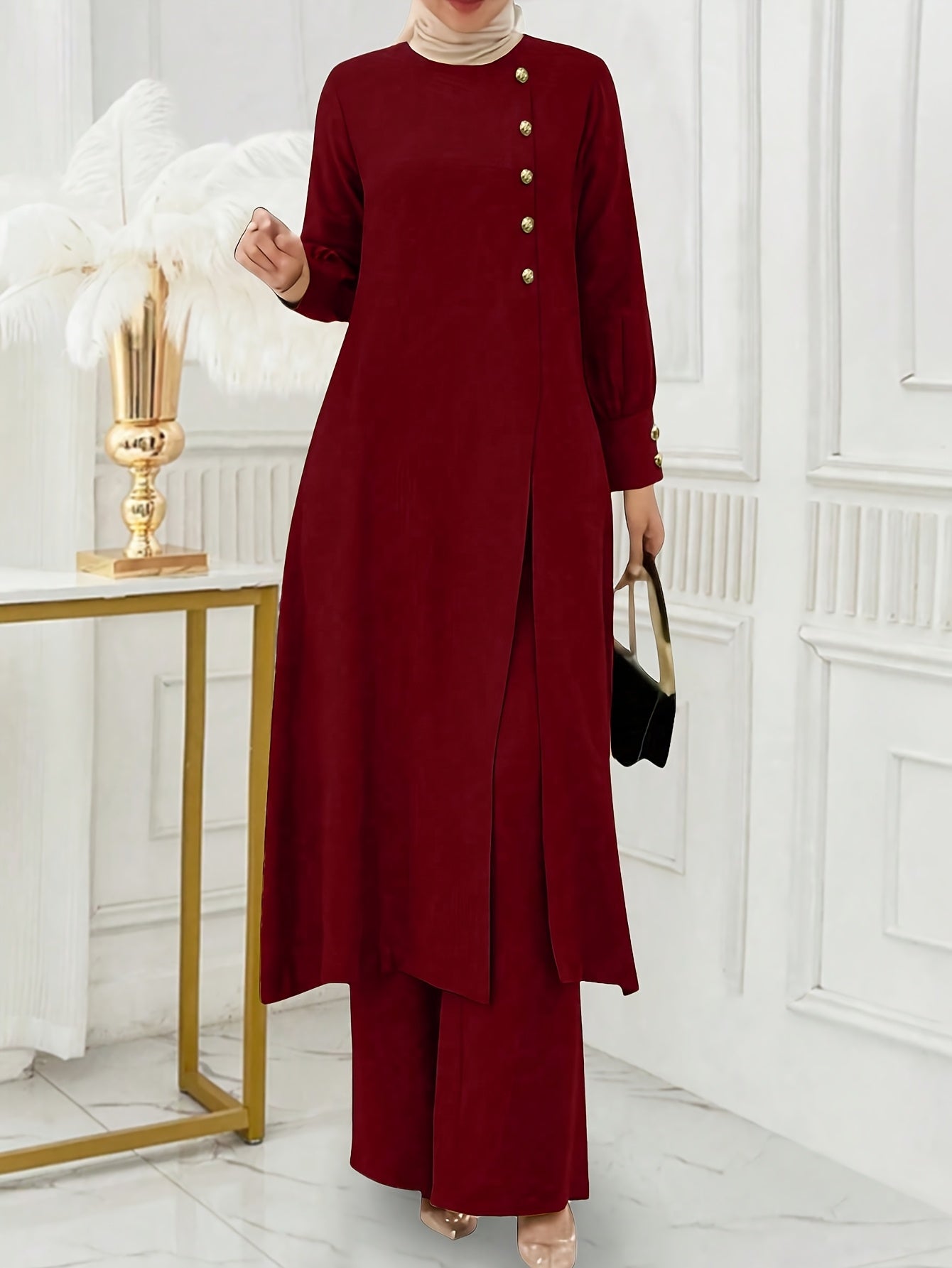 Ramadan, Women's Front-Button Long Sleeve Slit Dress & Pants Casual Arabic Style 2pcs Set, Only Clothes, Without Headscarf