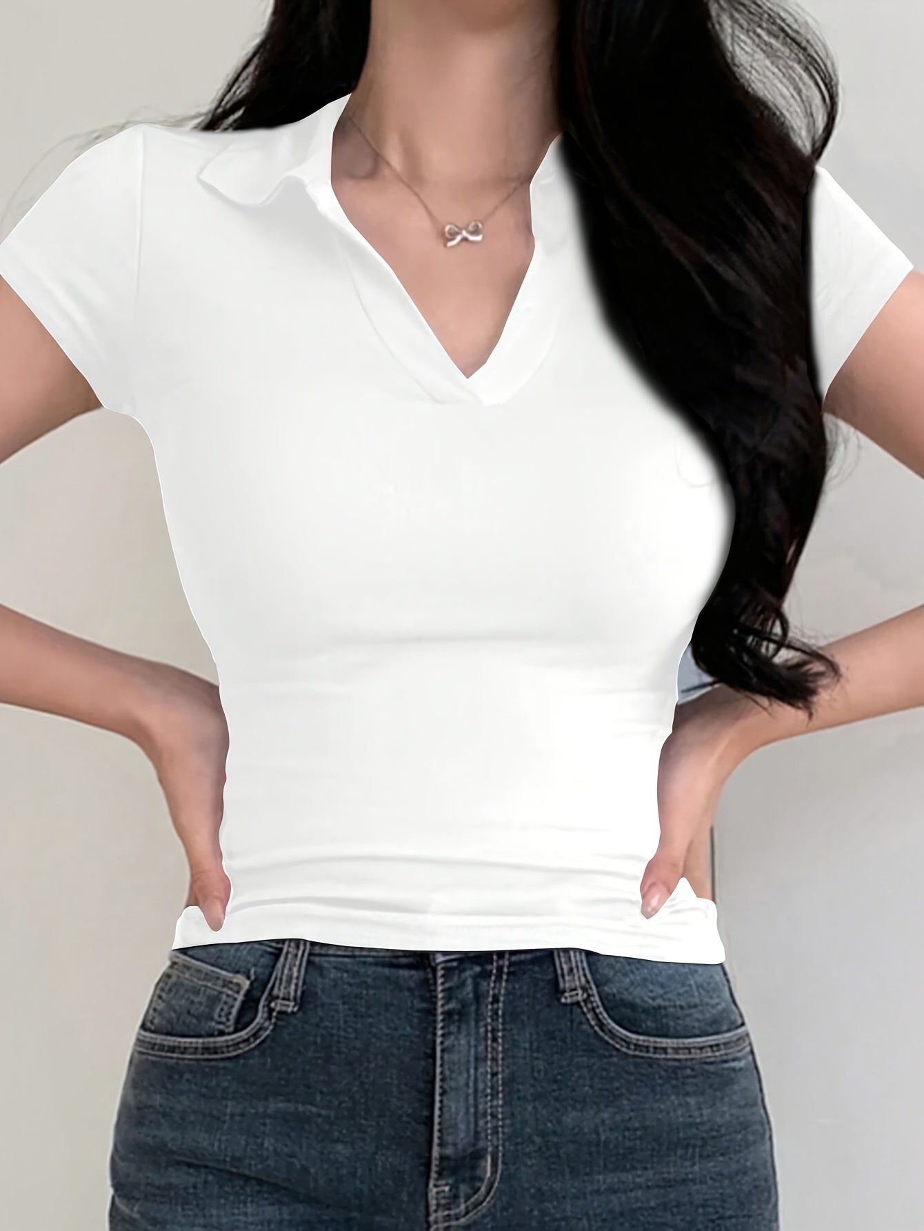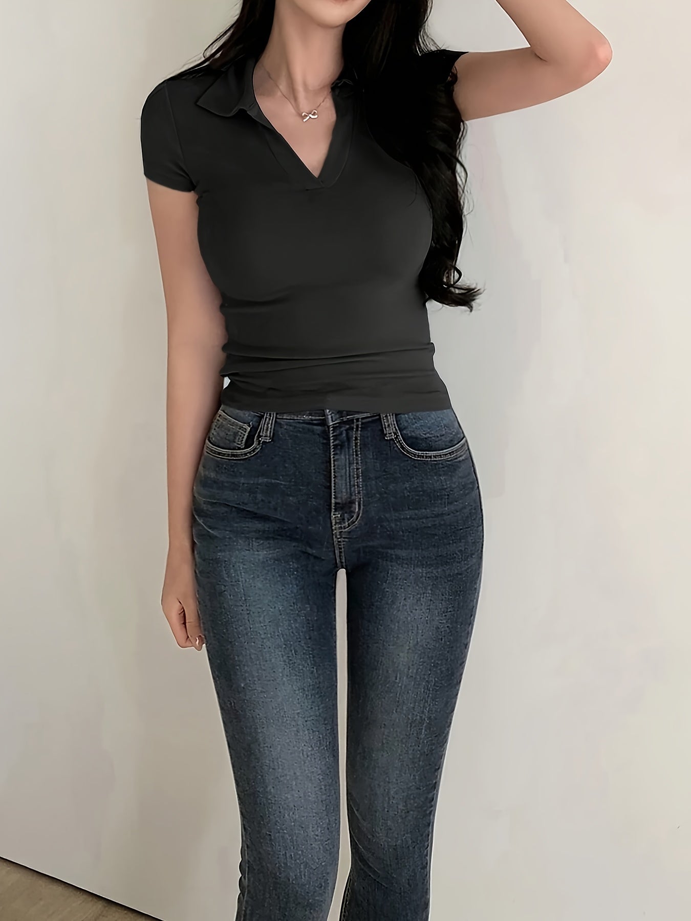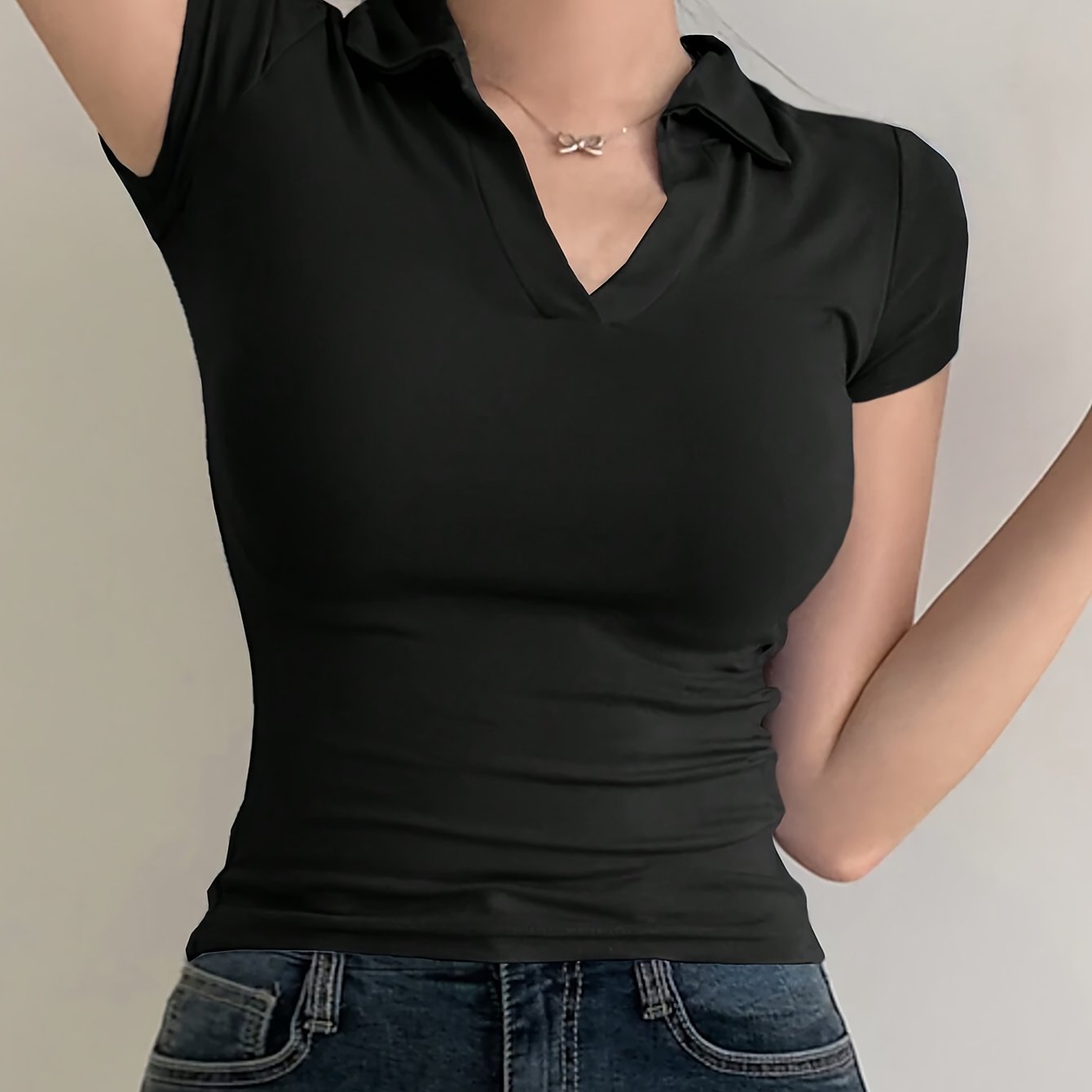 [Sleek Fit] Women's Slim Fit Short Sleeve Shirt - Elegant Black V-Neck Tee, Stretchy Polyester Blend, Machine Washable, Perfect for Spring/Summer/Fall, Short Sleeve Blouses