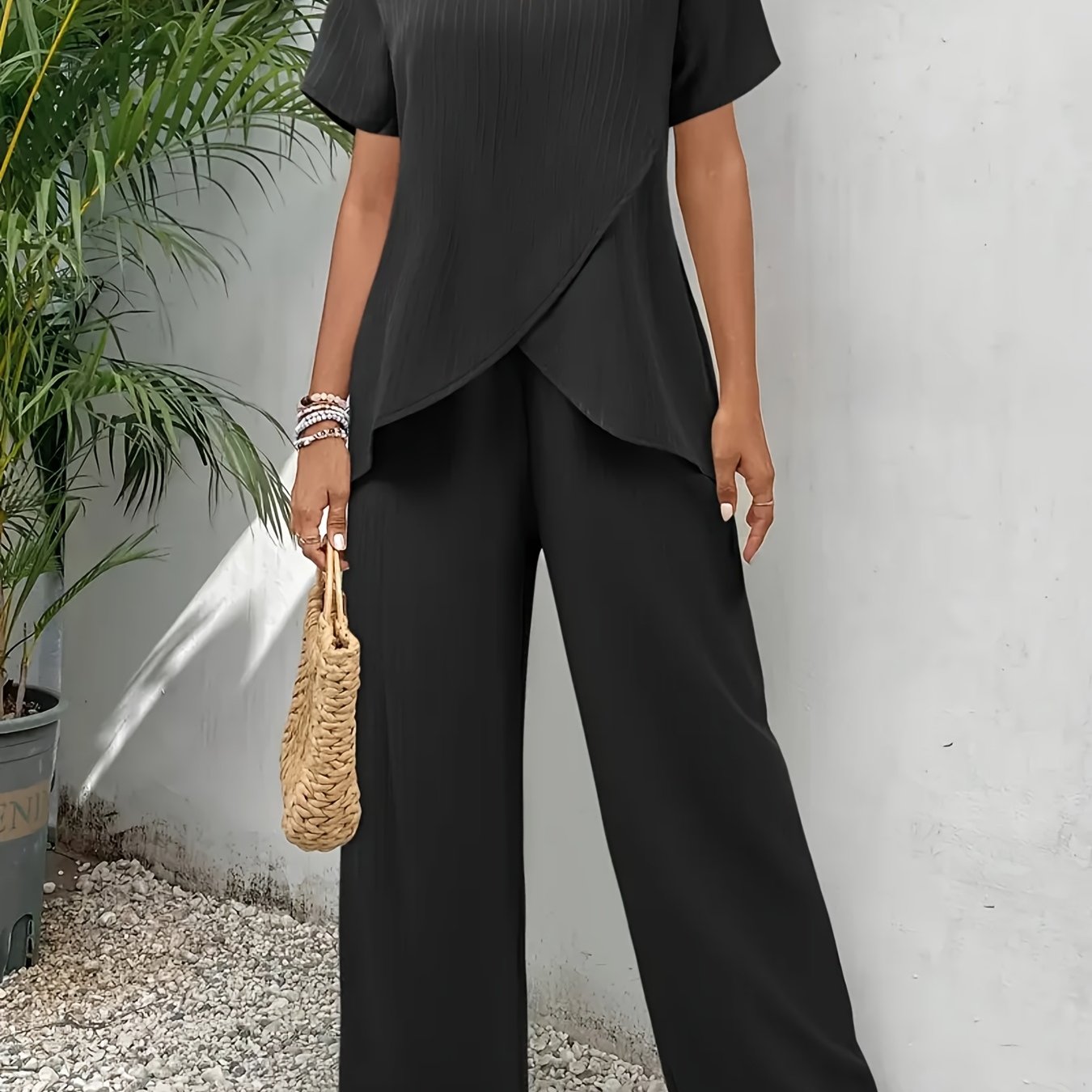 Solid color casual pants set, asymmetrical hem round neck short sleeve top and pants set, Women's clothing