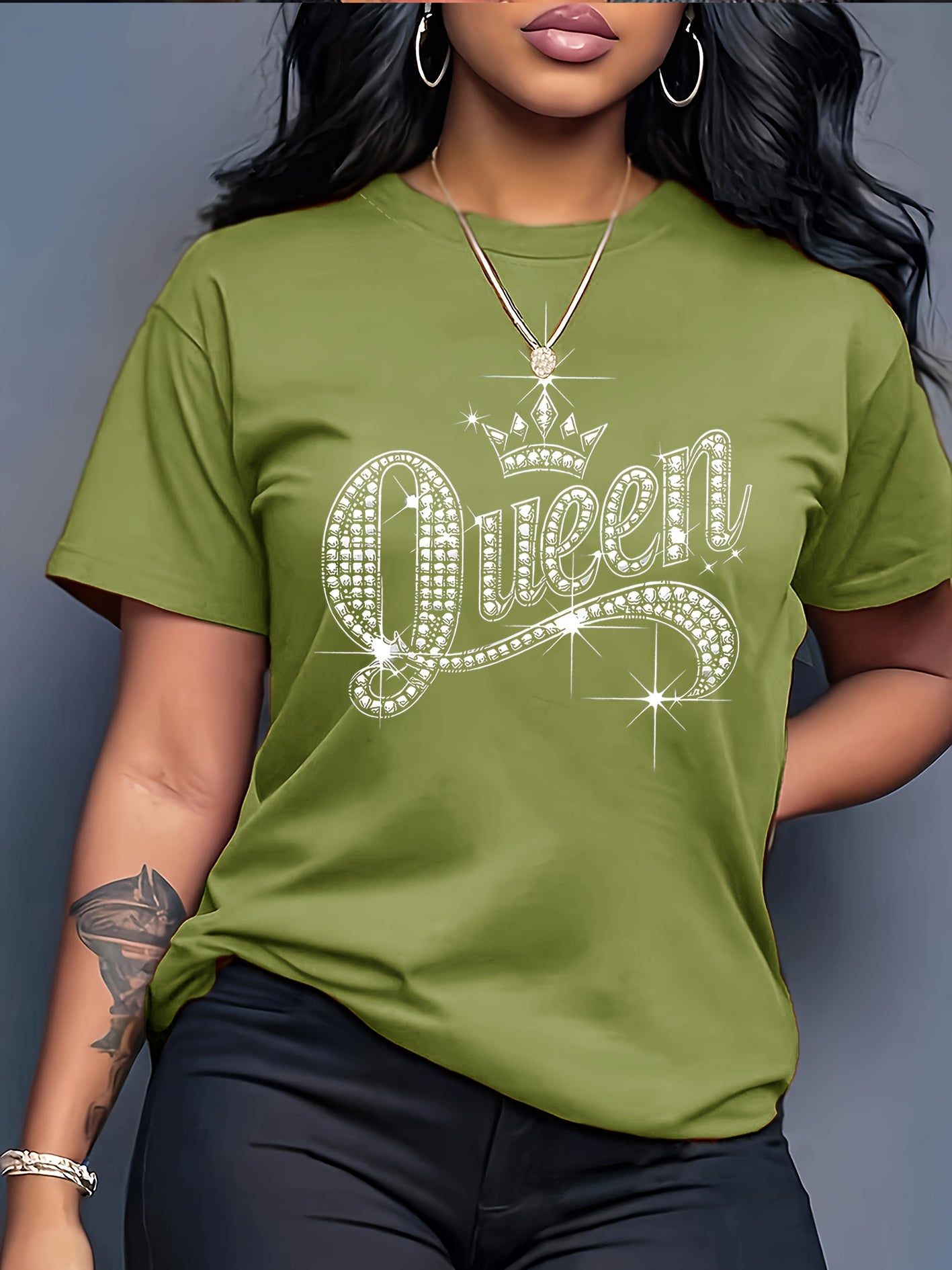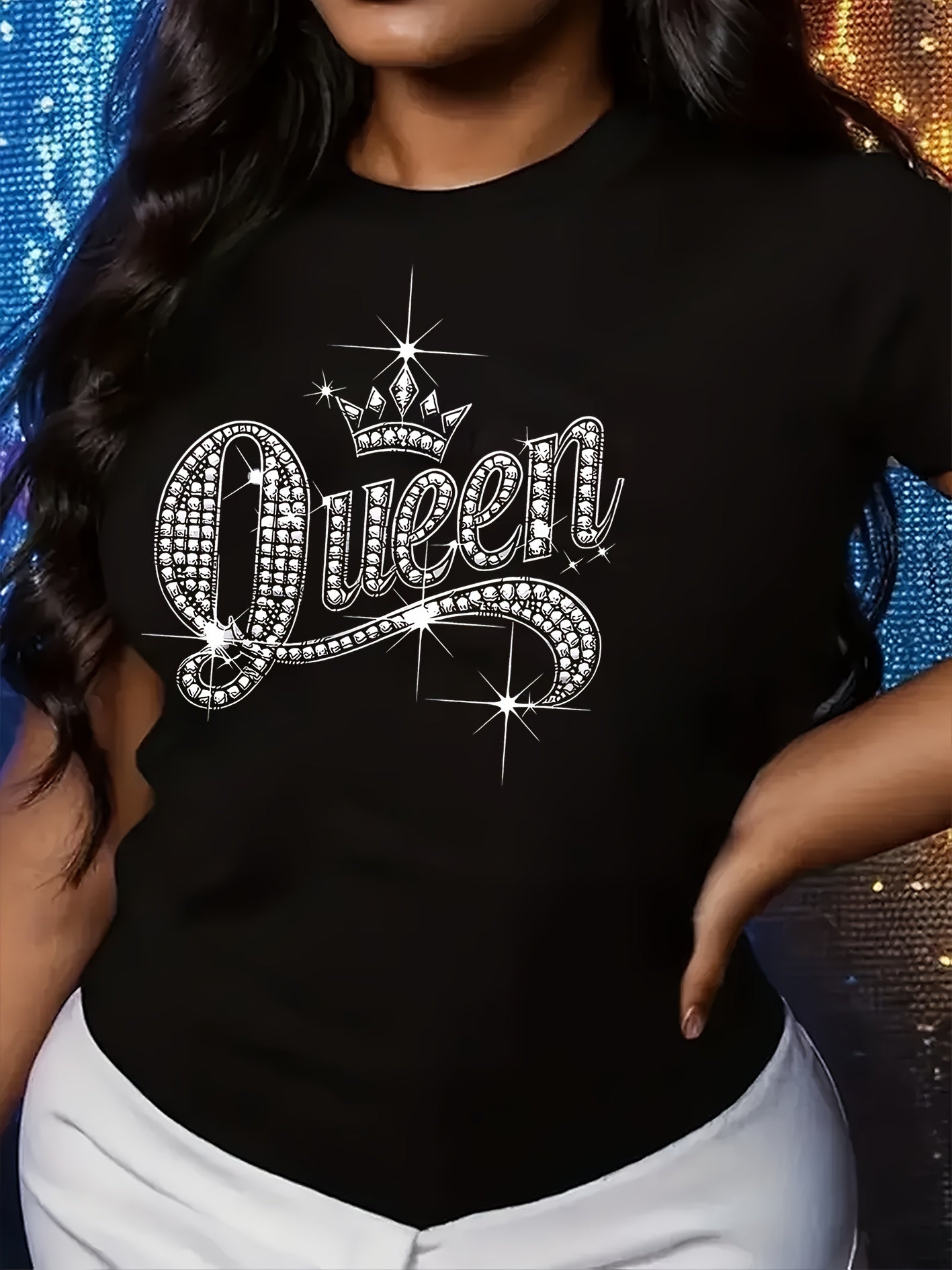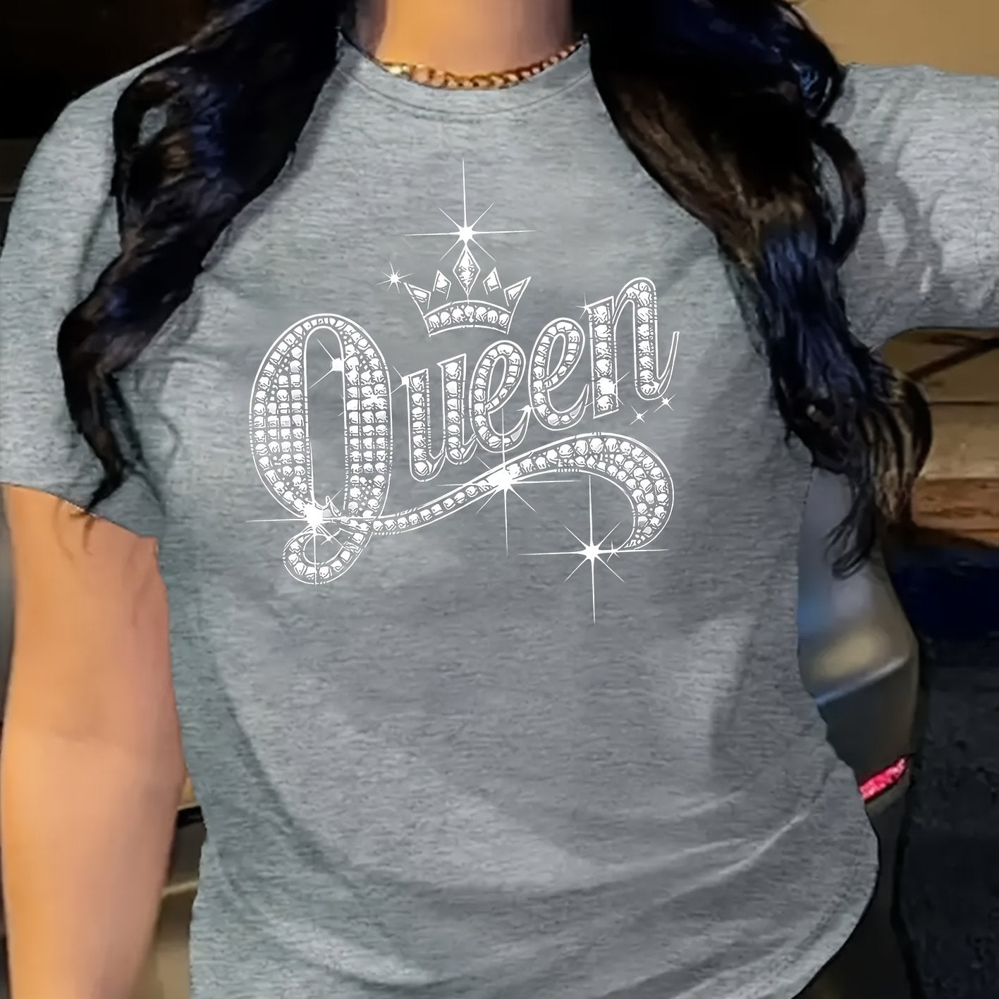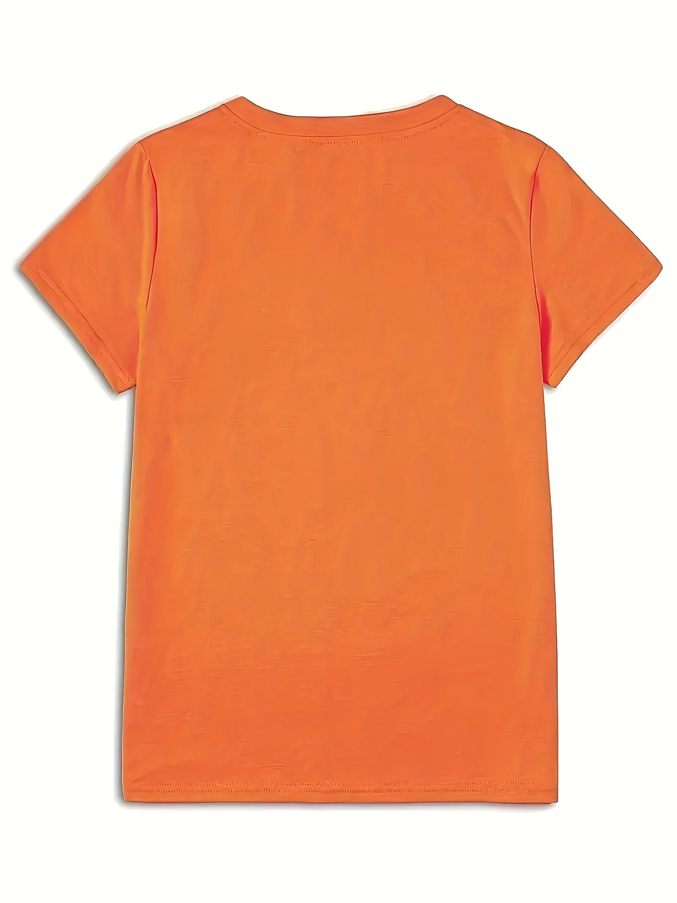 Sparkling Rhinestone Queen Crown Graphic Casual T-Shirt - Vibrant Orange Short Sleeve Round Neck Top with Medium Stretch, Machine Washable for Casual Attire & Parties, Cute T Shirts, Allseason Apparel, Party Wear, Mediumstret
