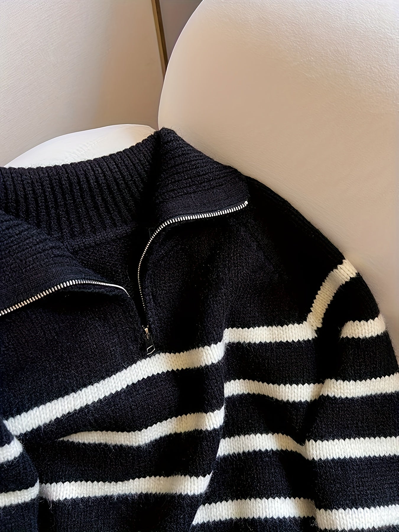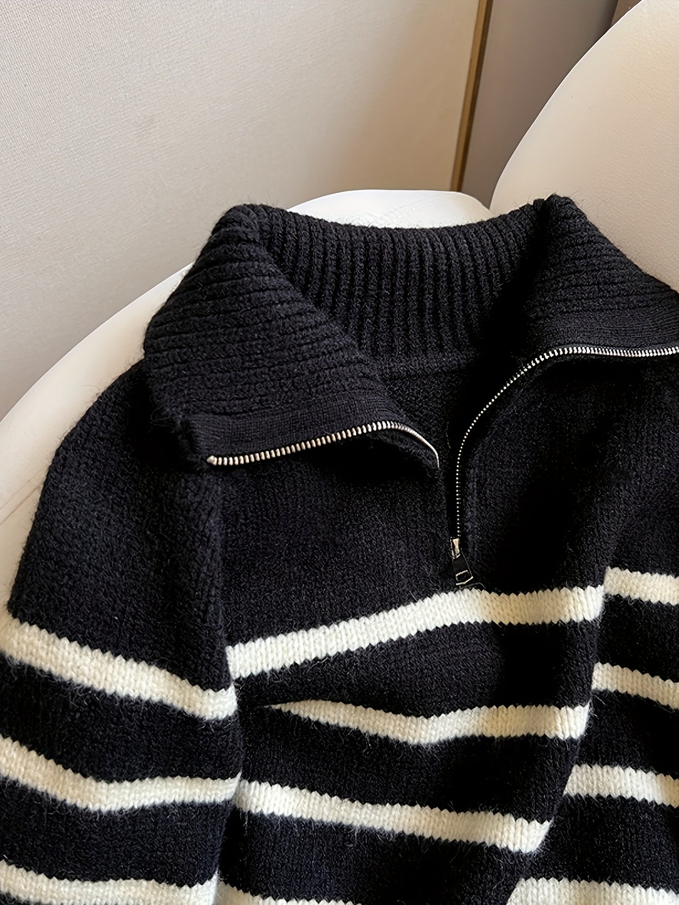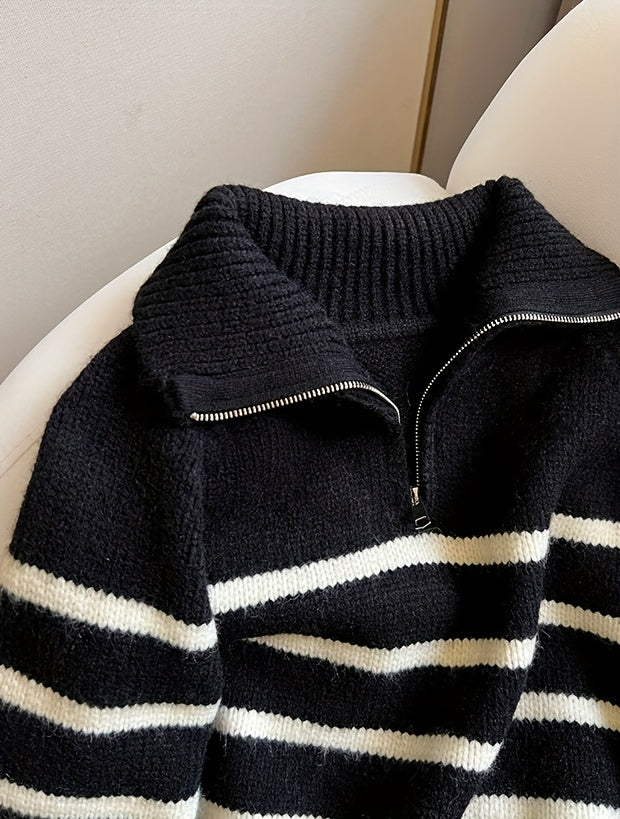 Striped Color Block Collared Sweater for Women Autumn Winter New Arrival Thick Half Zip Loose Soft Knit Top