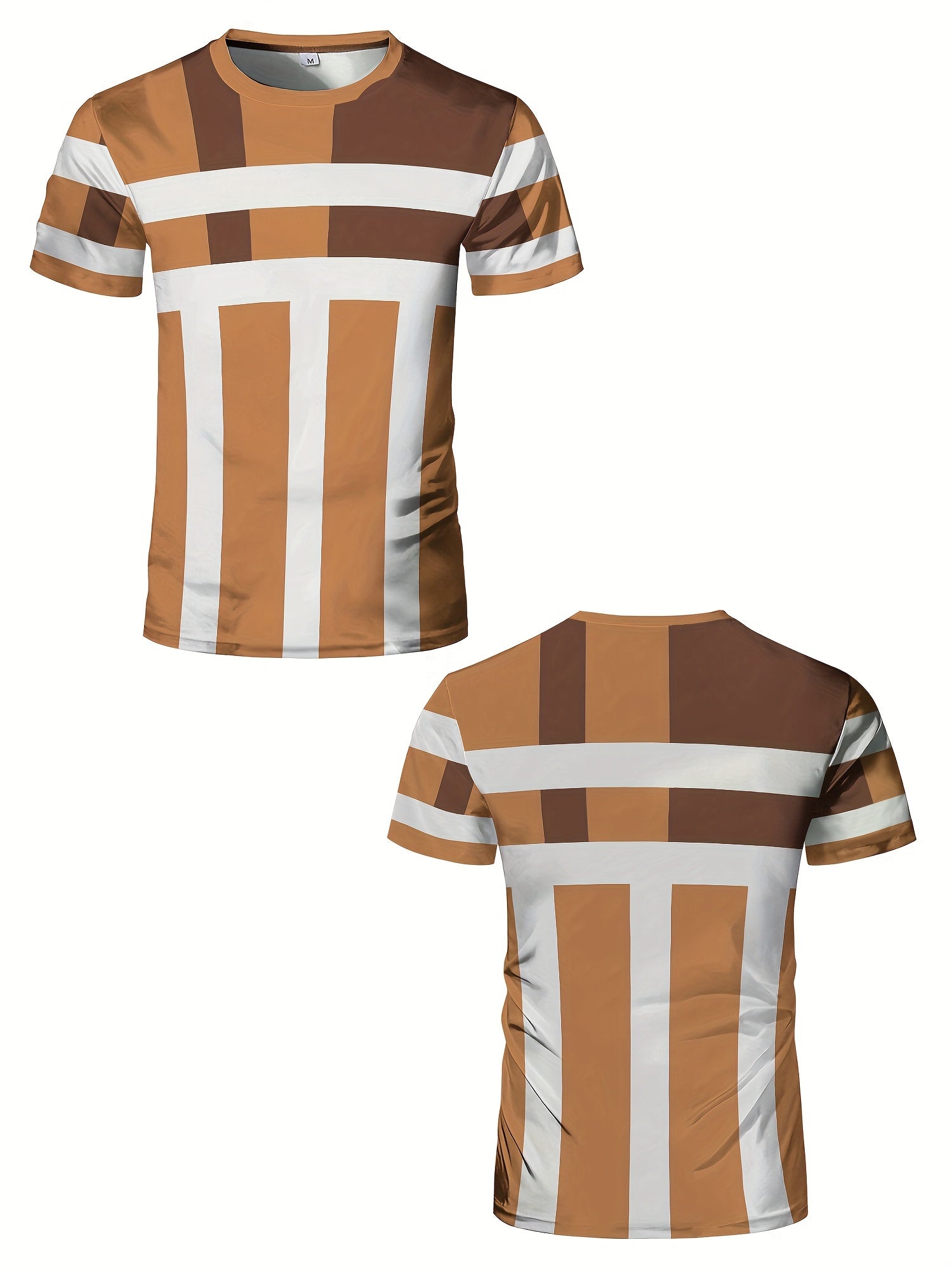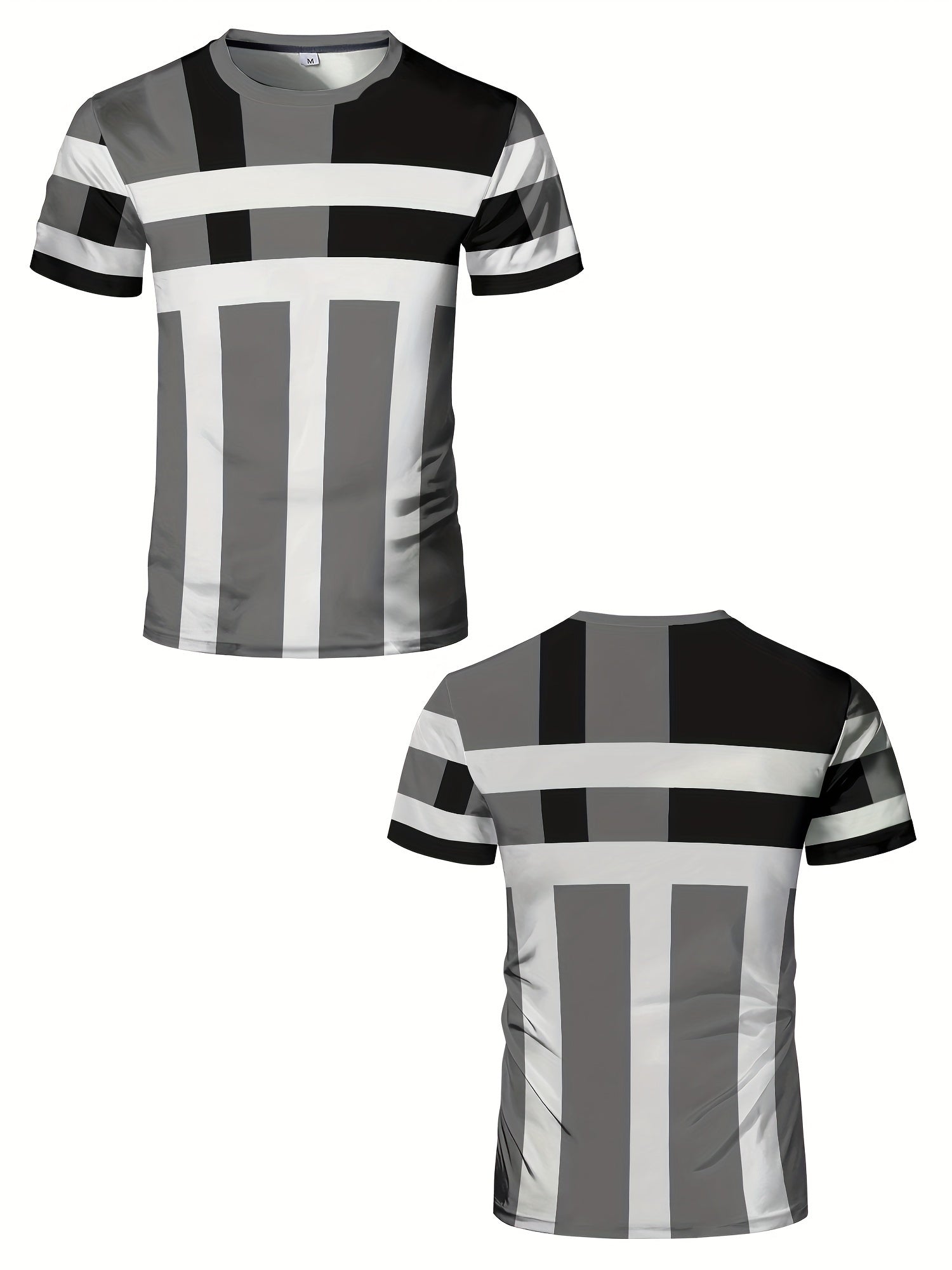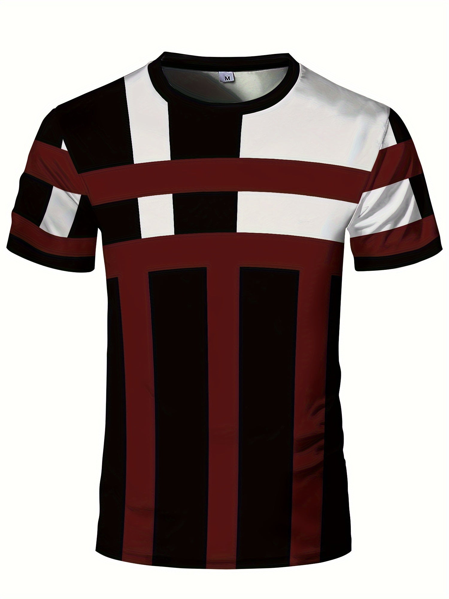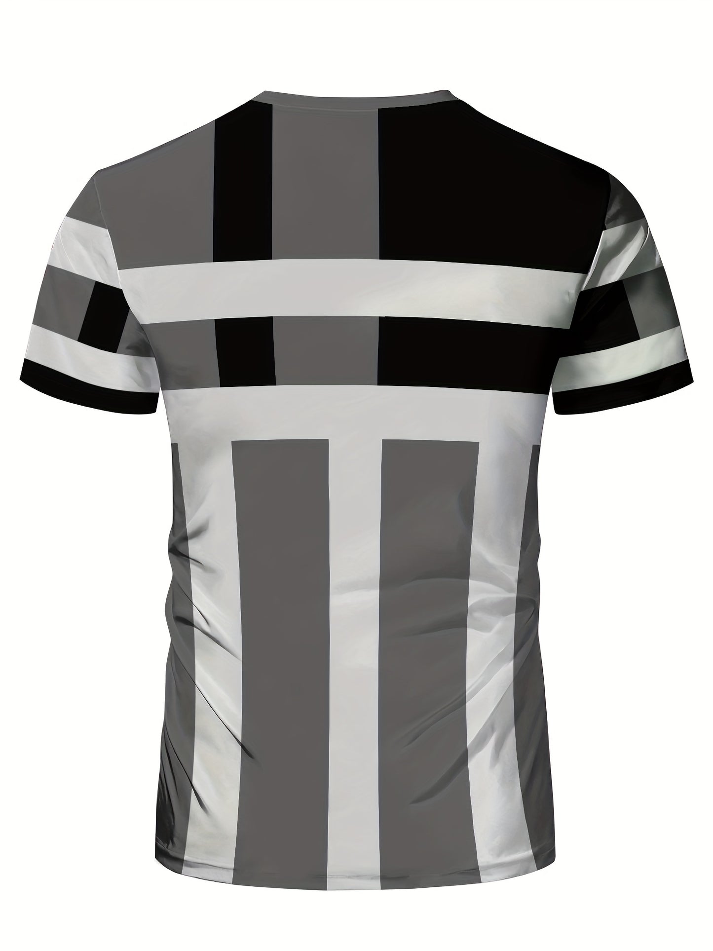 Striped Patchwork Design Pattern Print, Men'S Sports Fashion, Geometric Print High Elasticity Tight Fit Short Sleeved Round Neck T-Shirt, Summer Fitness, Training And Fitness Wear Quick Drying Sports Top with Coolness