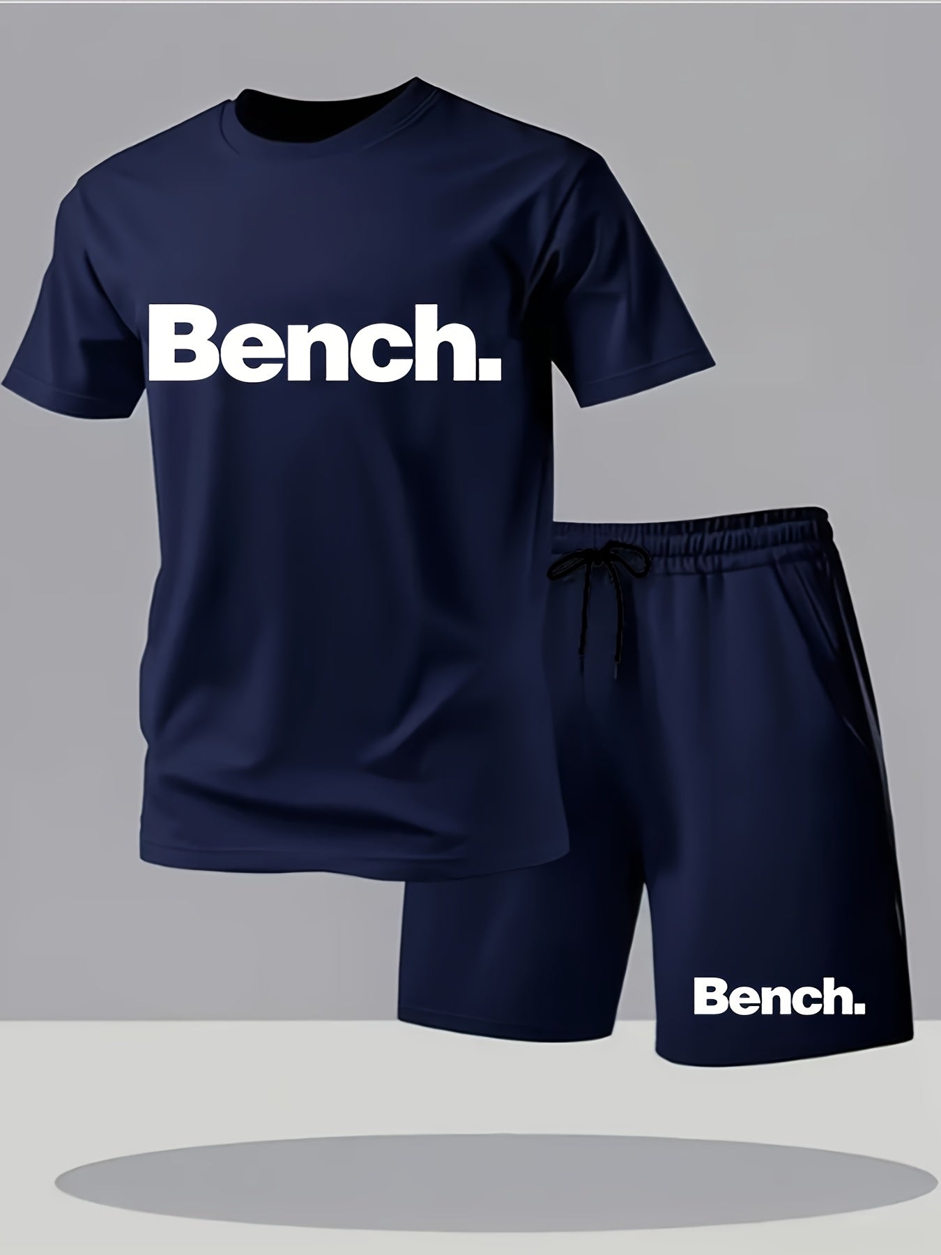 Summer Men'S Casual Sports Short Sleeve T-Shirt and Shorts Set, Knitted Polyester Fabric, Comfortable Breathable, Bench. Letter Print Design - 2pcs