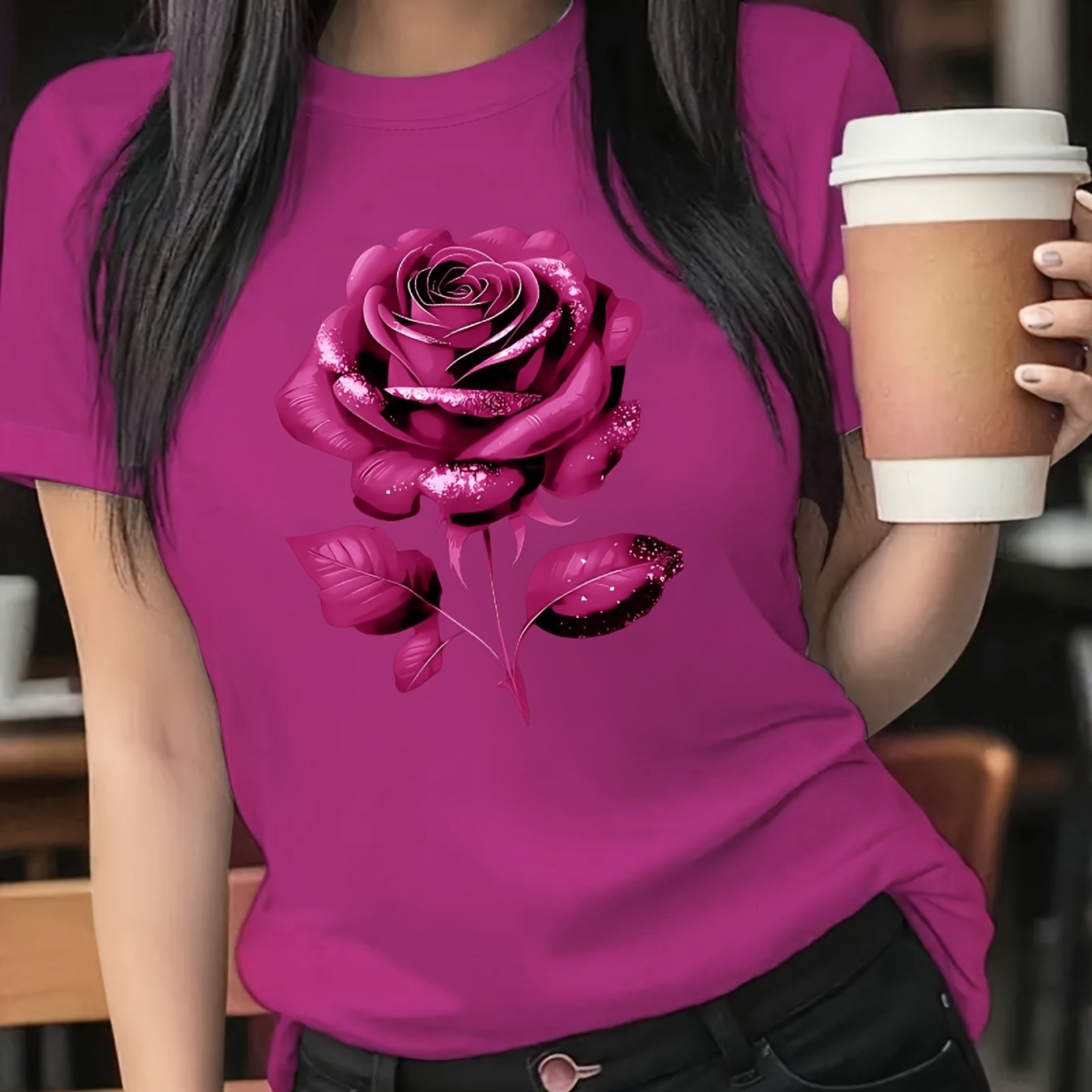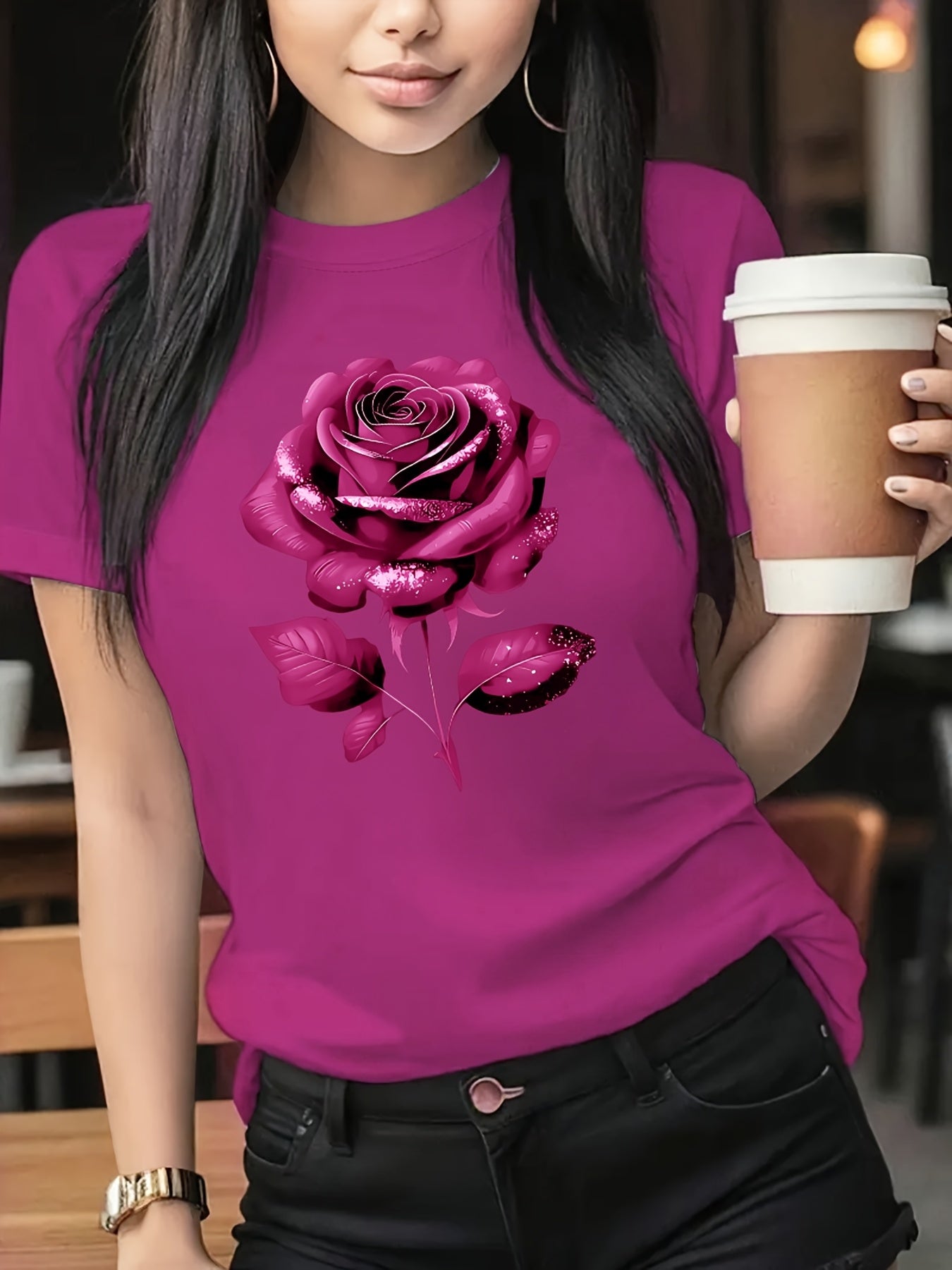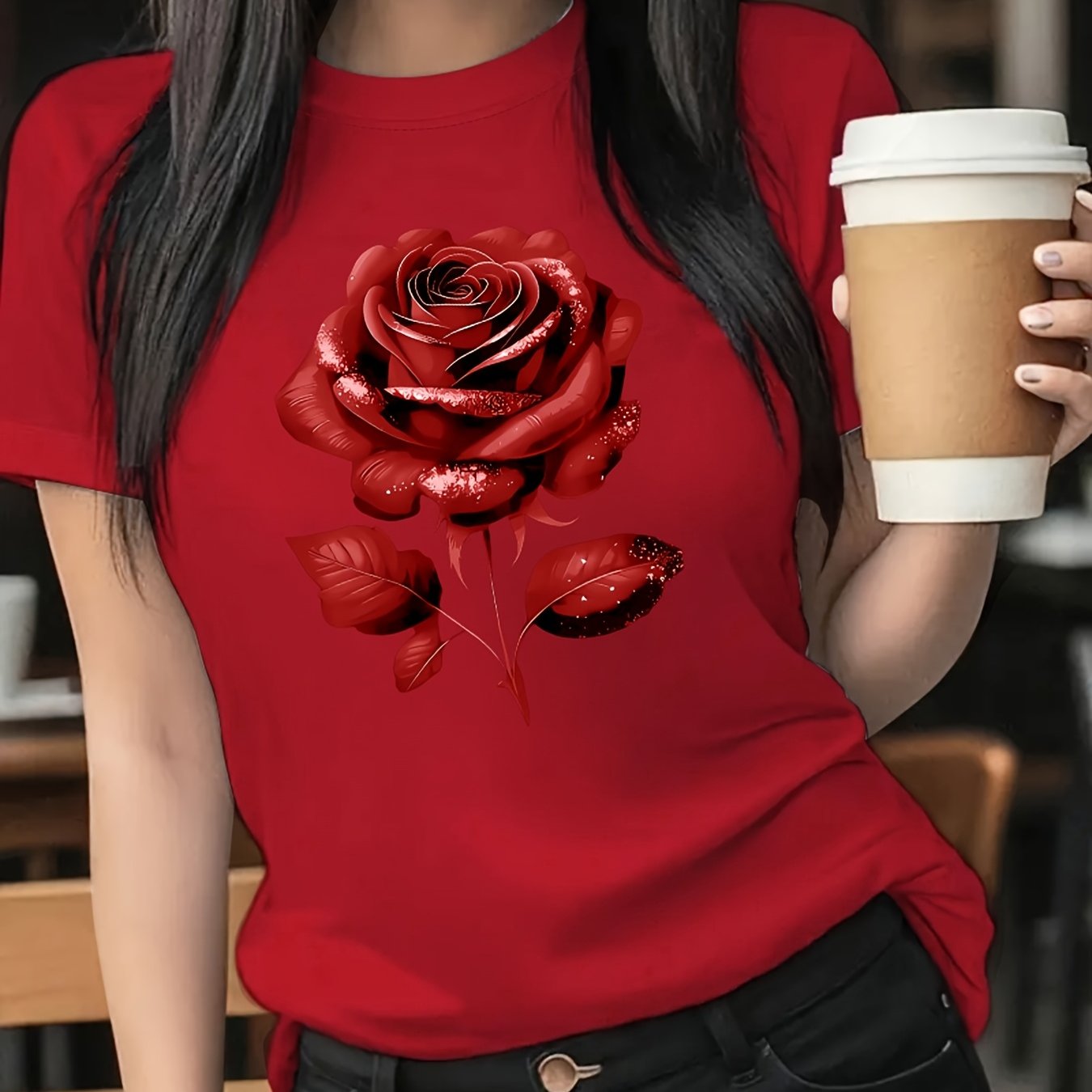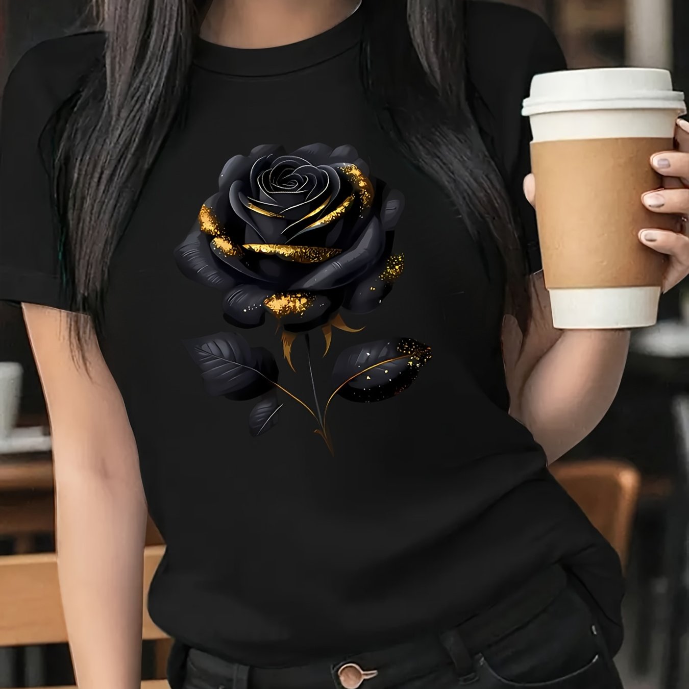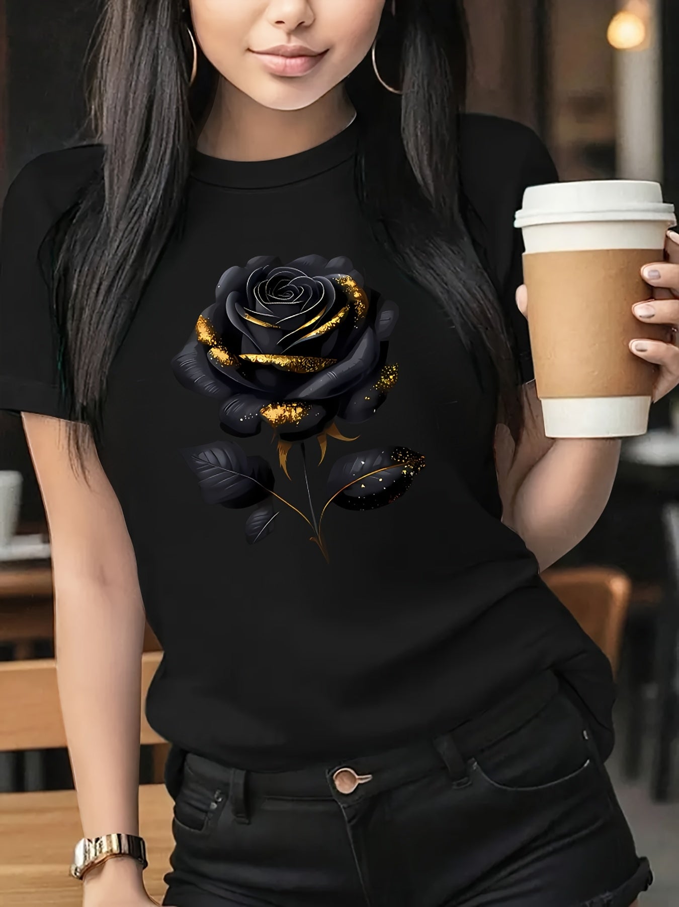 The Black Roseprint t-shirt, short sleeve crew neck casual top for summer & spring, Women's clothing gift