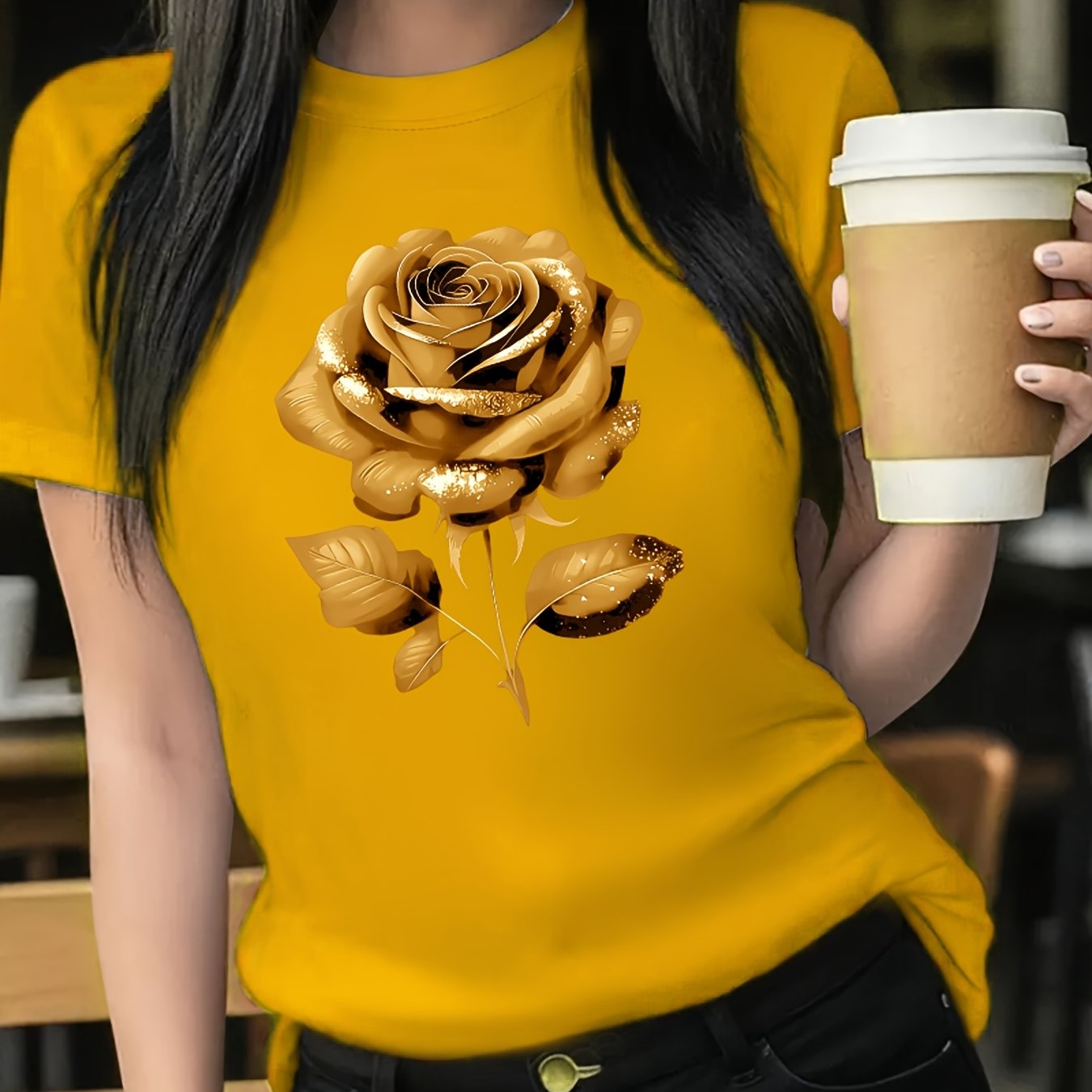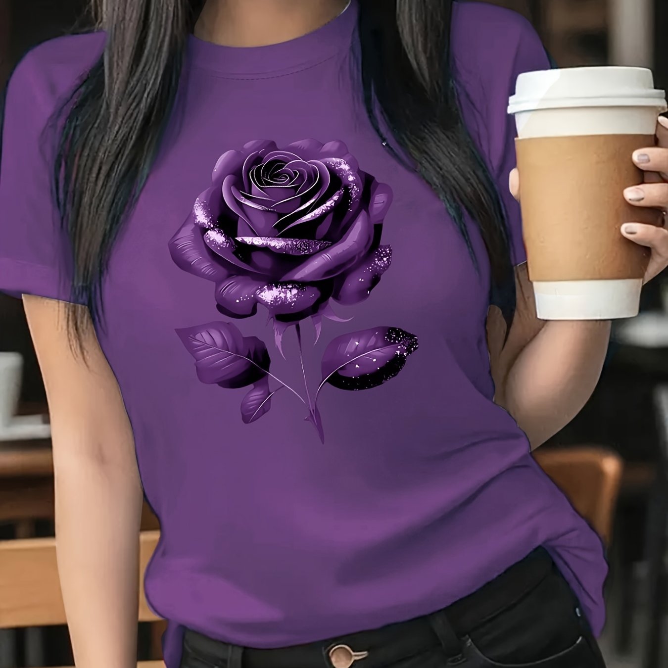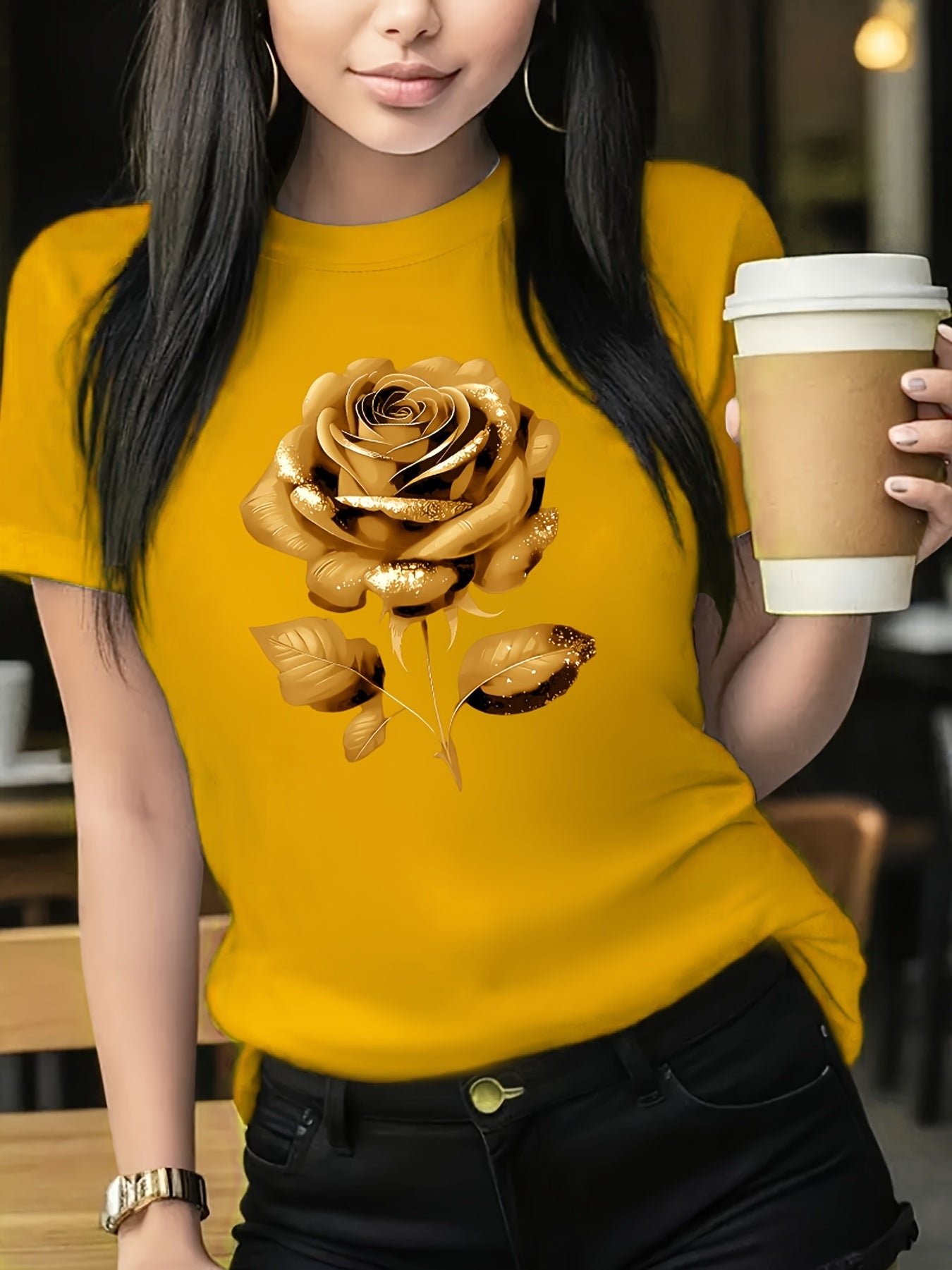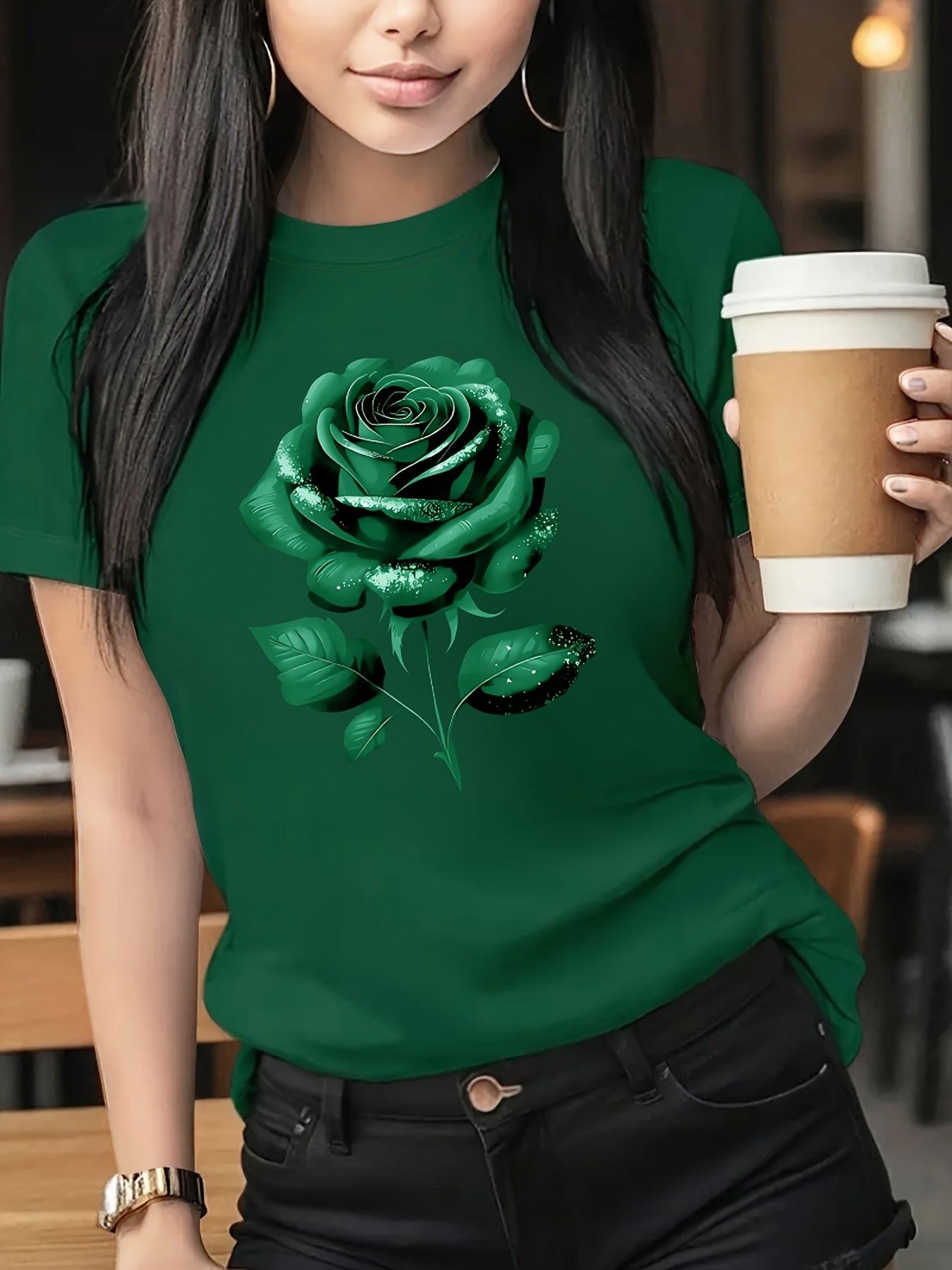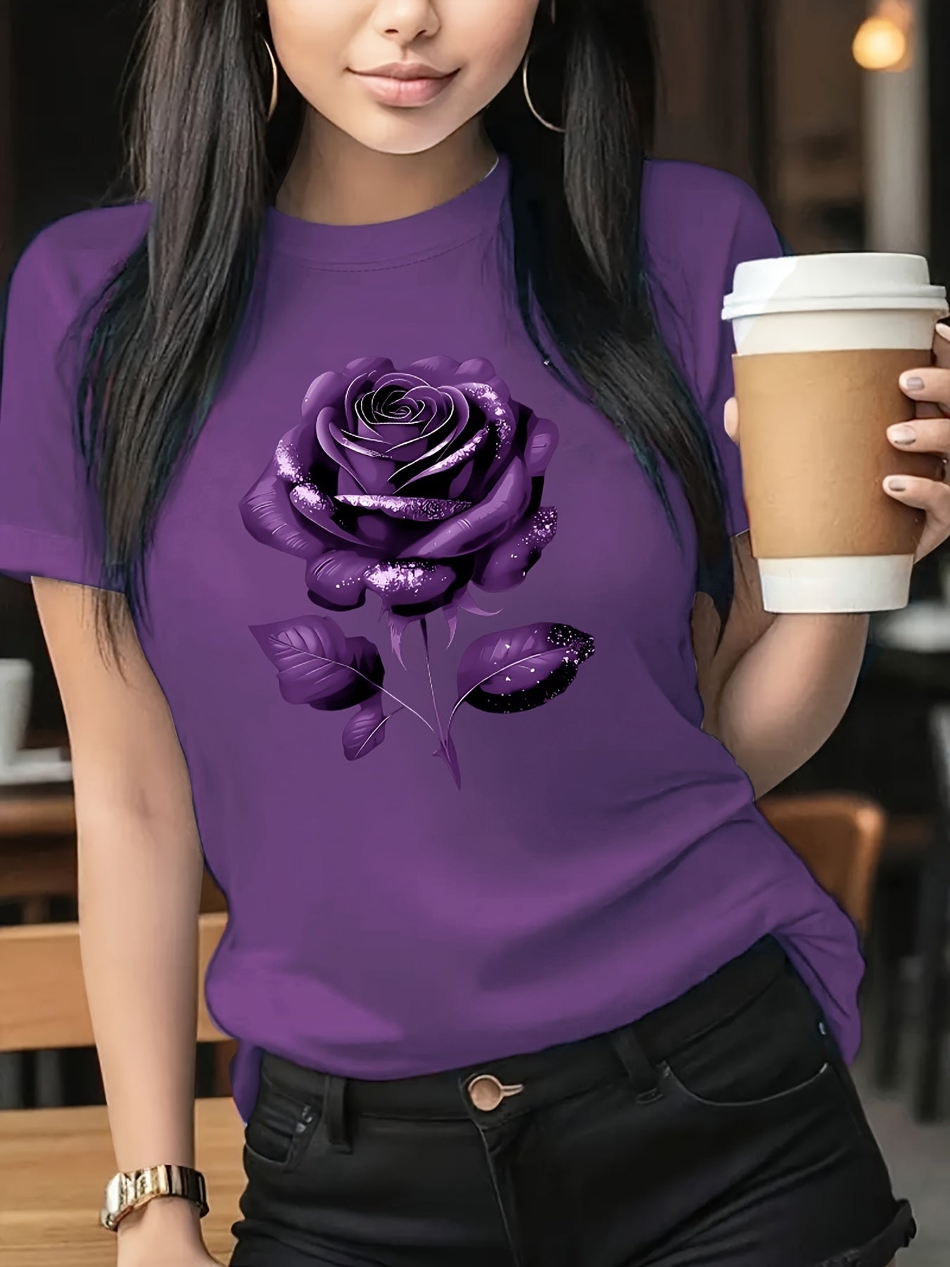 The Black Roseprint t-shirt, short sleeve crew neck casual top for summer & spring, Women's clothing gift