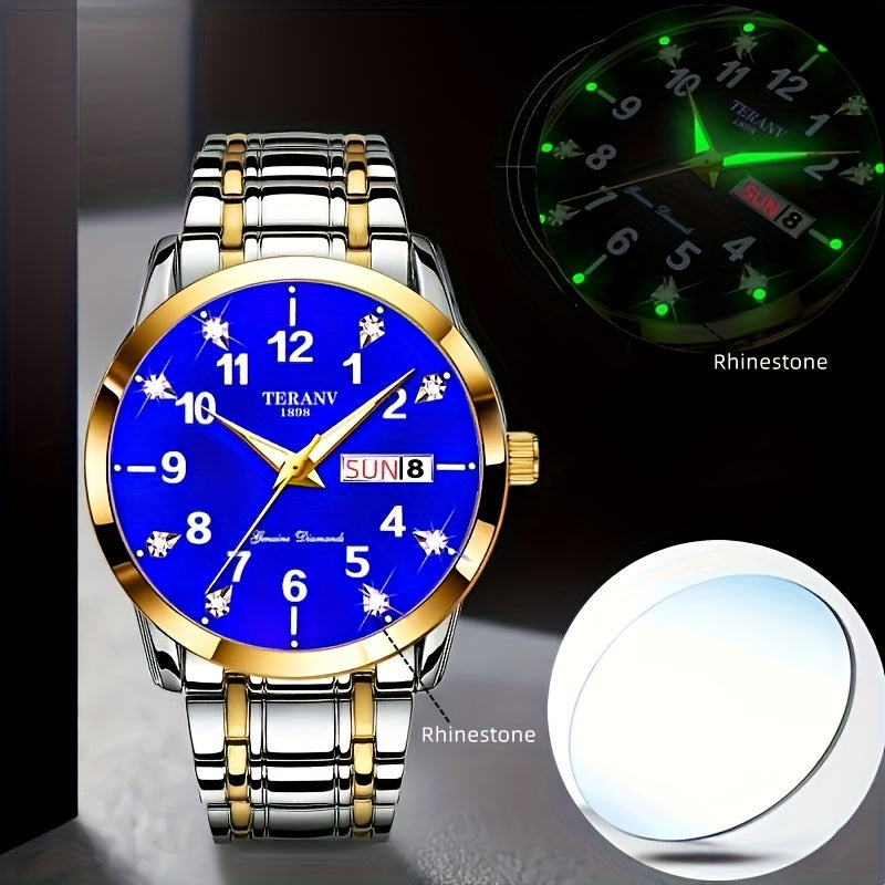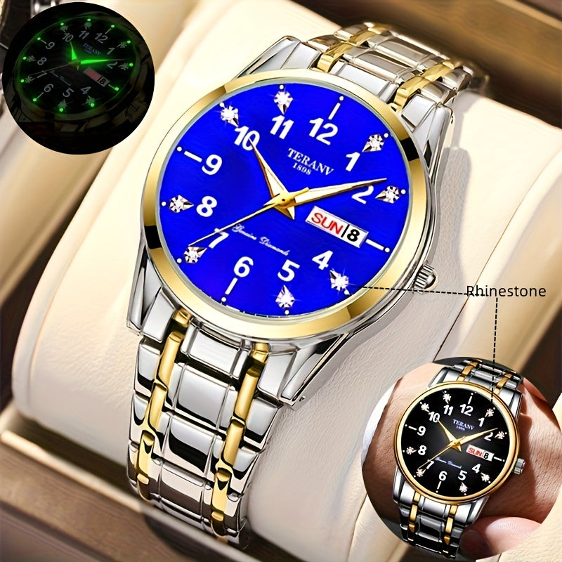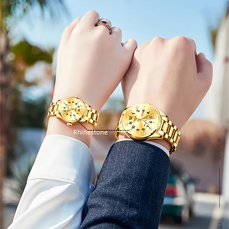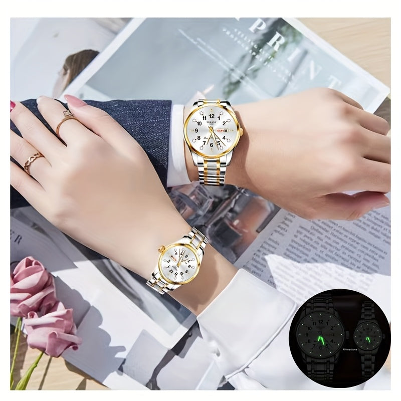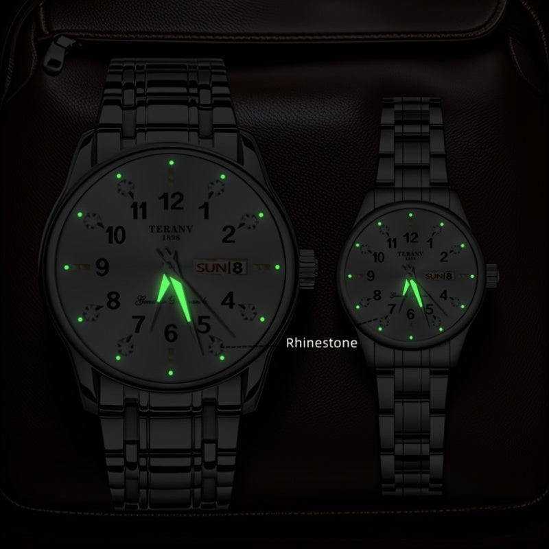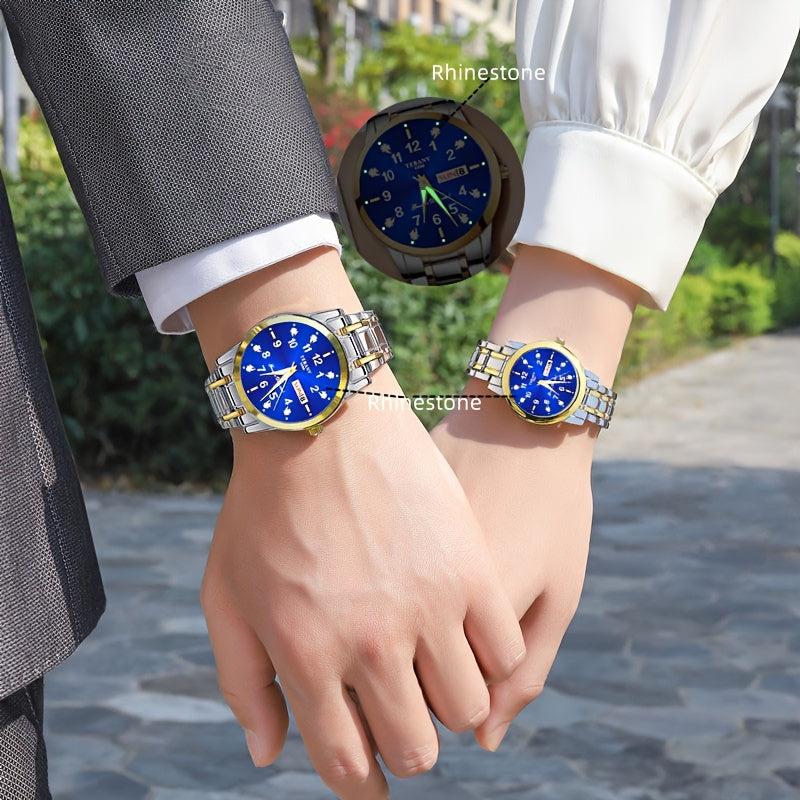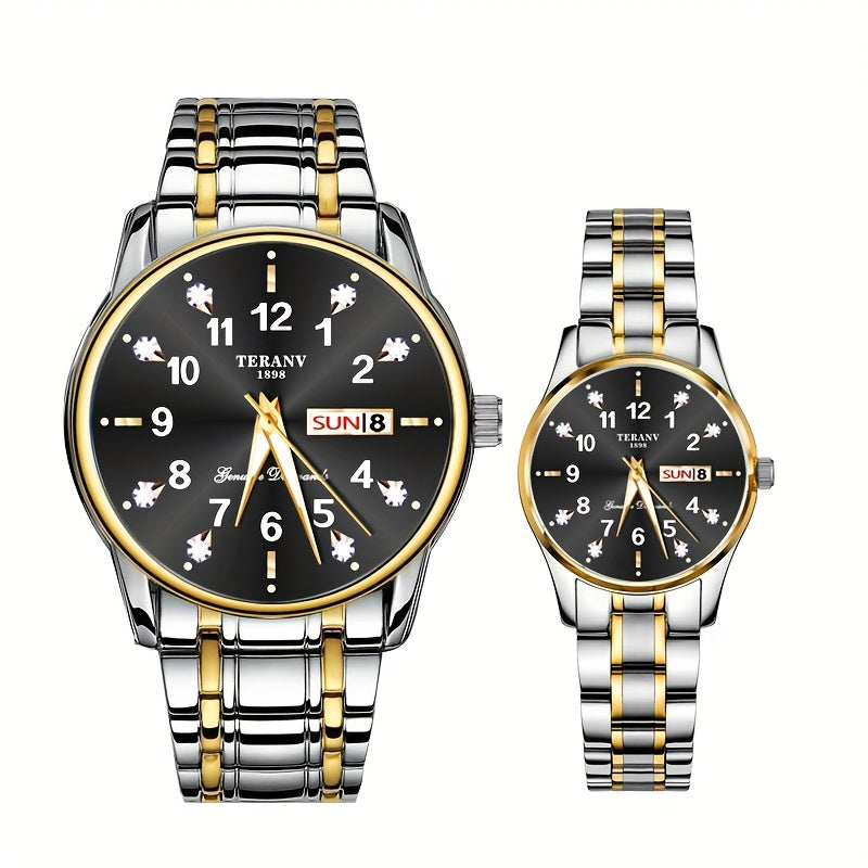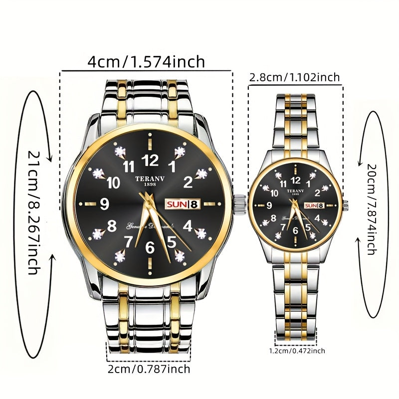 Two Stylish Digital Round Dial Couple'S Quartz Watches - IPX7 Waterproof, Luminous, Dual Calendar, Date and Day/Week Display, Alloy Strap Business Watches, Suitable for Women and Men, Valentine'S Day Gift Wristwatches