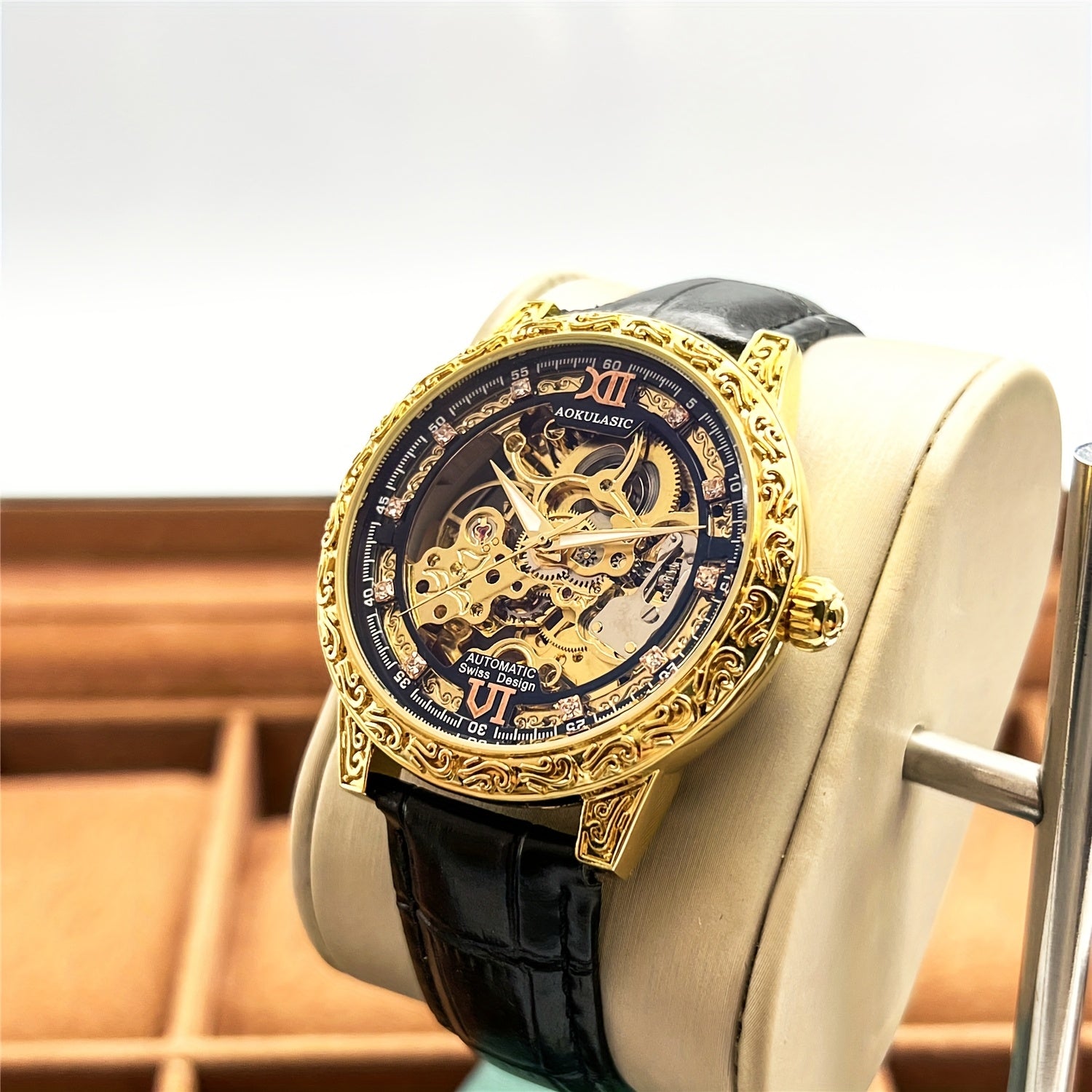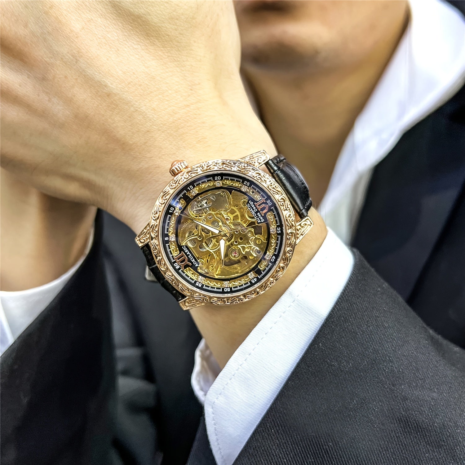 Vintage Hollow Carved Automatic Mechanical Men'S Watch, Fashionable Luxury Men'S Watch, High-end Thickened Mechanical Style Hip-Hop Party Wristwatch, Without Battery