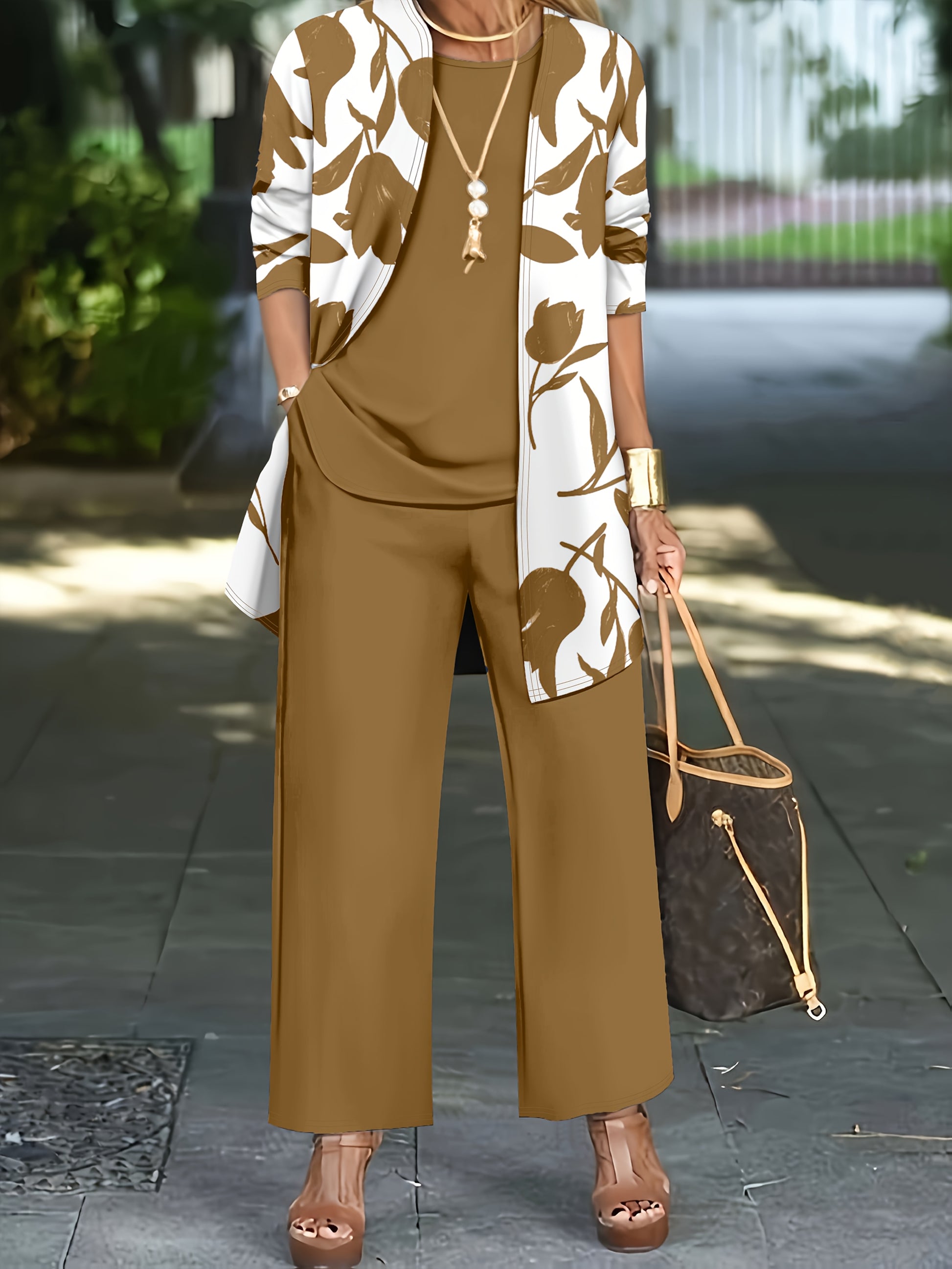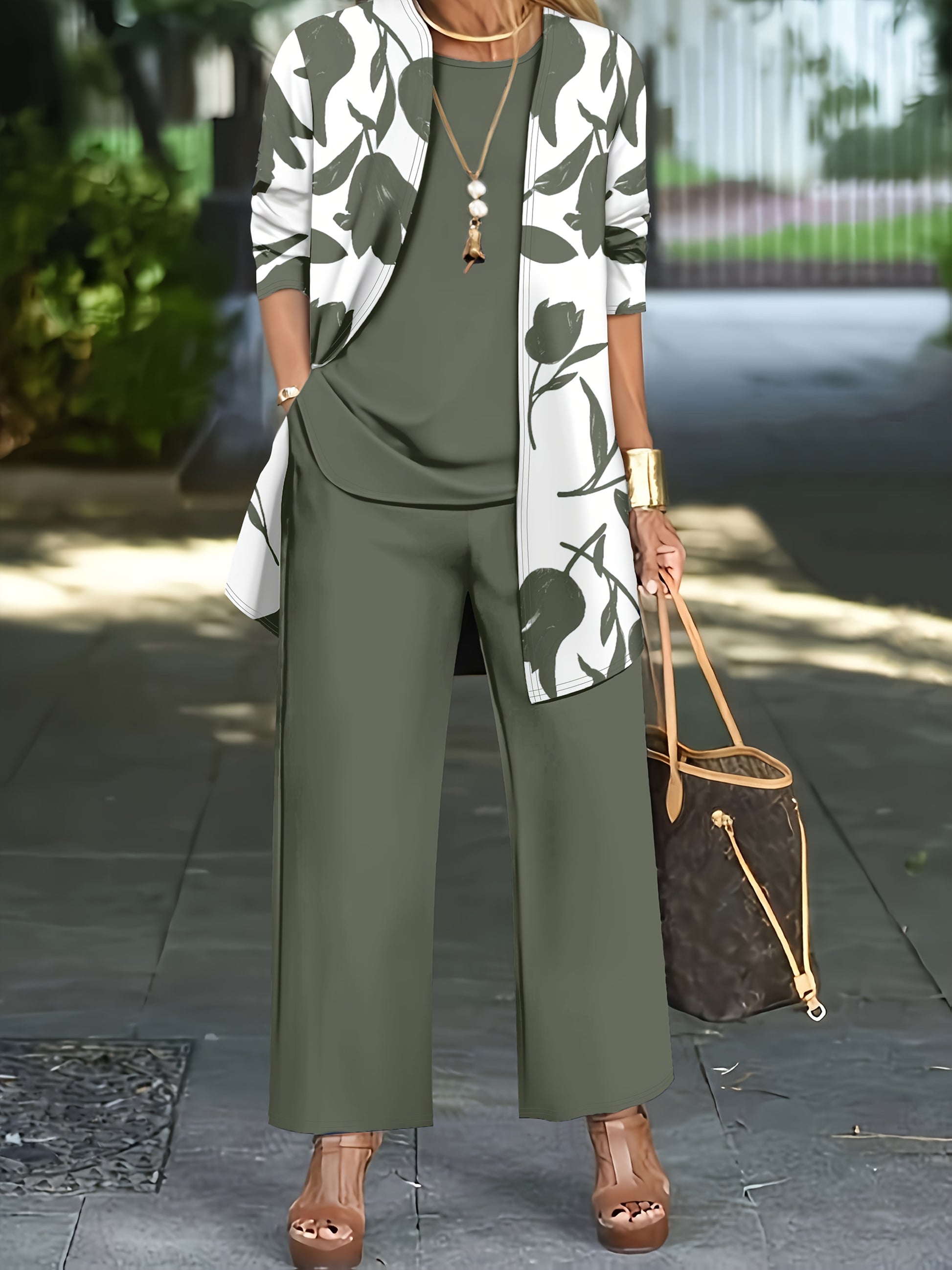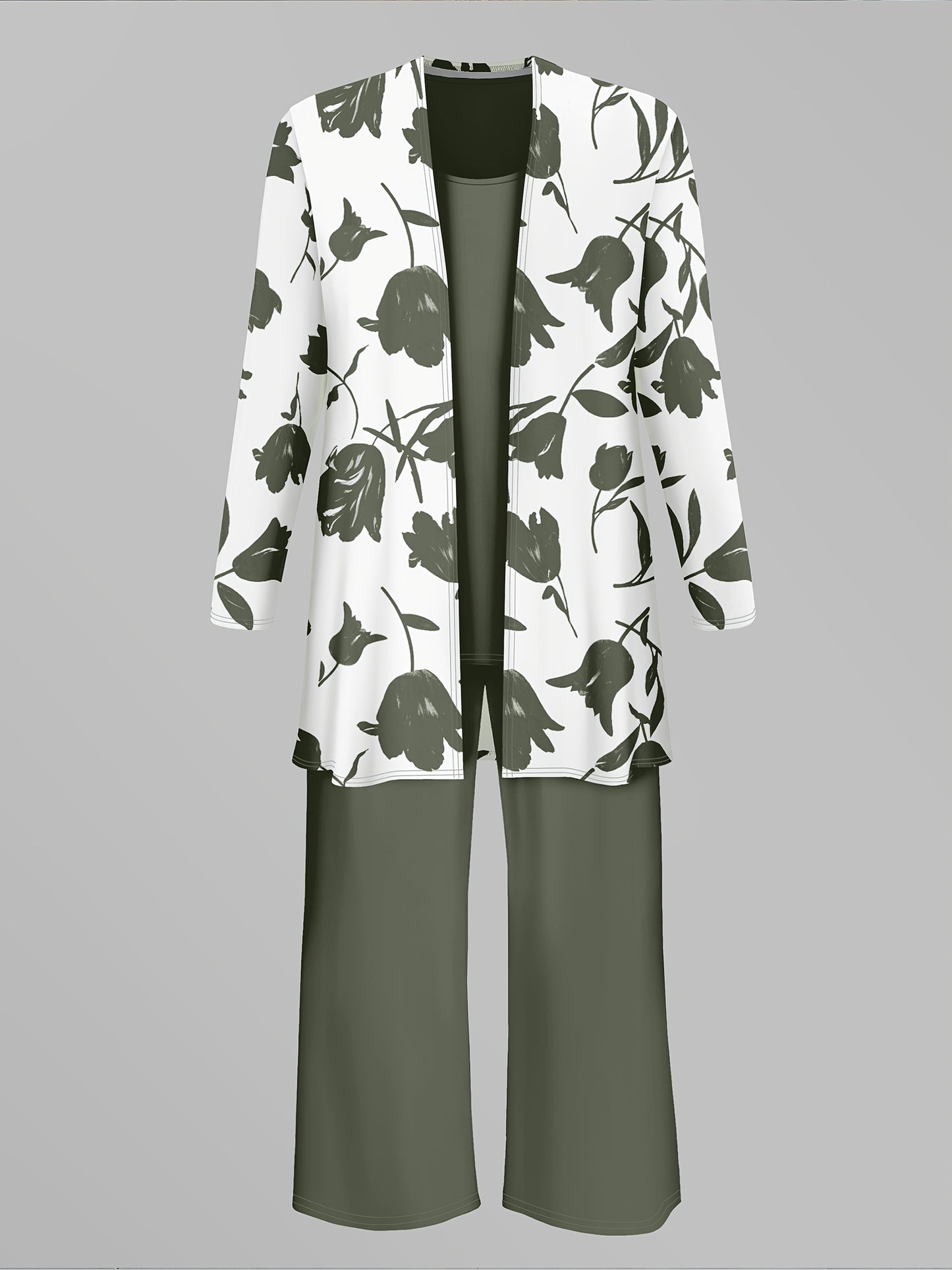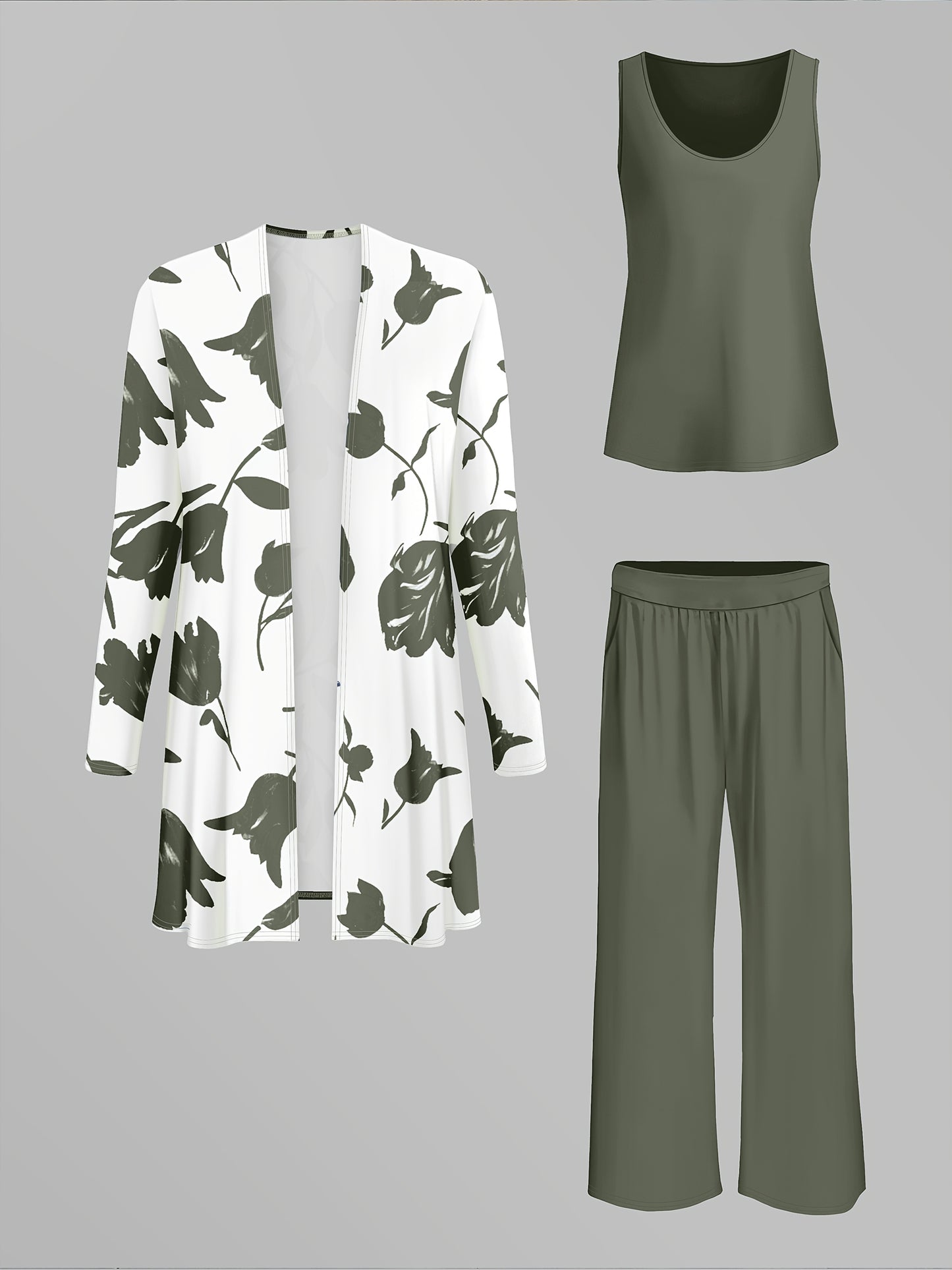 Women'S 3pcs Set, Floral Print Cardigan with Solid Color Cami and Wide-Leg Pants Casual Outfit