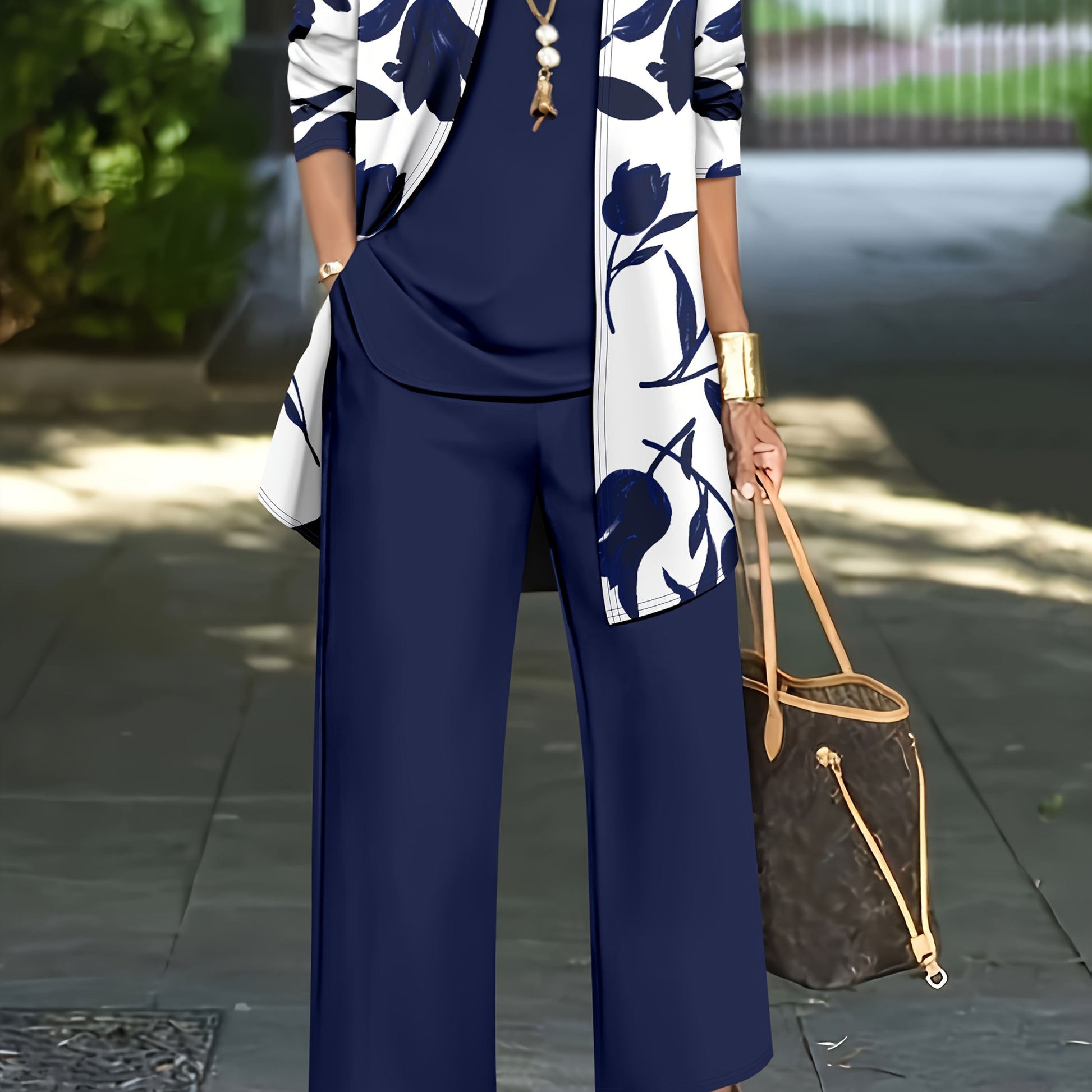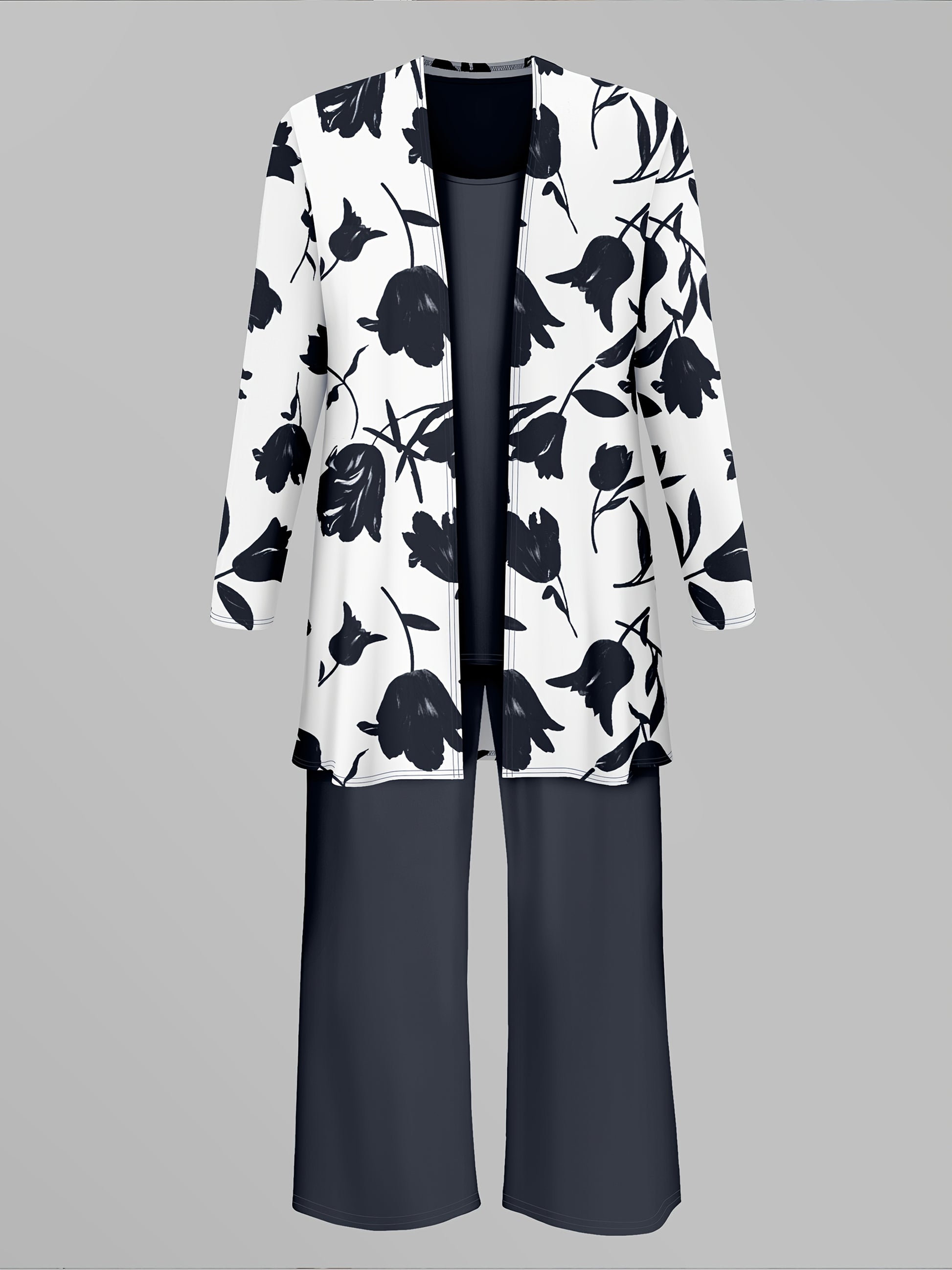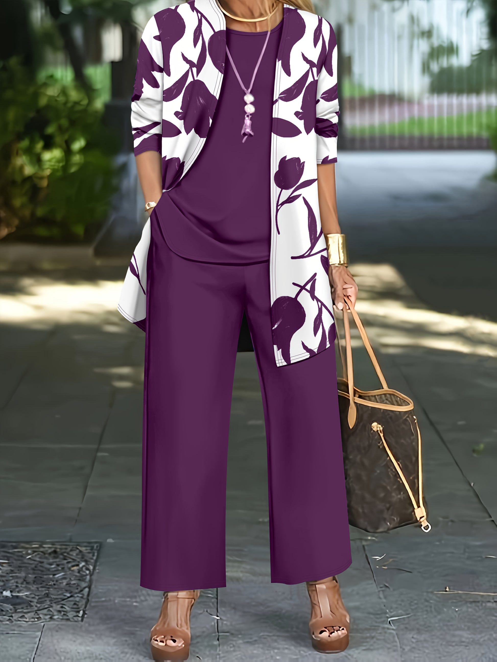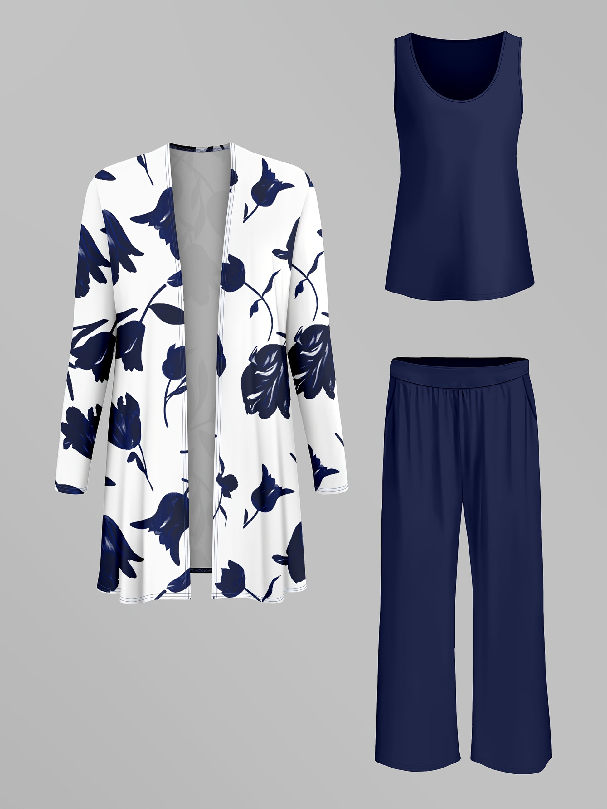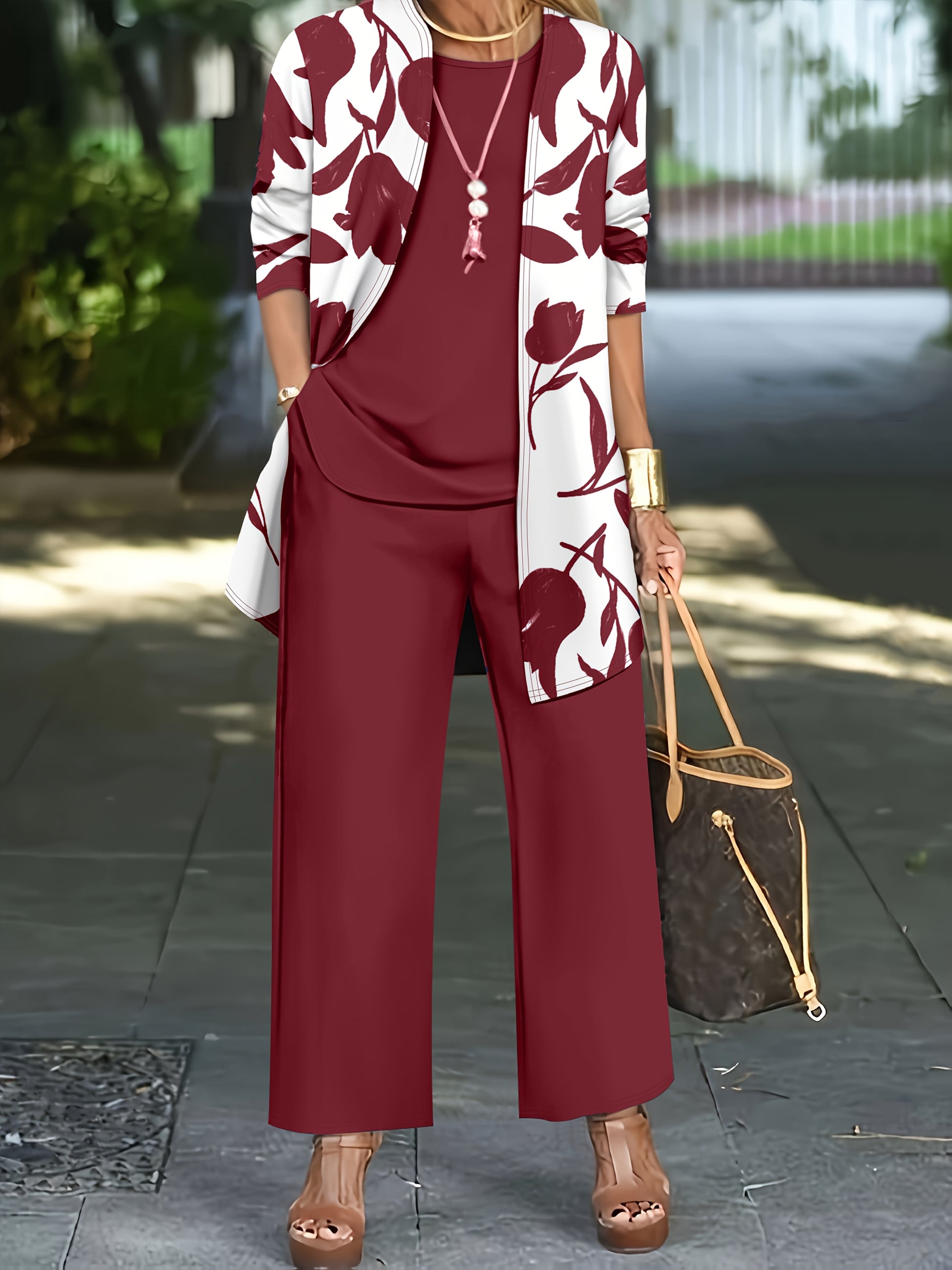 Women'S 3pcs Set, Floral Print Cardigan with Solid Color Cami and Wide-Leg Pants Casual Outfit
