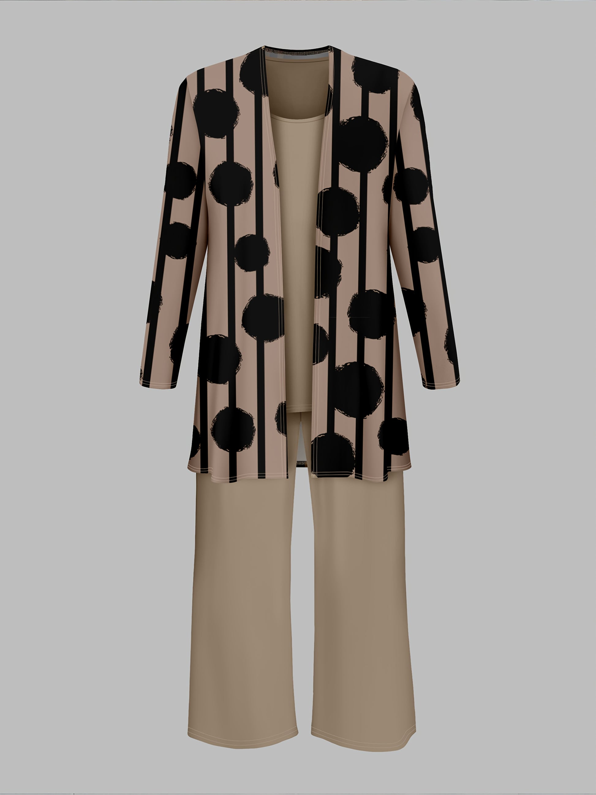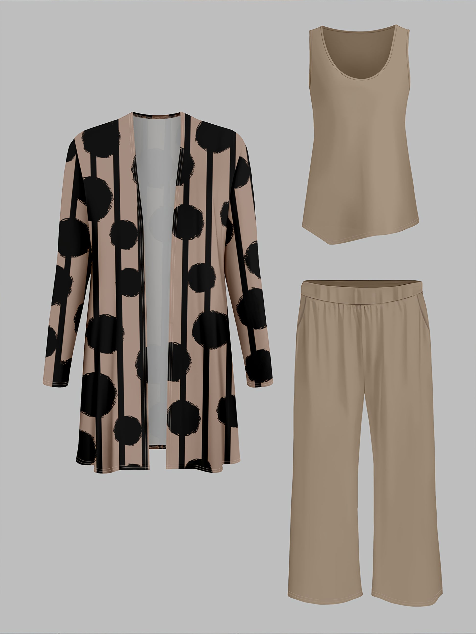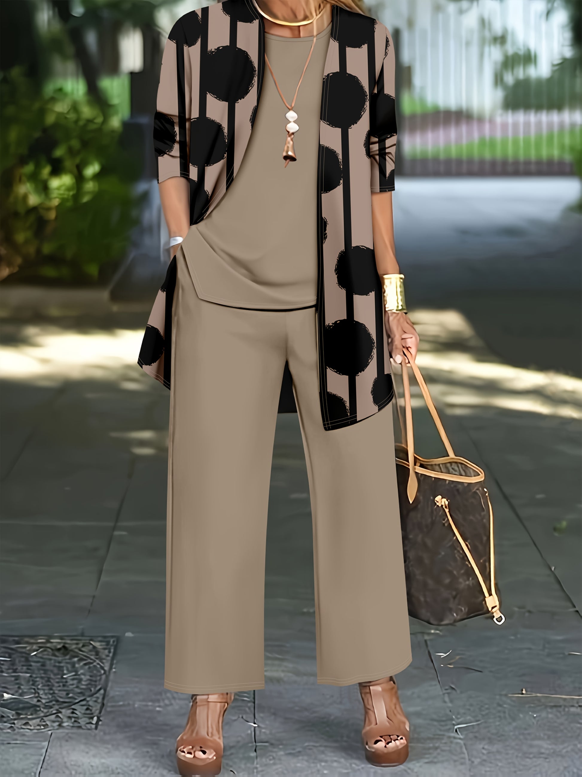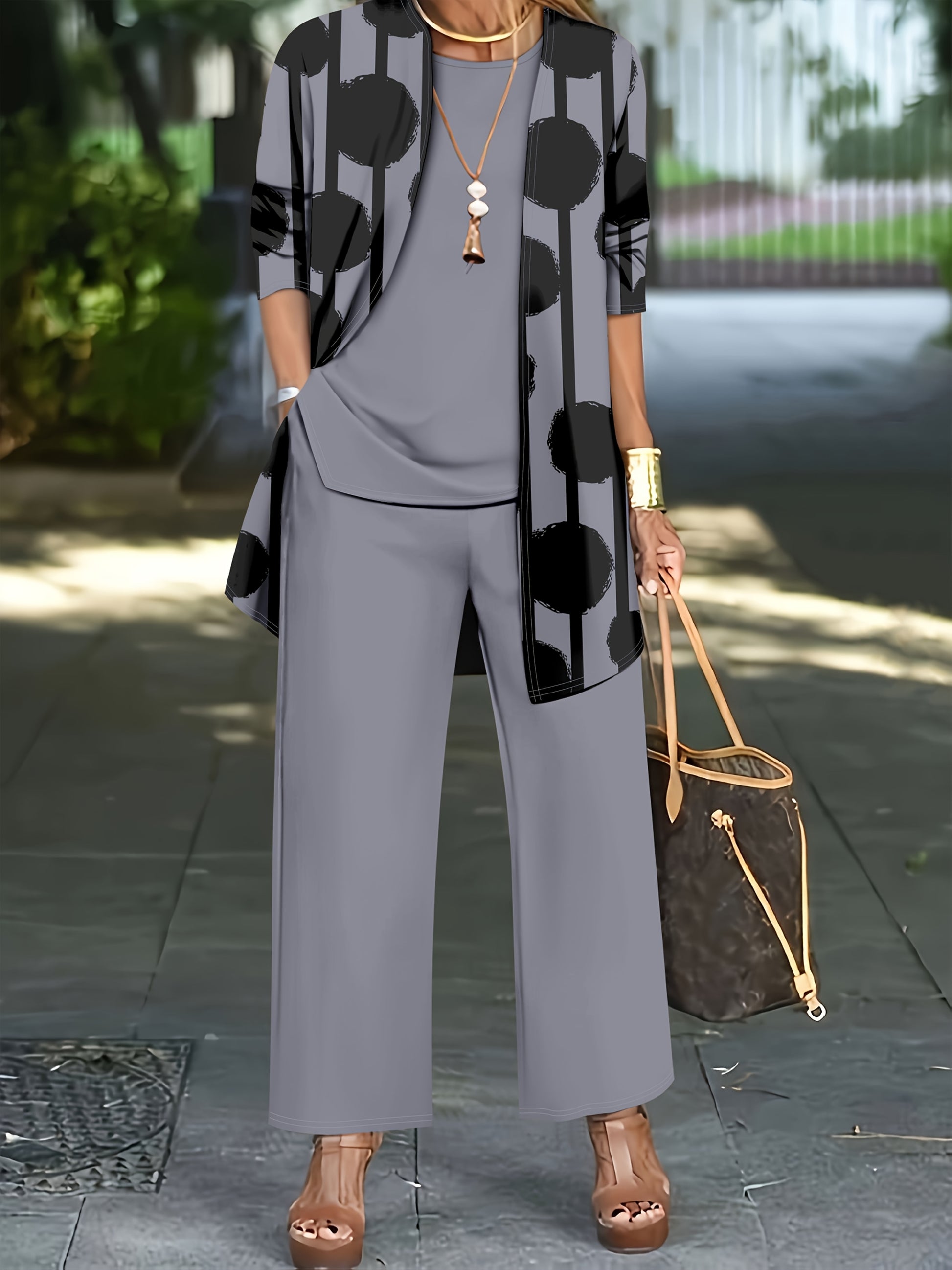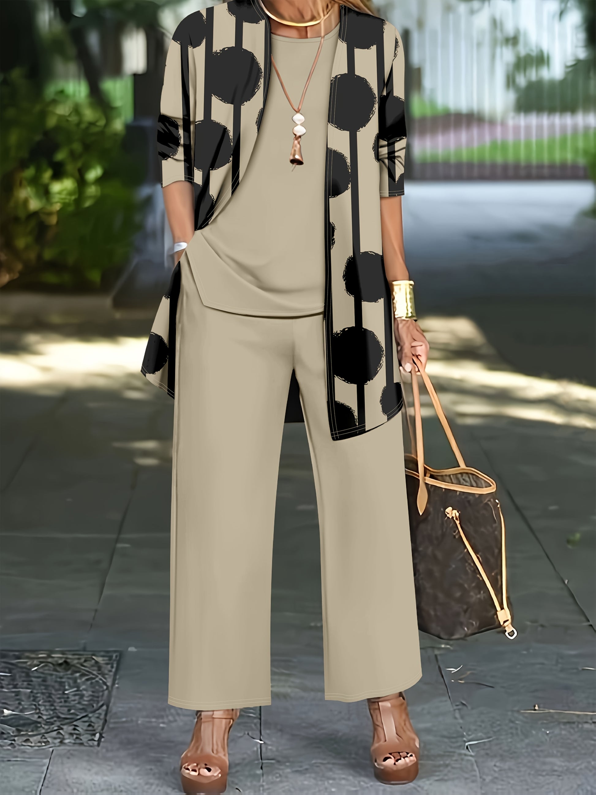 Women'S 3pcs Set, Polka Dot Print Cardigan & Solid Color Vest Casual Pants Daily Outfit