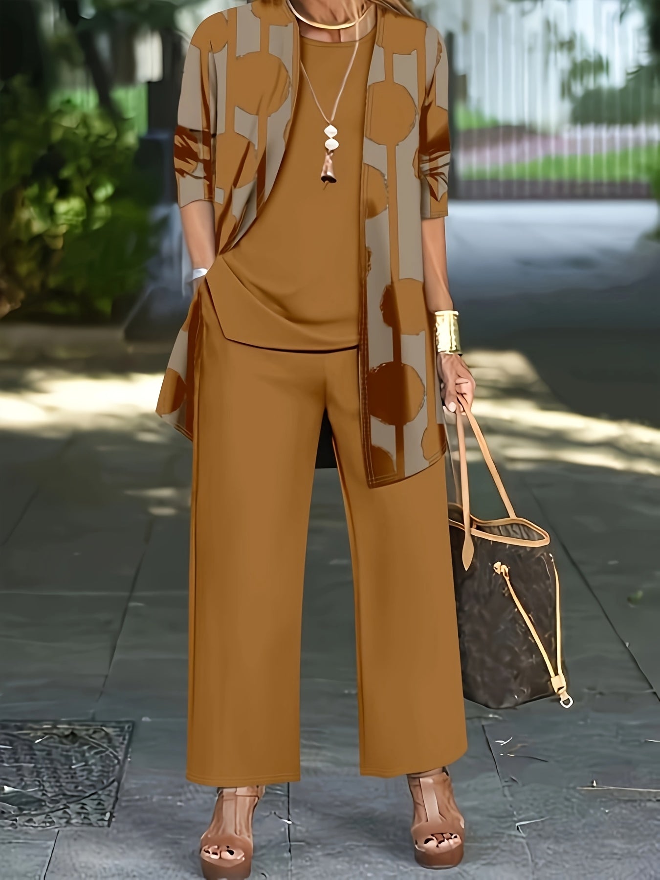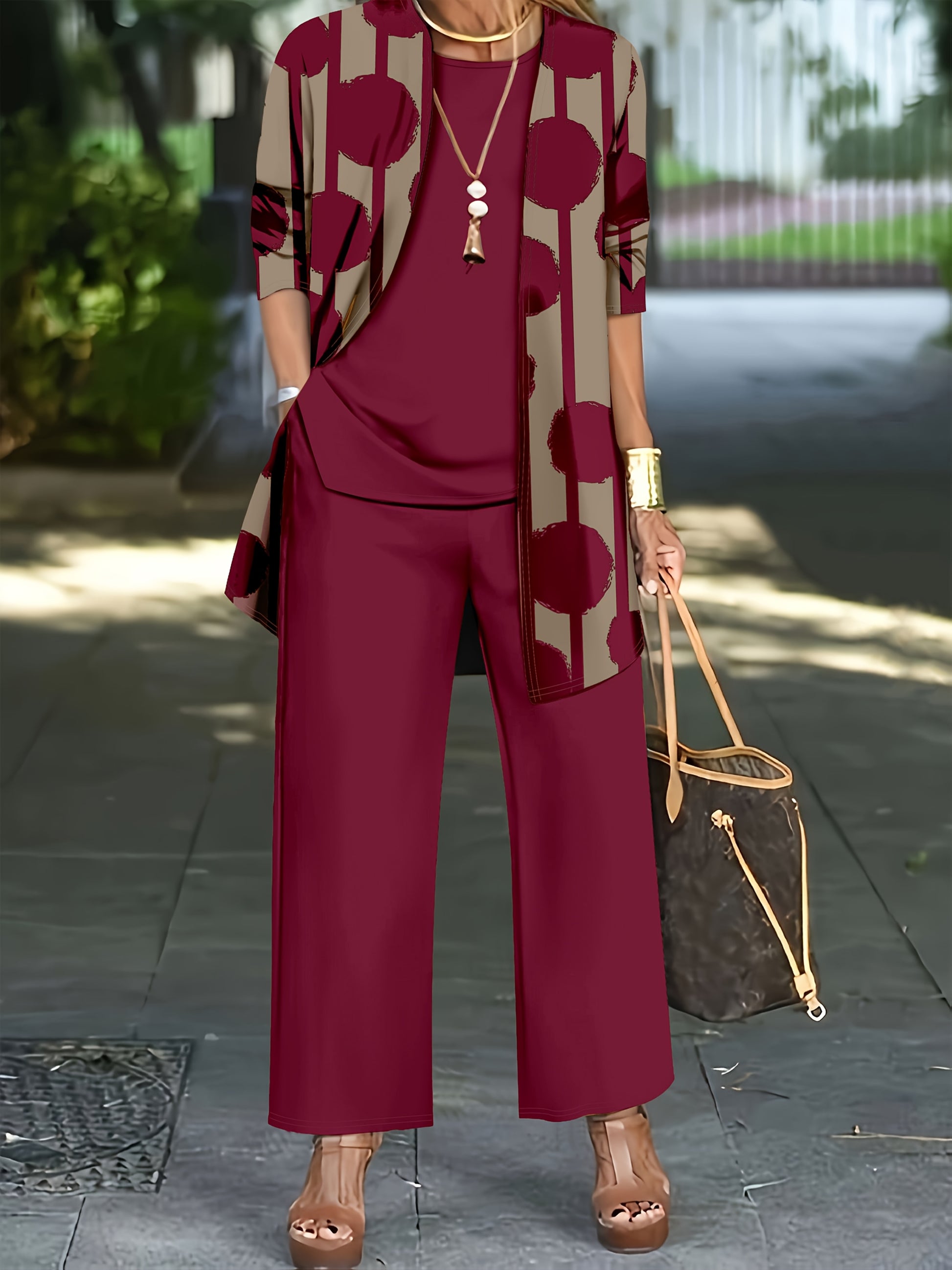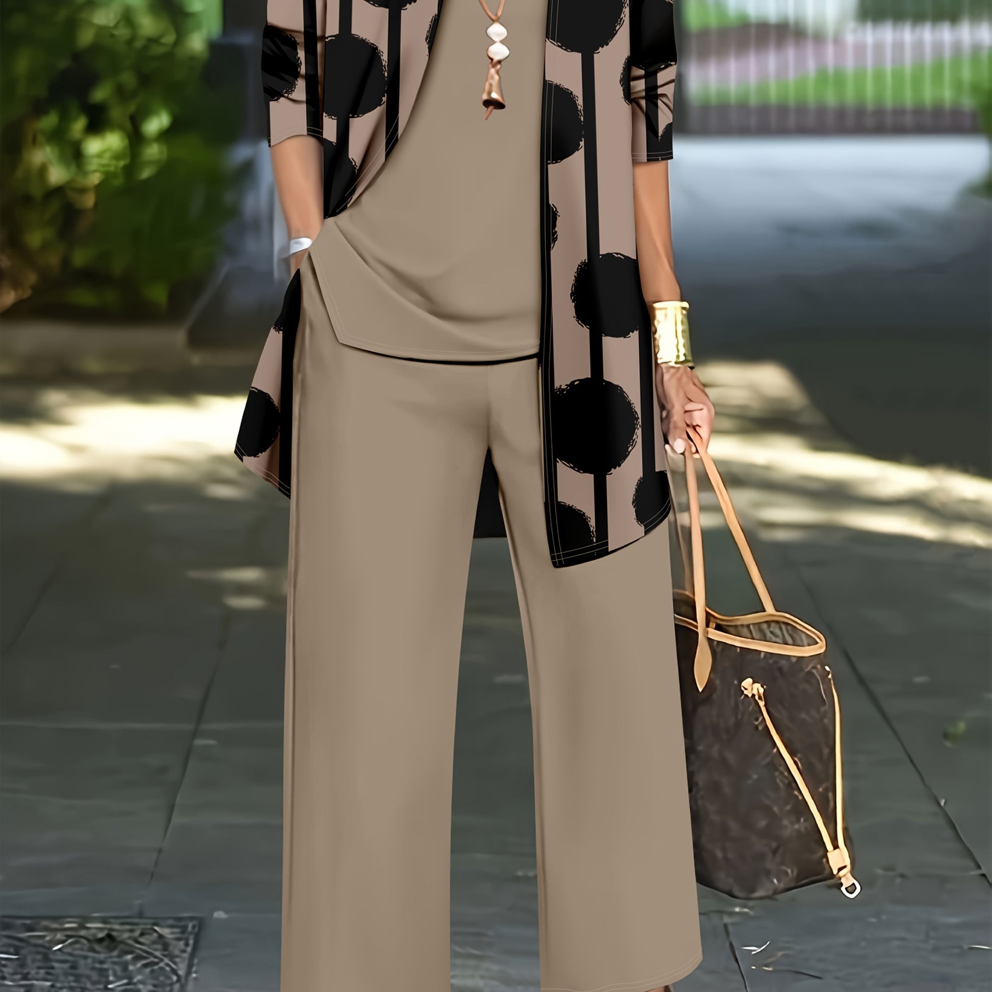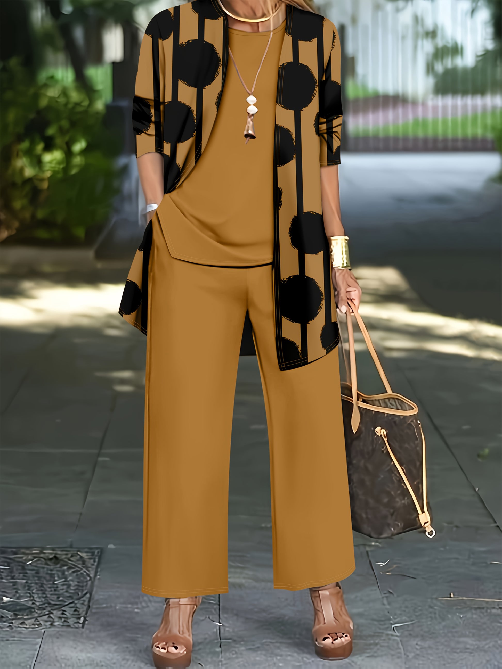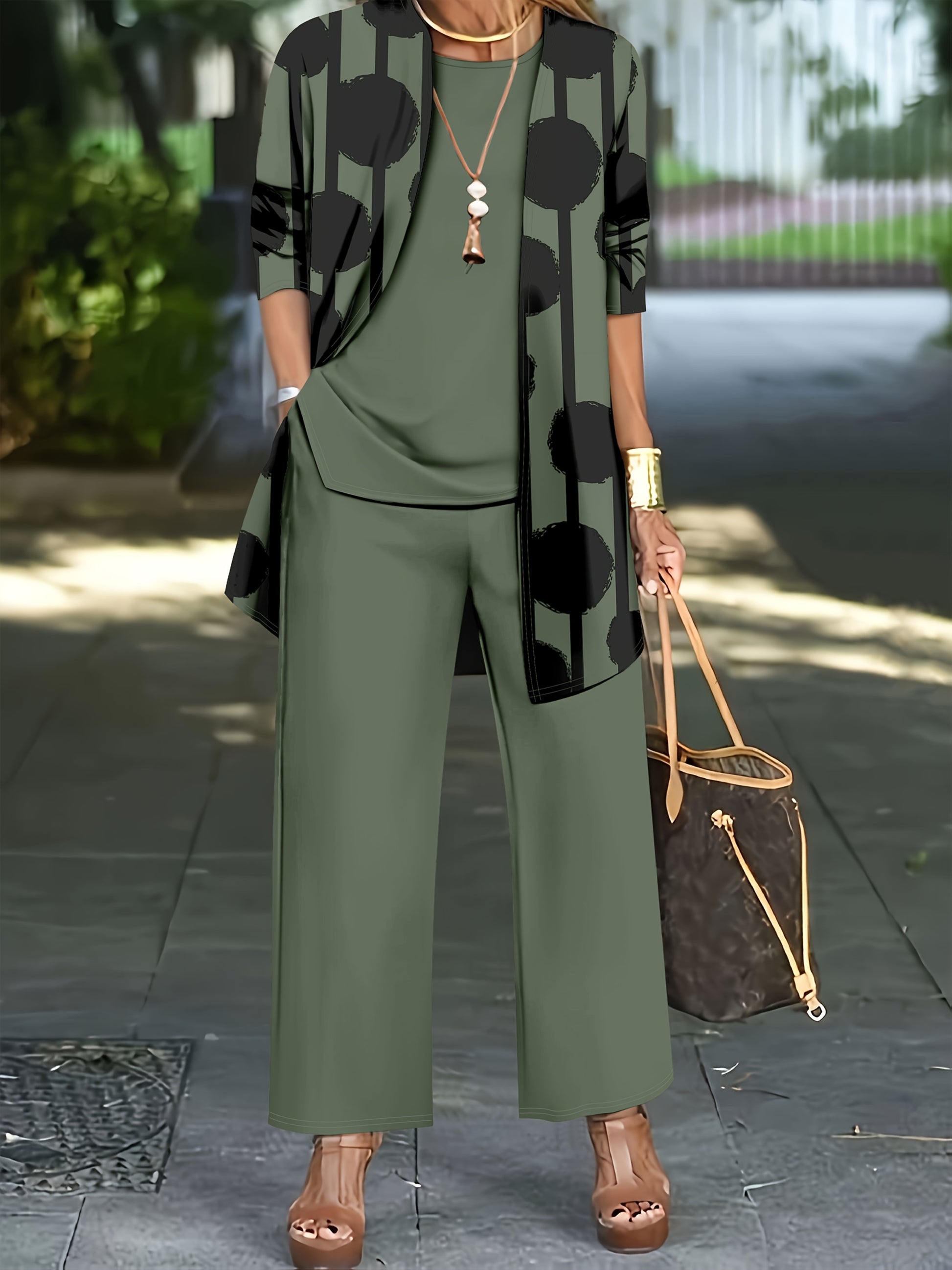 Women'S 3pcs Set, Polka Dot Print Cardigan & Solid Color Vest Casual Pants Daily Outfit