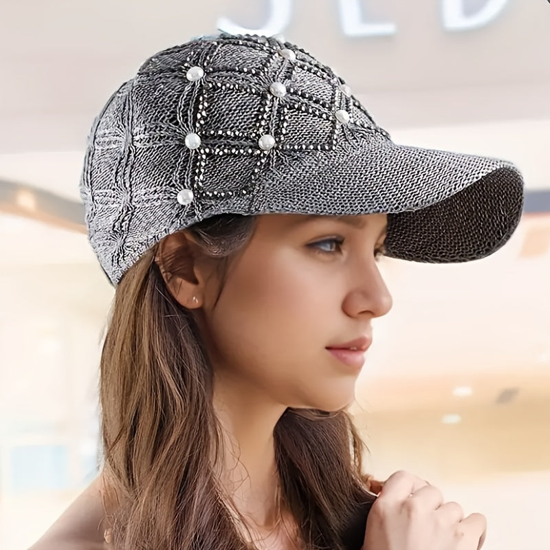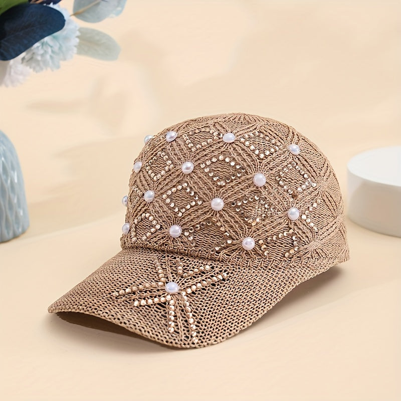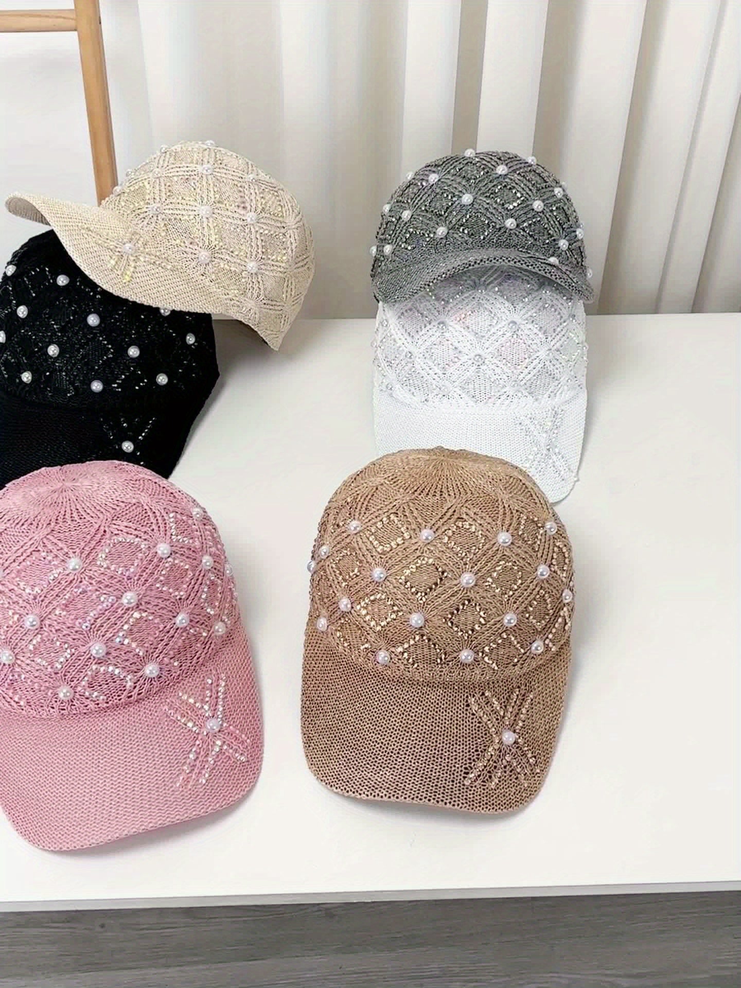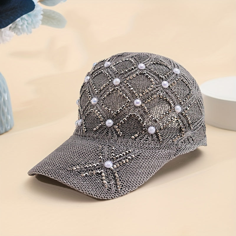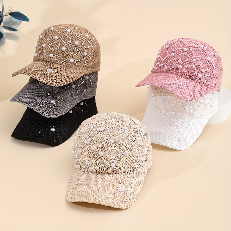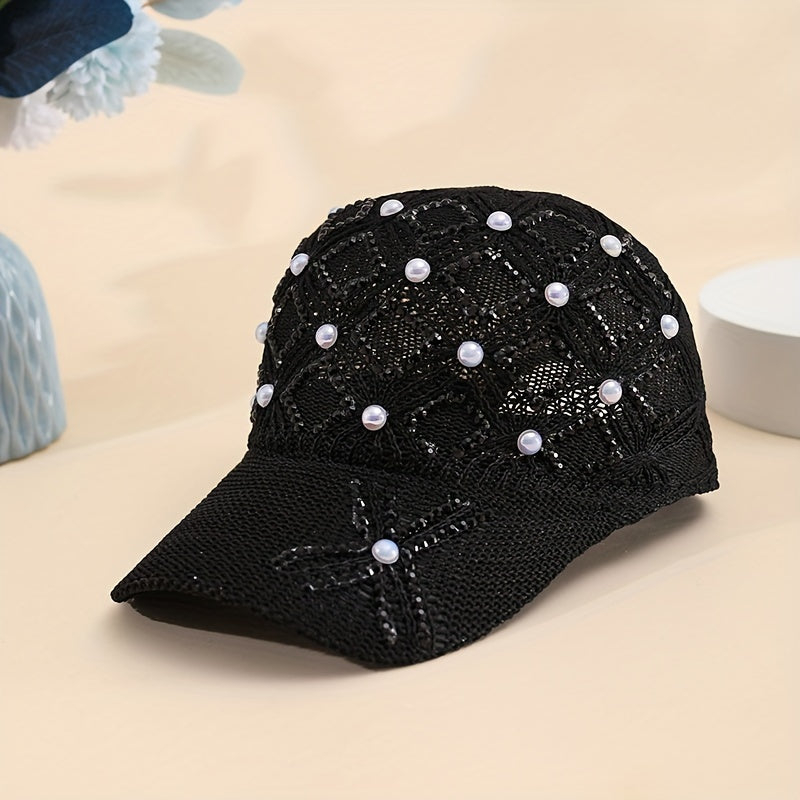 Women'S Adjustable Four-Leaf Clover Faux Pearl Baseball Cap - Breathable Mesh Summer Hat with Snap Closure, Stylish Black Design for Spring/Summer, Summer Headwear | Fashionable Headwear | Mesh Fabric Ca