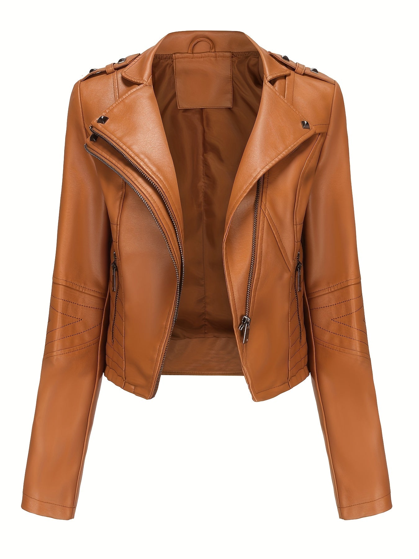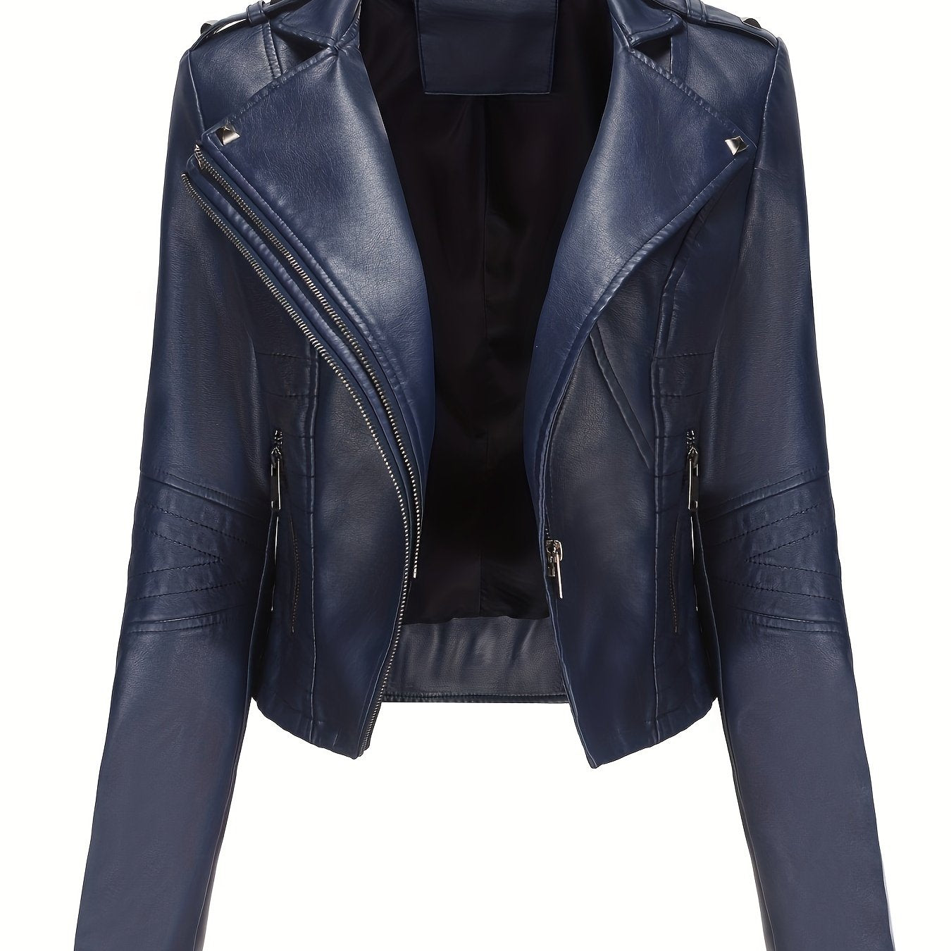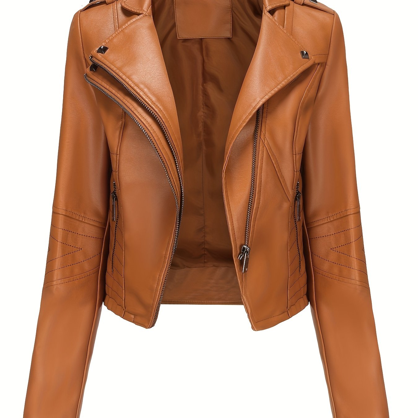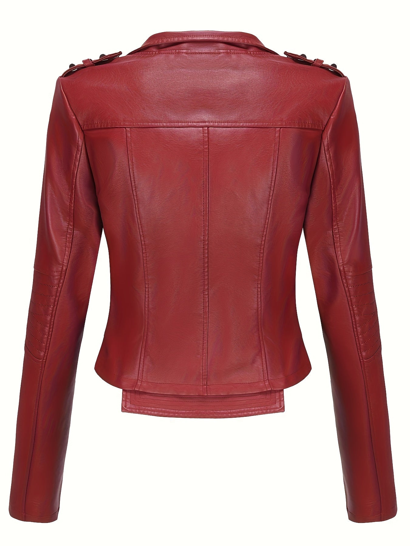Women'S Casual Faux Leather Jacket, Solid Color, Long Sleeve, Regular Length, Fall/Winter, Zipper Placket, Woven, Non-Stretch Fabric, 100% Polyurethane, Lapel Collar, Dipped Hem Detail