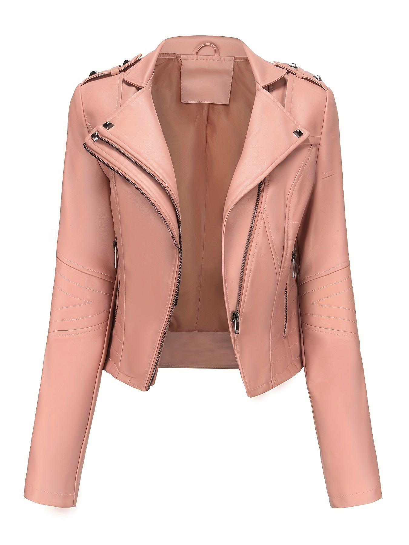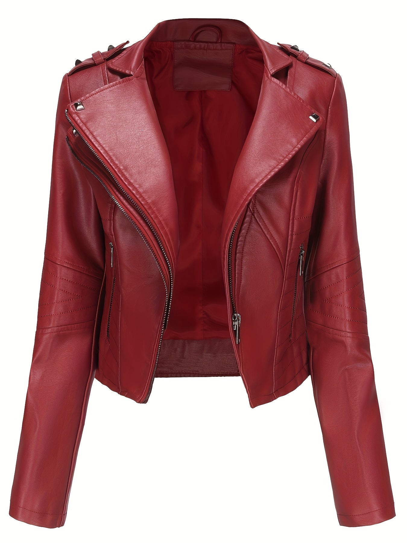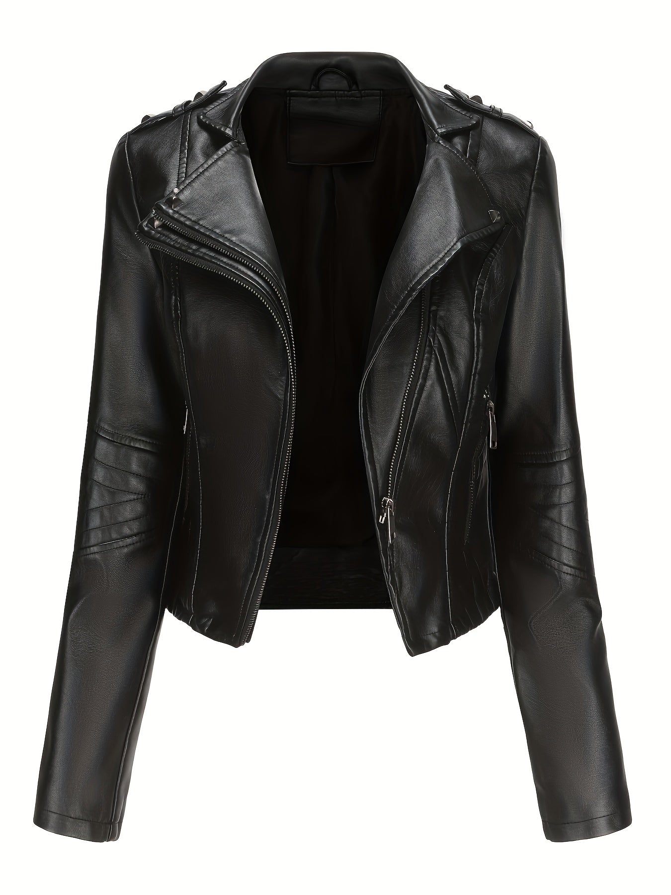 Women'S Casual Faux Leather Jacket, Solid Color, Long Sleeve, Regular Length, Fall/Winter, Zipper Placket, Woven, Non-Stretch Fabric, 100% Polyurethane, Lapel Collar, Dipped Hem Detail