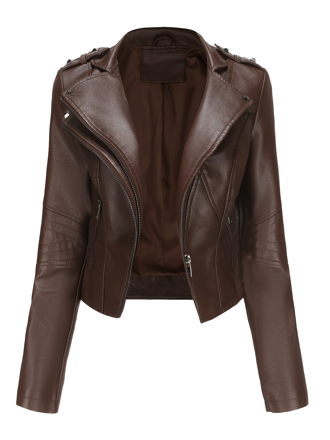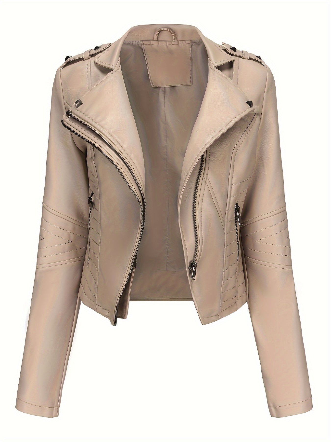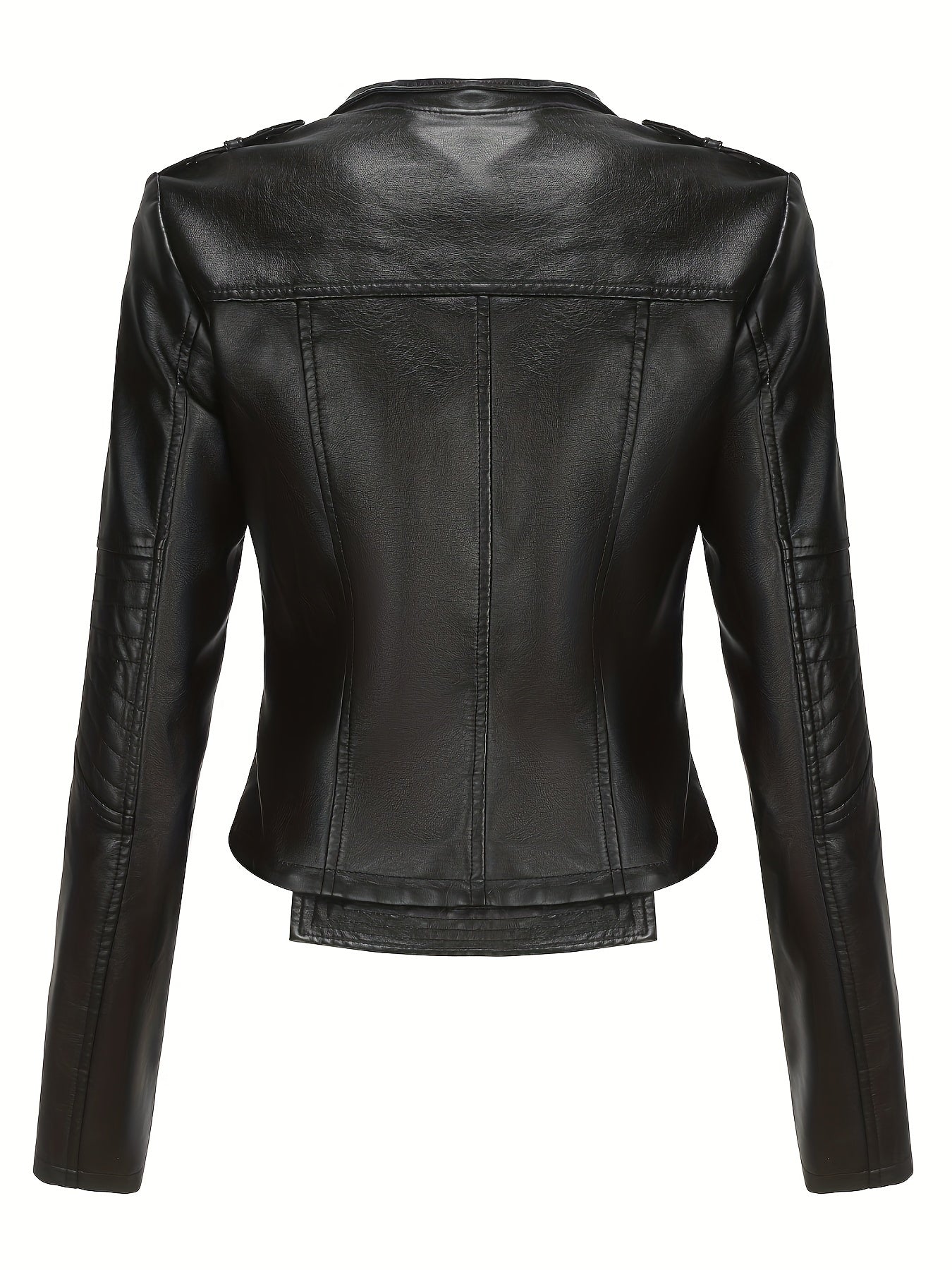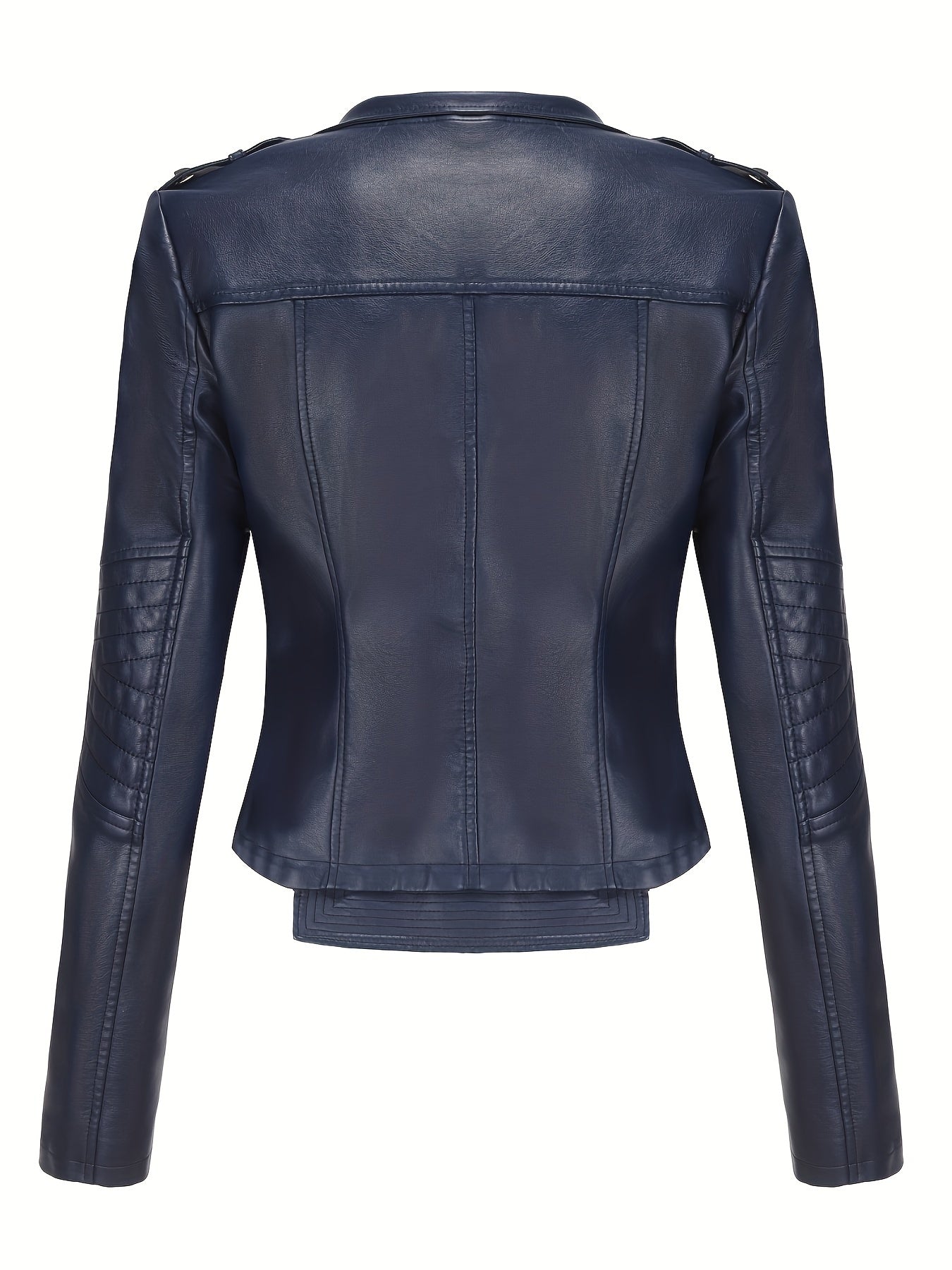 Women'S Casual Faux Leather Jacket, Solid Color, Long Sleeve, Regular Length, Fall/Winter, Zipper Placket, Woven, Non-Stretch Fabric, 100% Polyurethane, Lapel Collar, Dipped Hem Detail