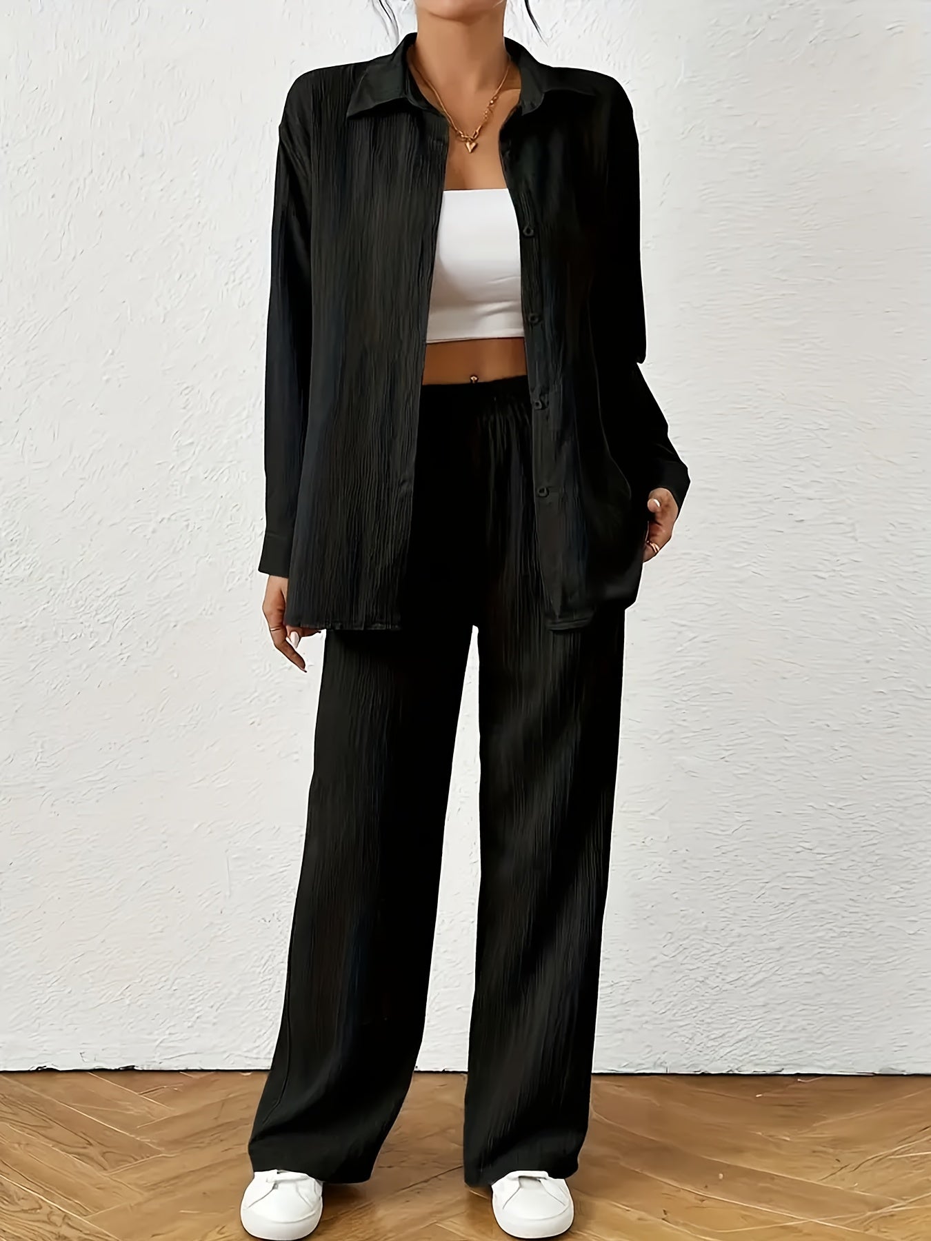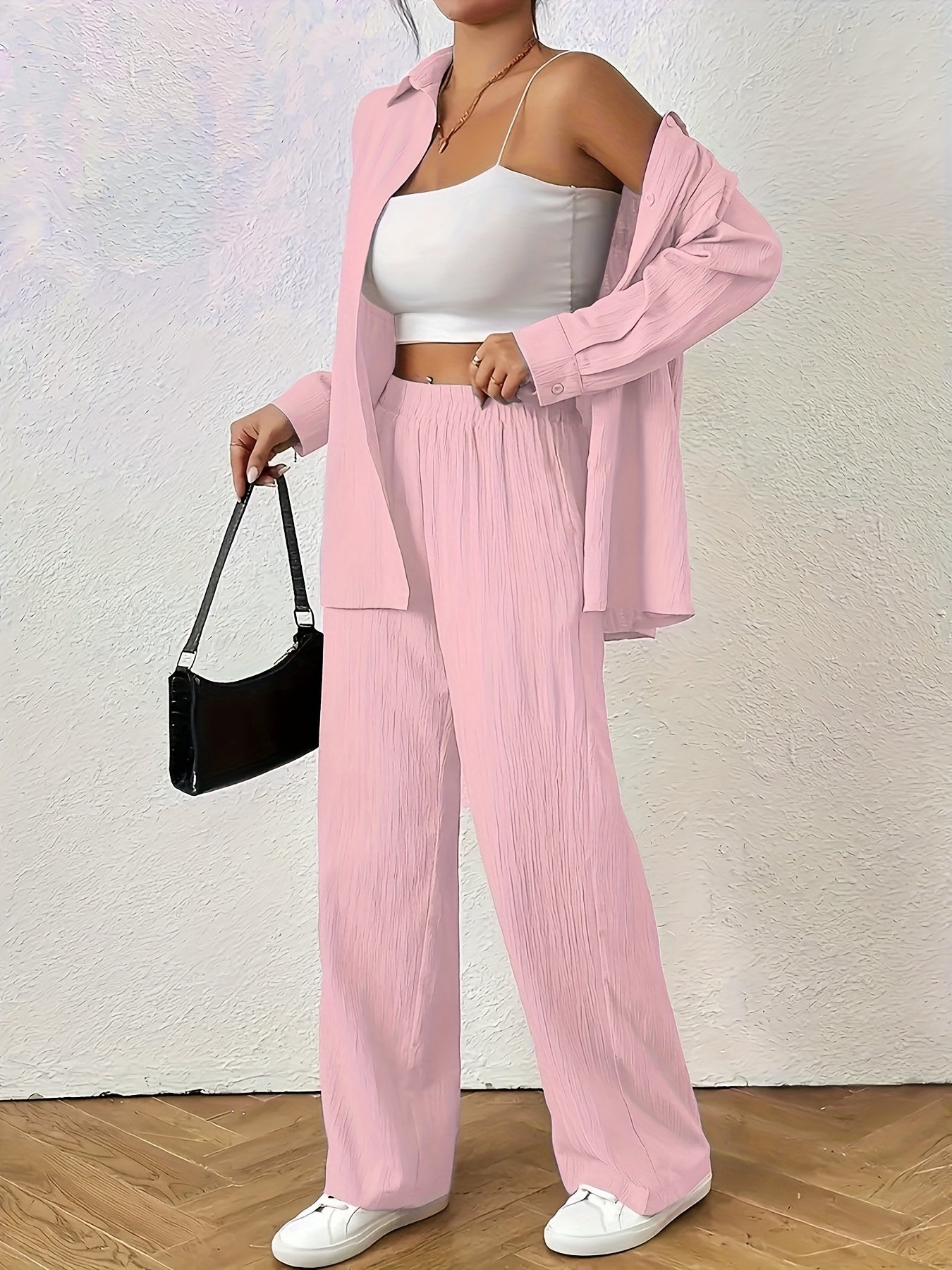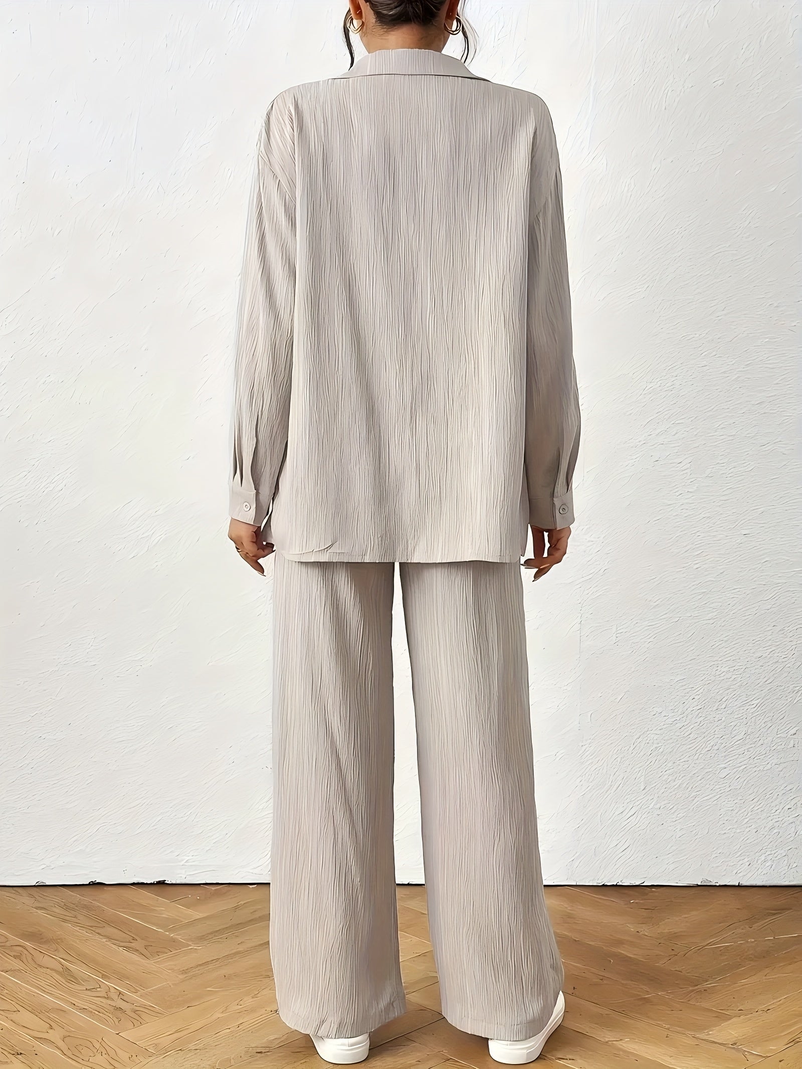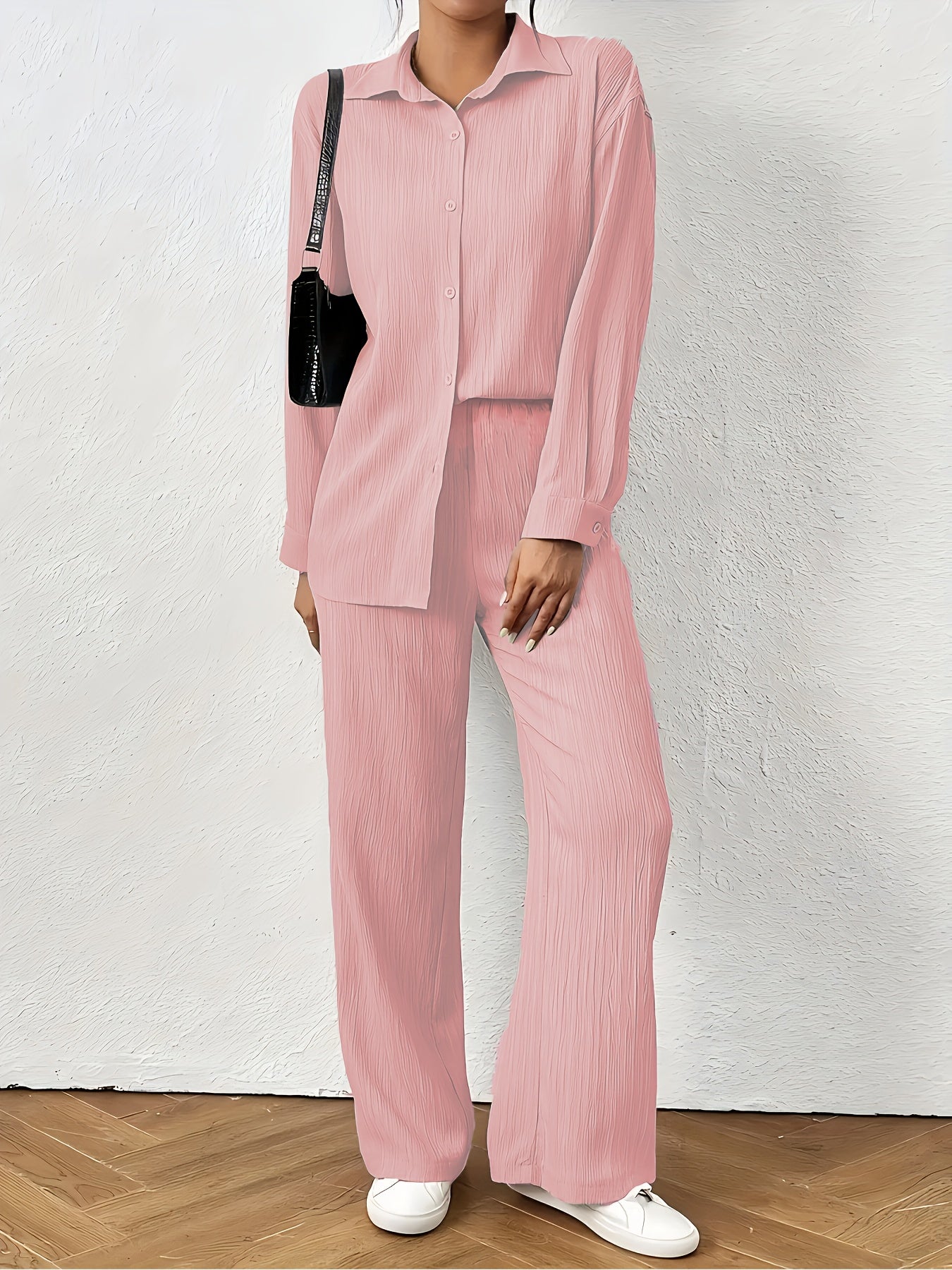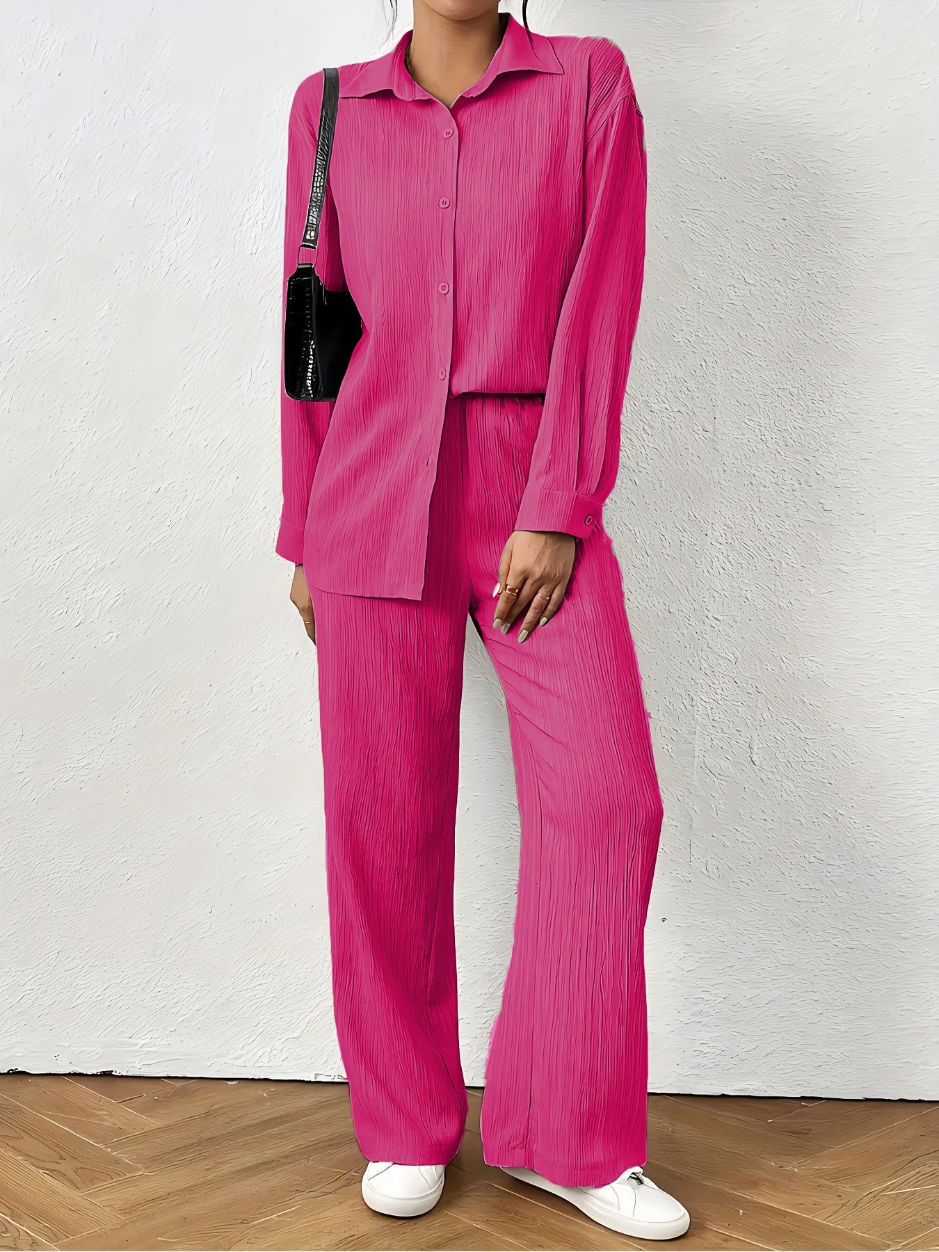Women'S Casual Solid Color Long Sleeve Shirt + Long Pants 2pcs Set for Spring And Autumn.