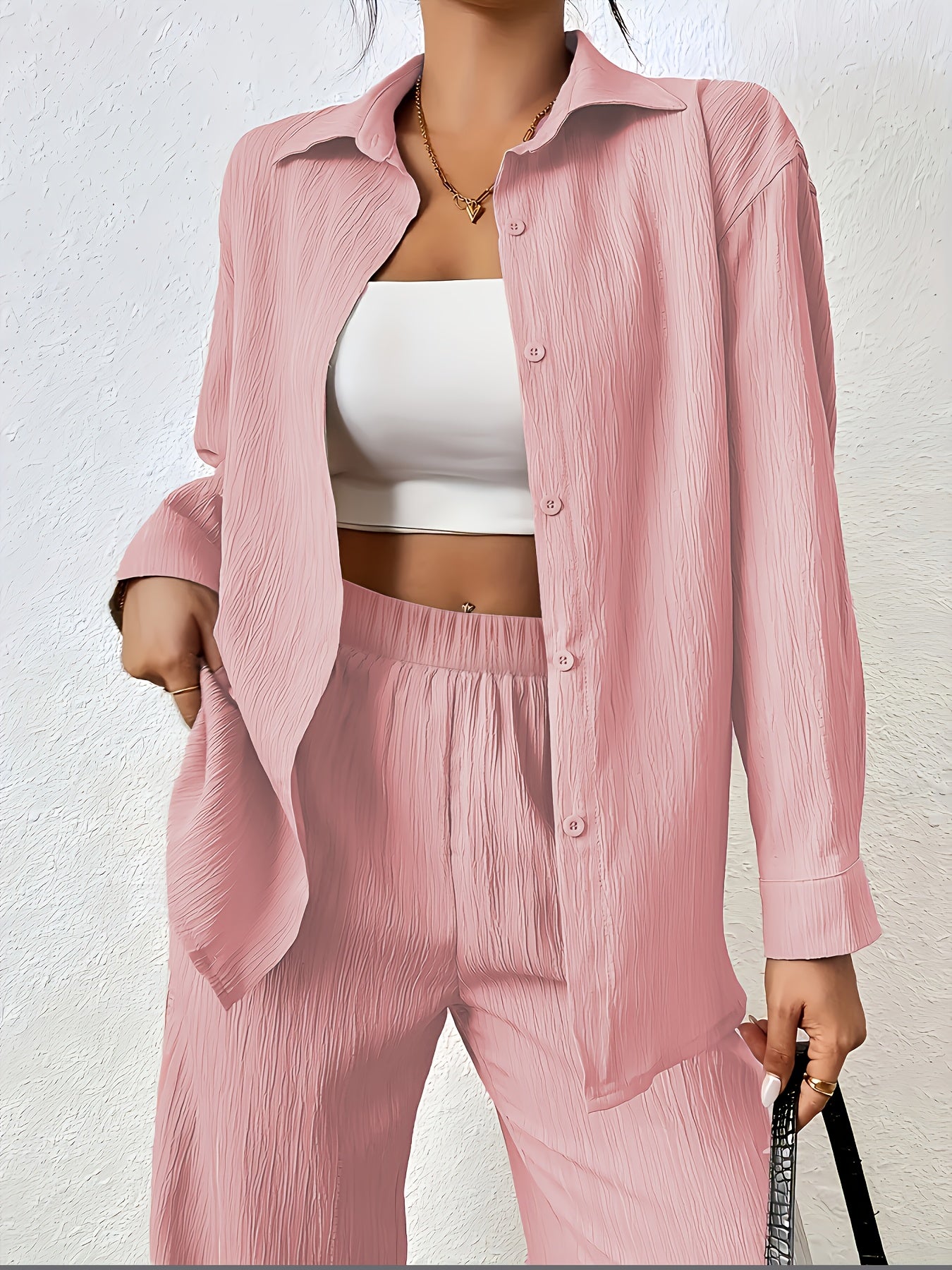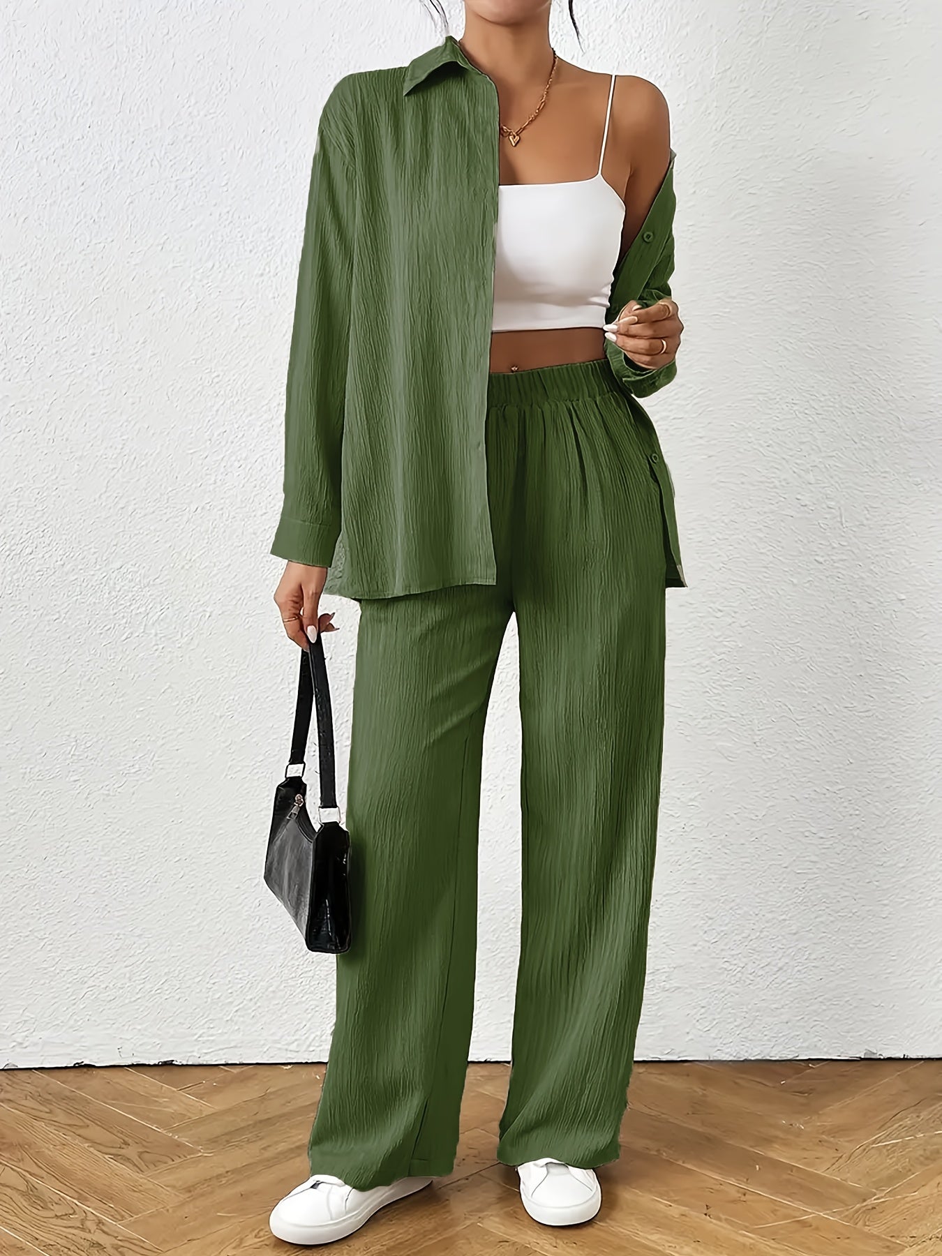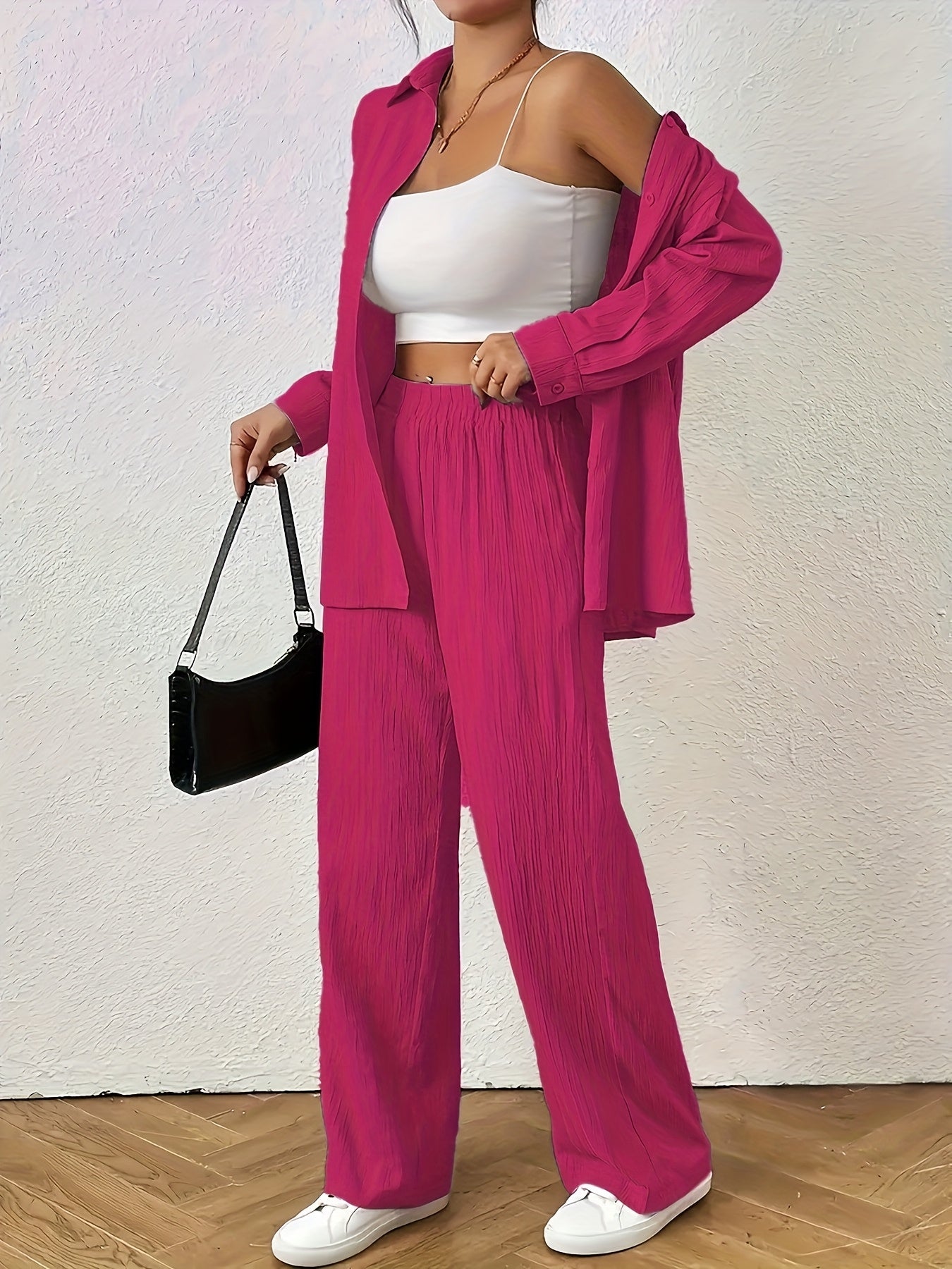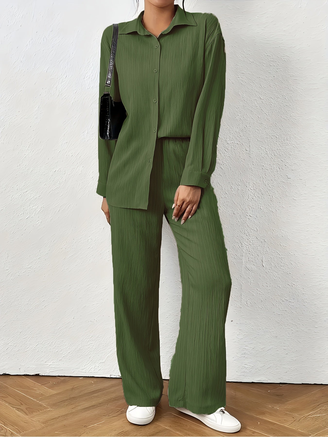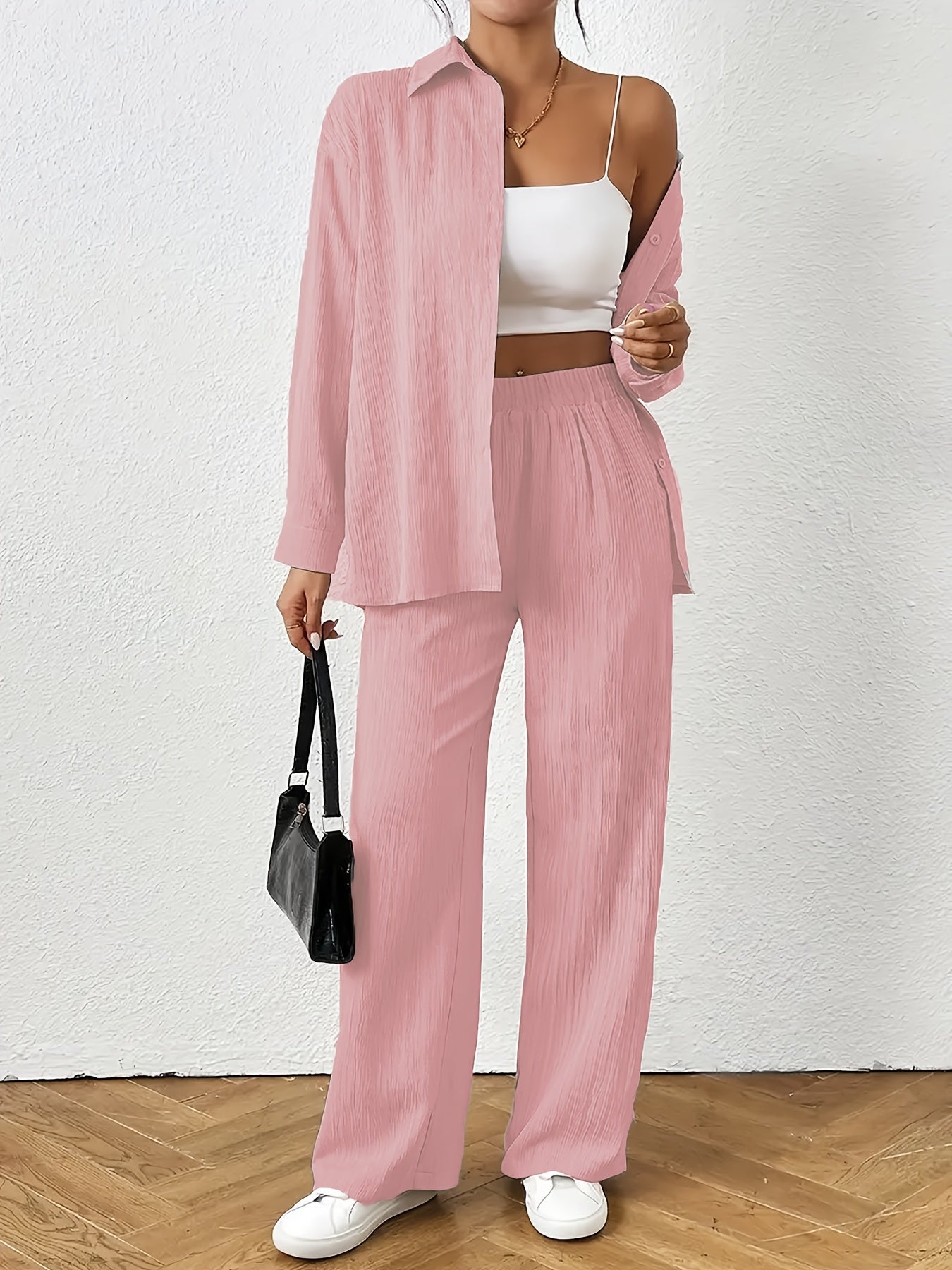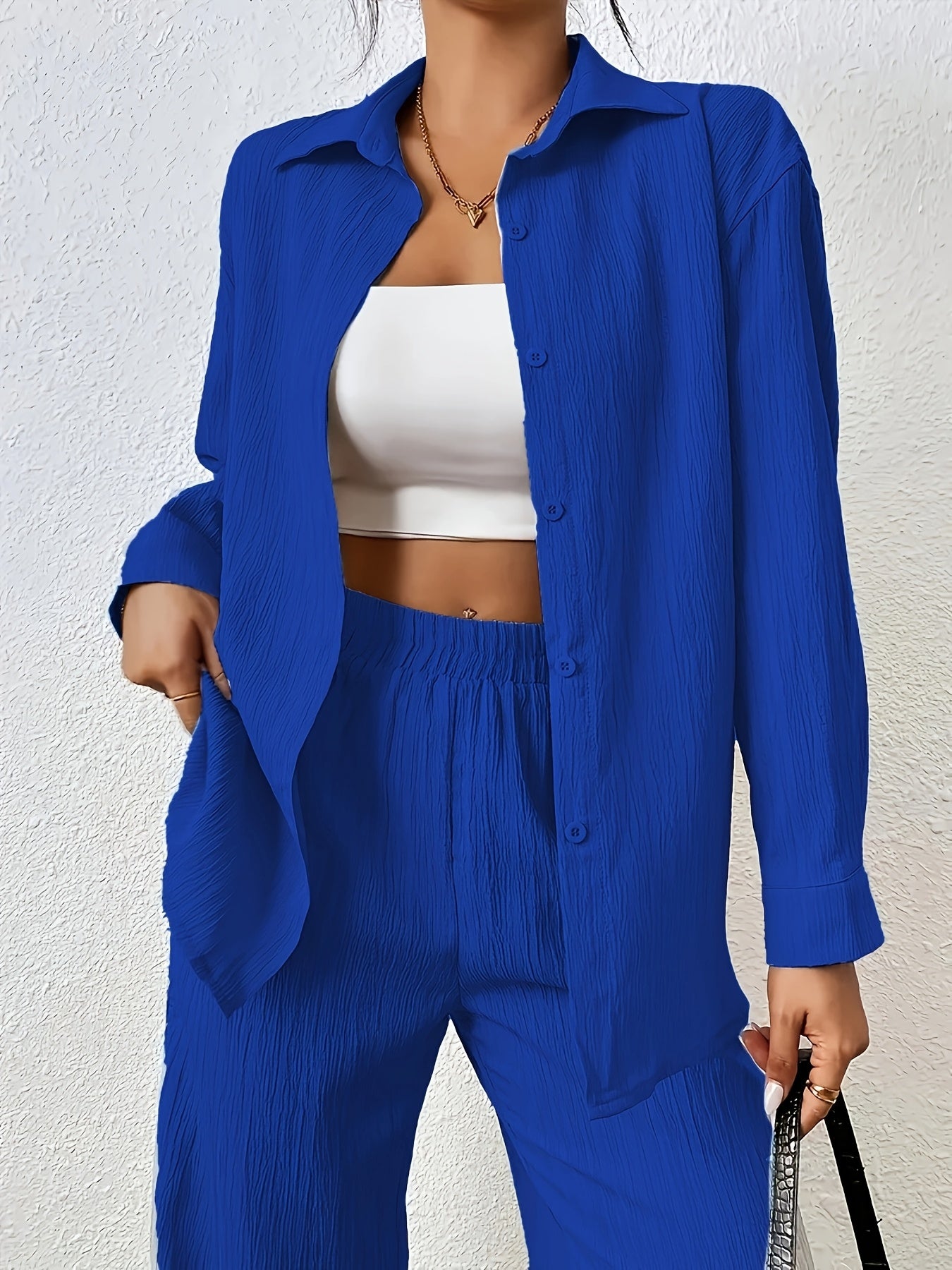 Women'S Casual Solid Color Long Sleeve Shirt + Long Pants 2pcs Set for Spring And Autumn.