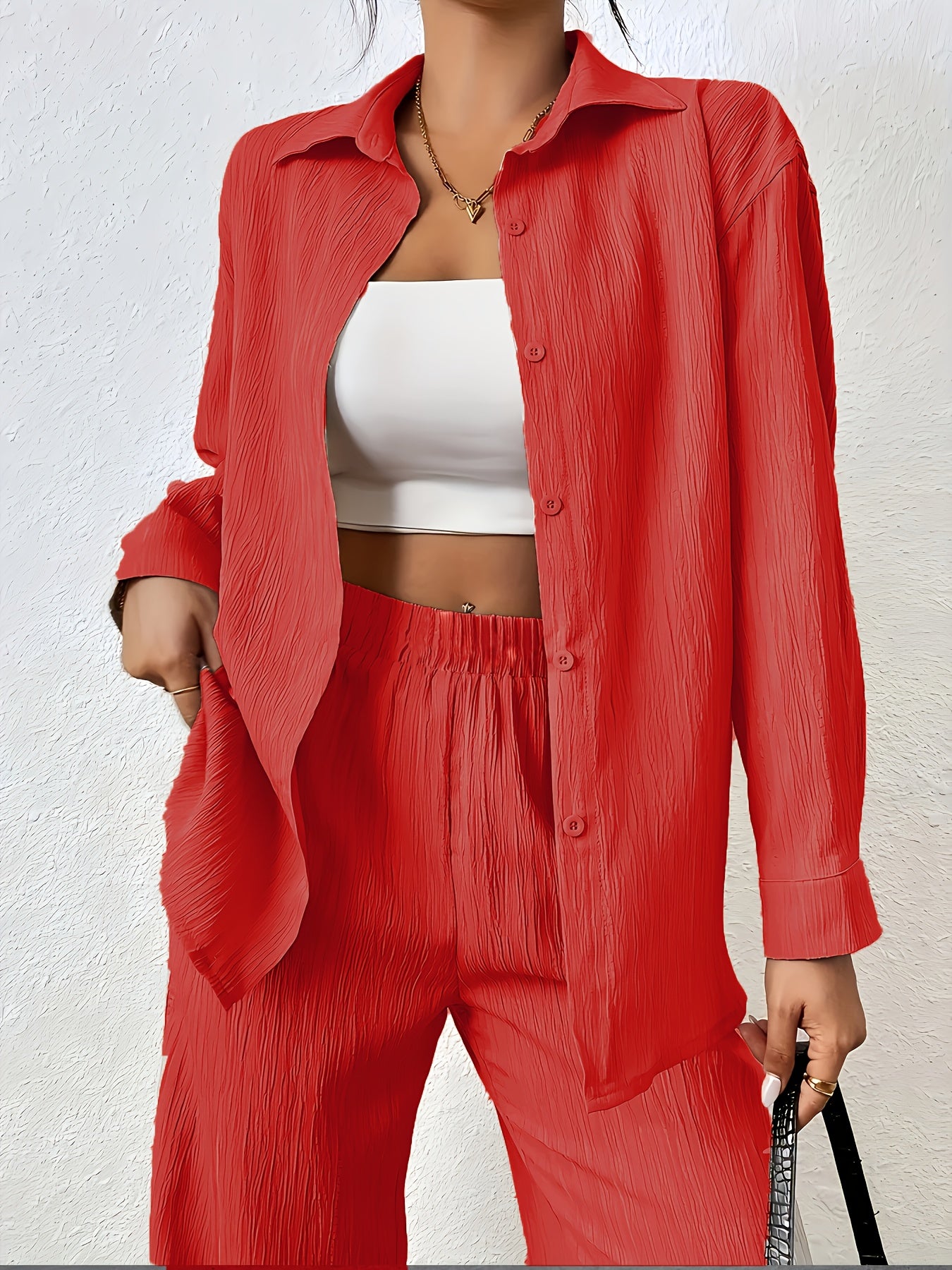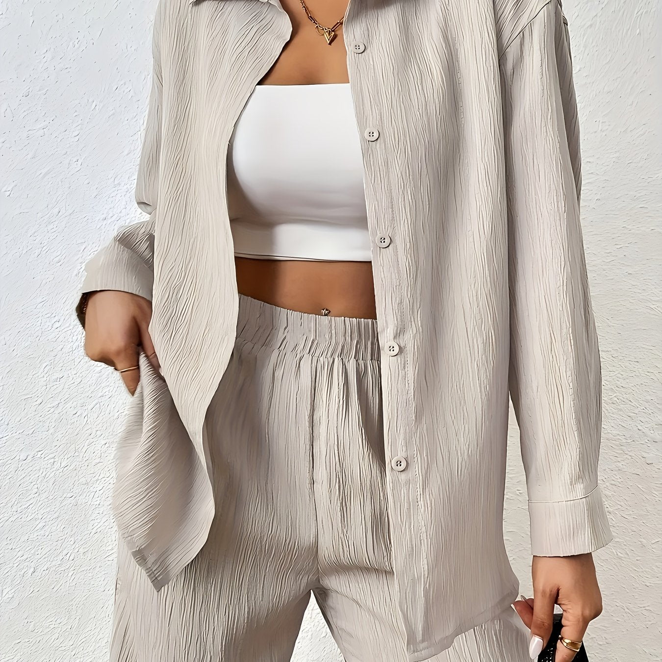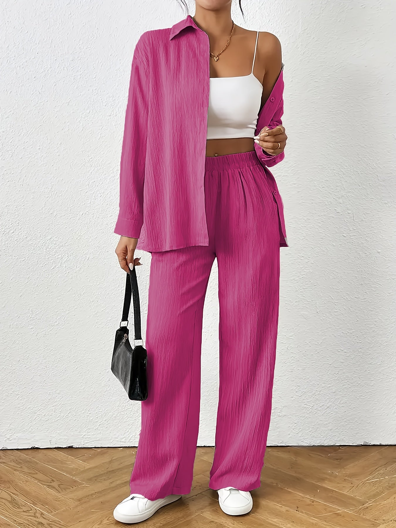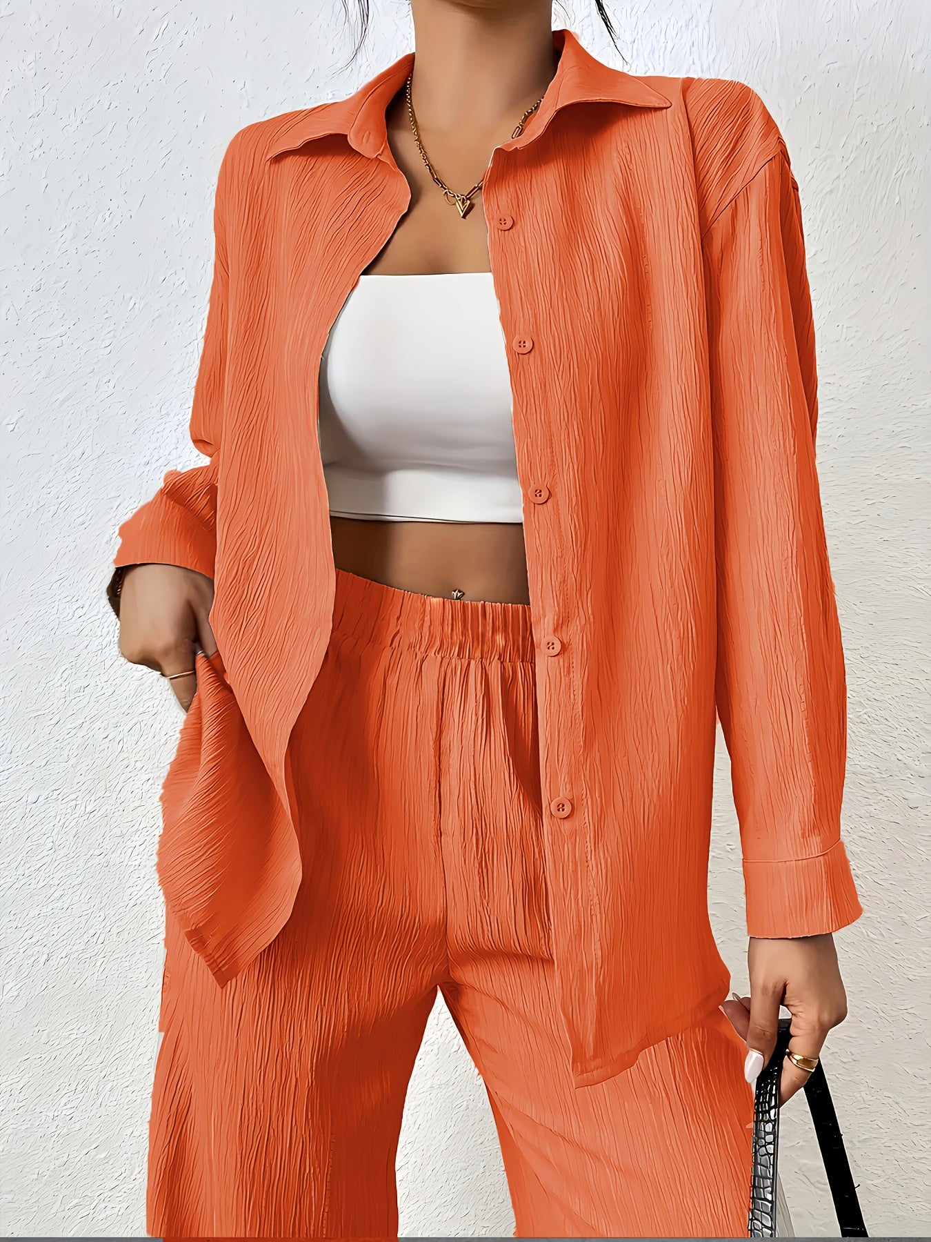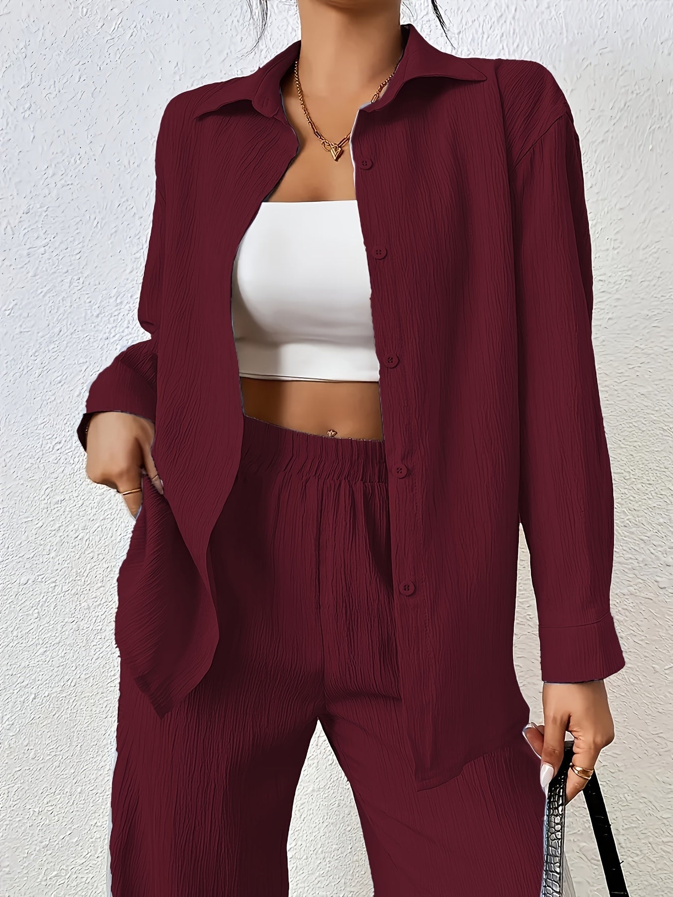 Women'S Casual Solid Color Long Sleeve Shirt + Long Pants 2pcs Set for Spring And Autumn.