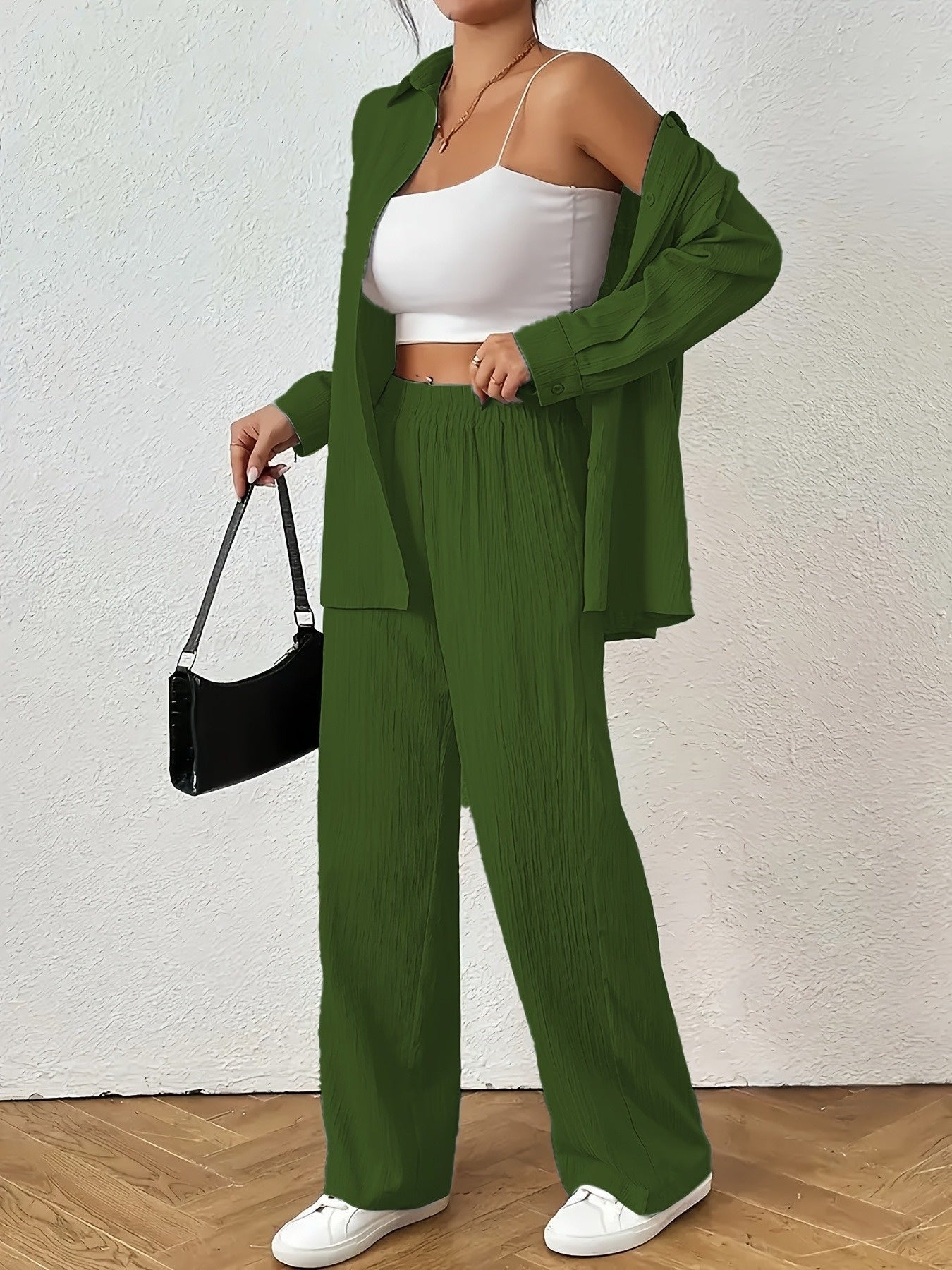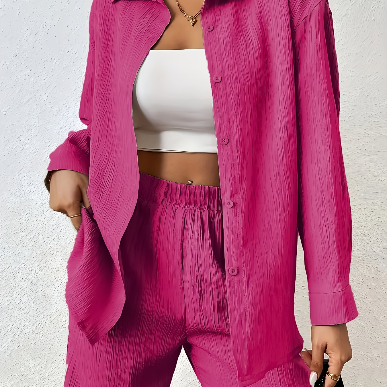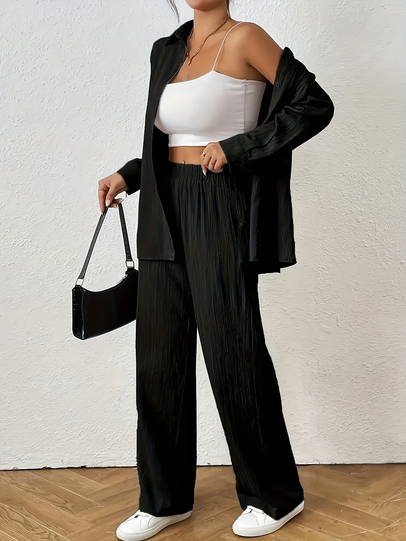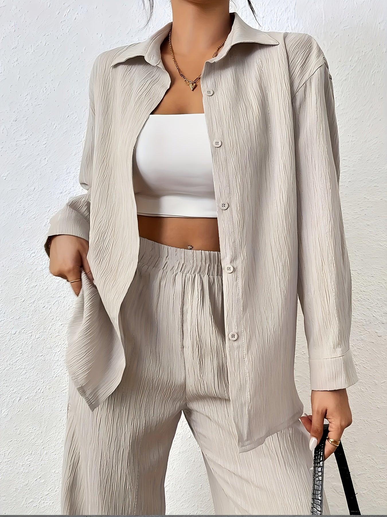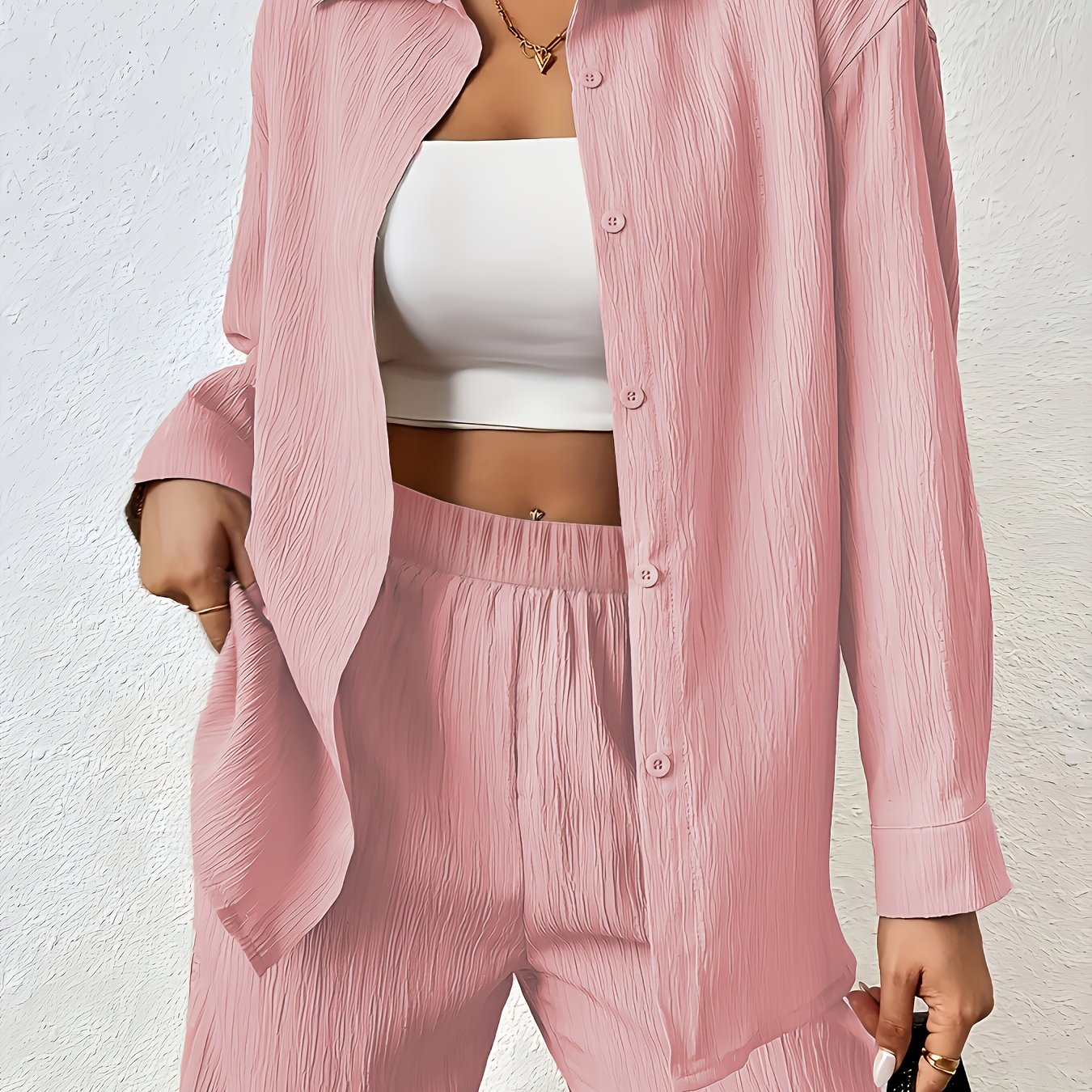 Women'S Casual Solid Color Long Sleeve Shirt + Long Pants 2pcs Set for Spring And Autumn.
