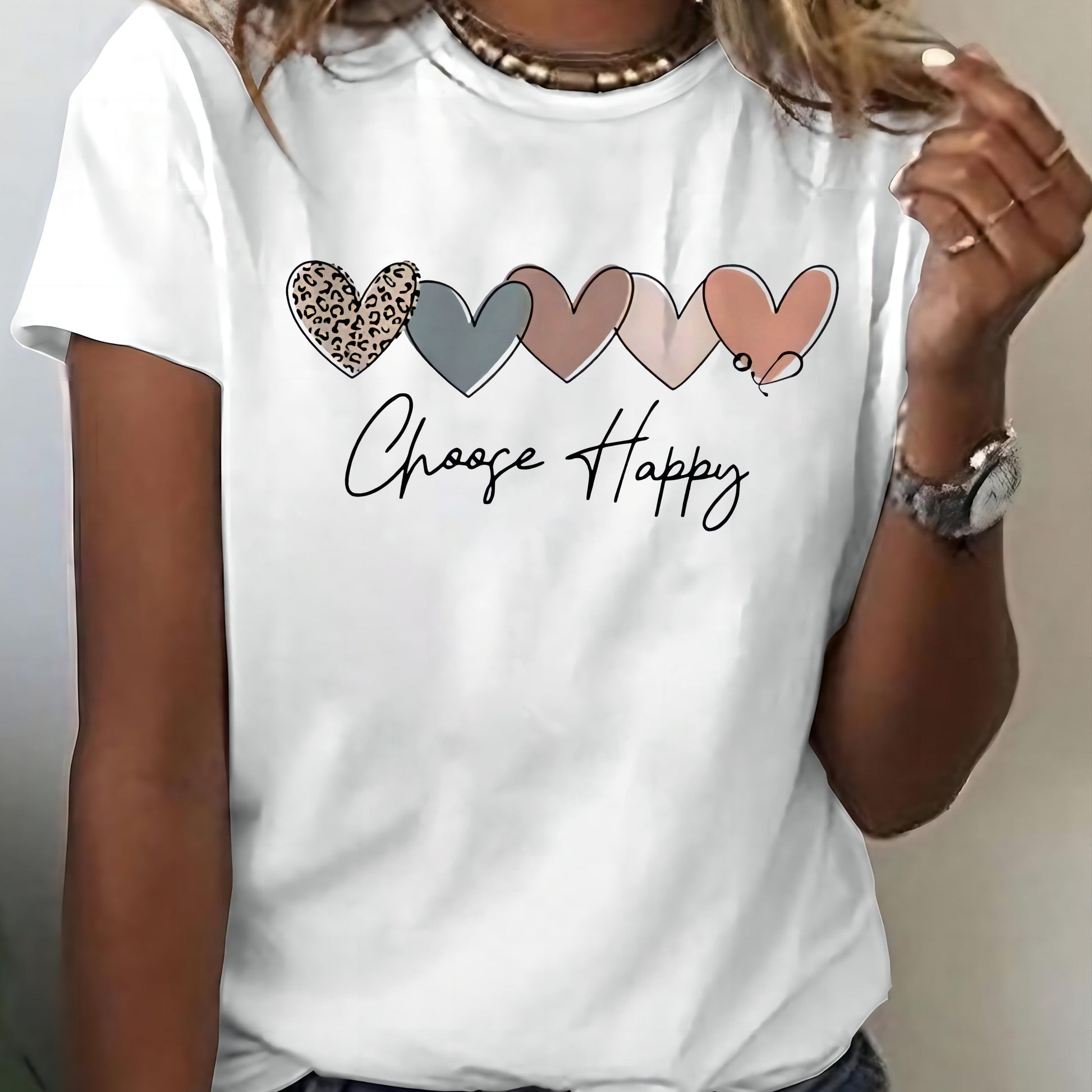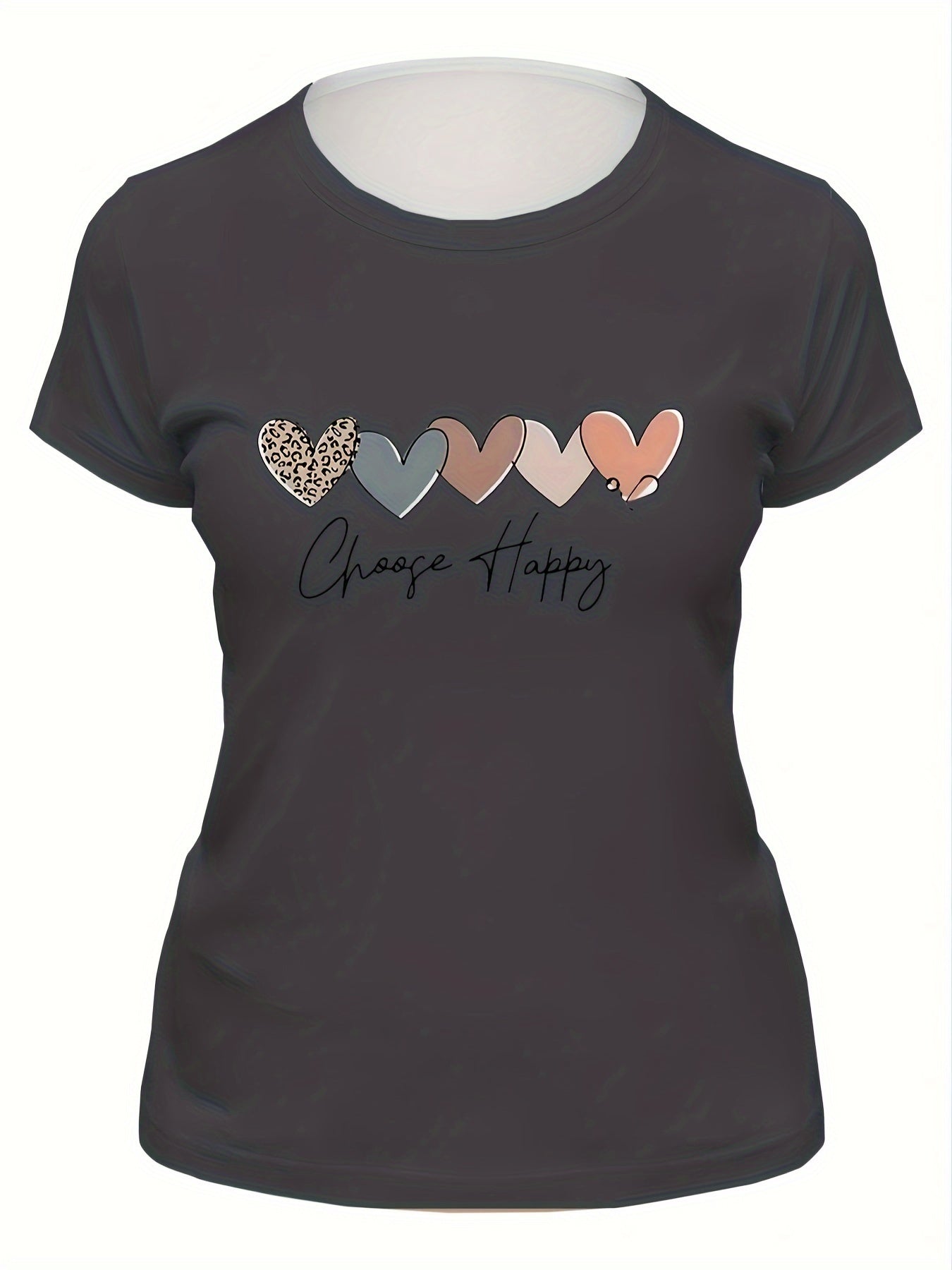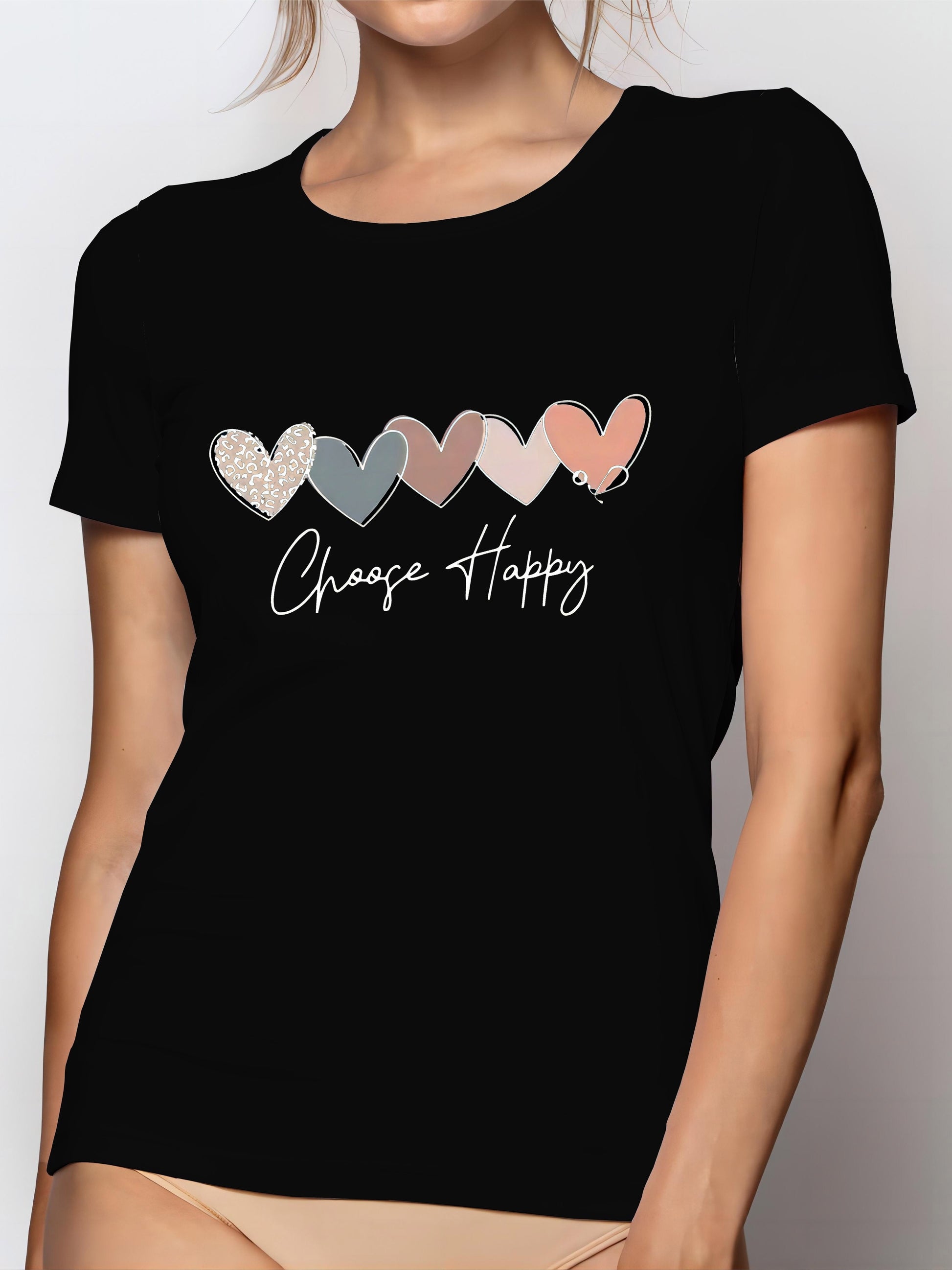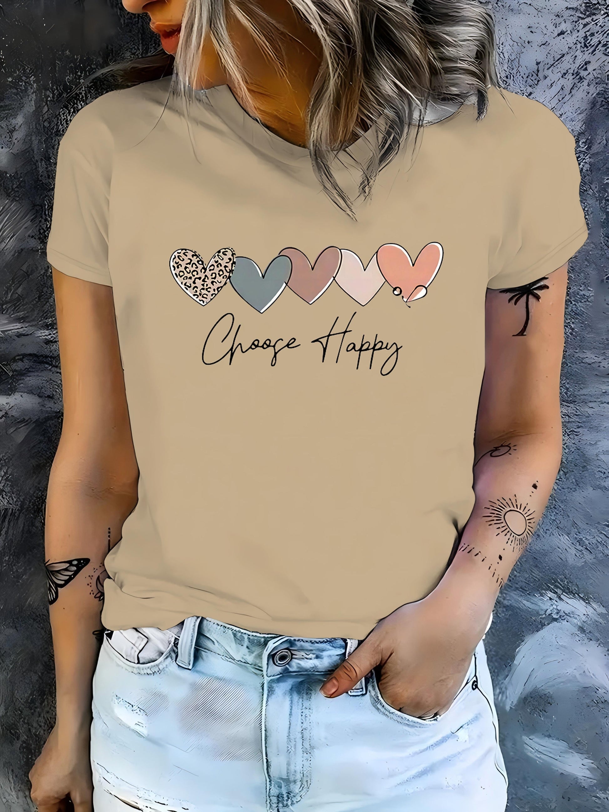 Women's Casual Sport T-Shirt, Round Neck, Heart And Happy Print, Short Sleeve, Soft Knit