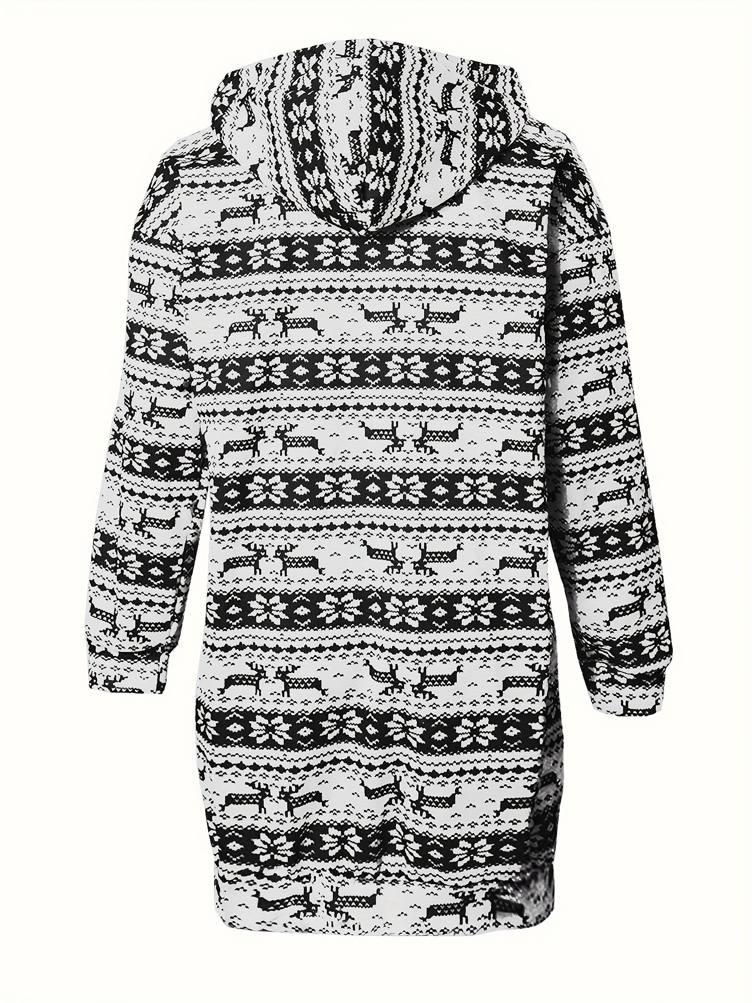 Women'S Christmas Deer & Snowflake Print Hooded Sweater Dress - Long Sleeve Winter Warmth, Red & Holiday Party Outfit with Pompom Sleeves