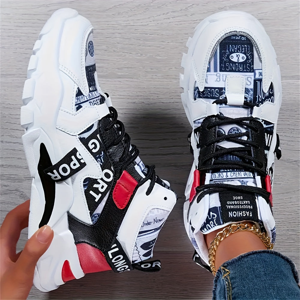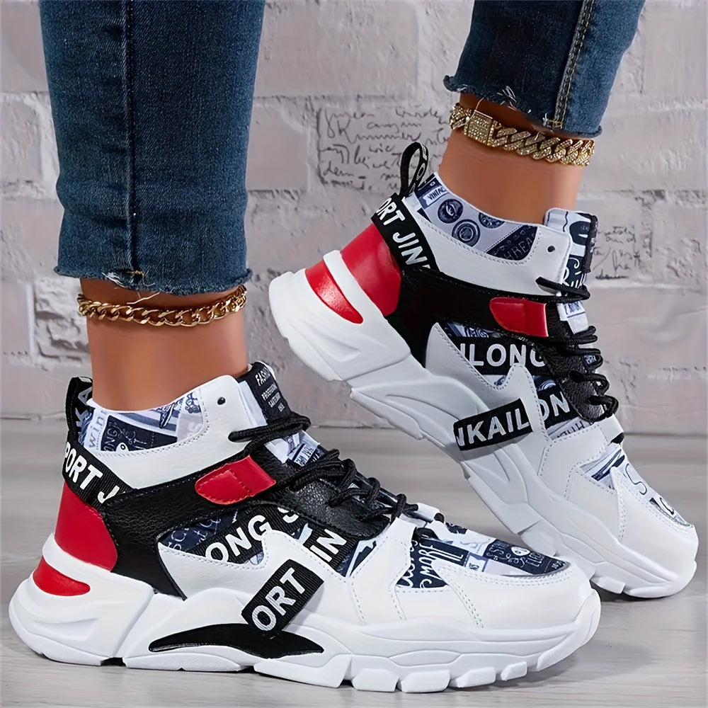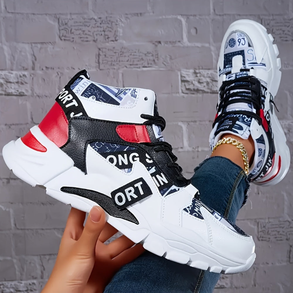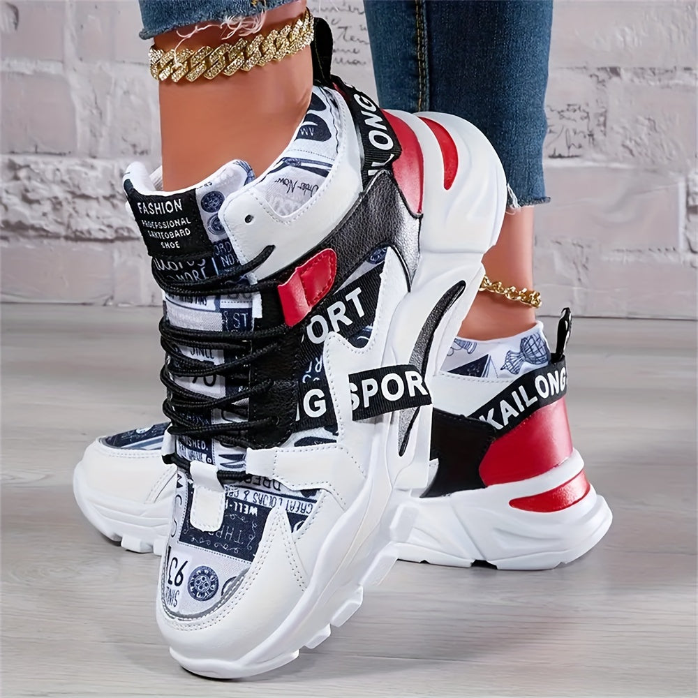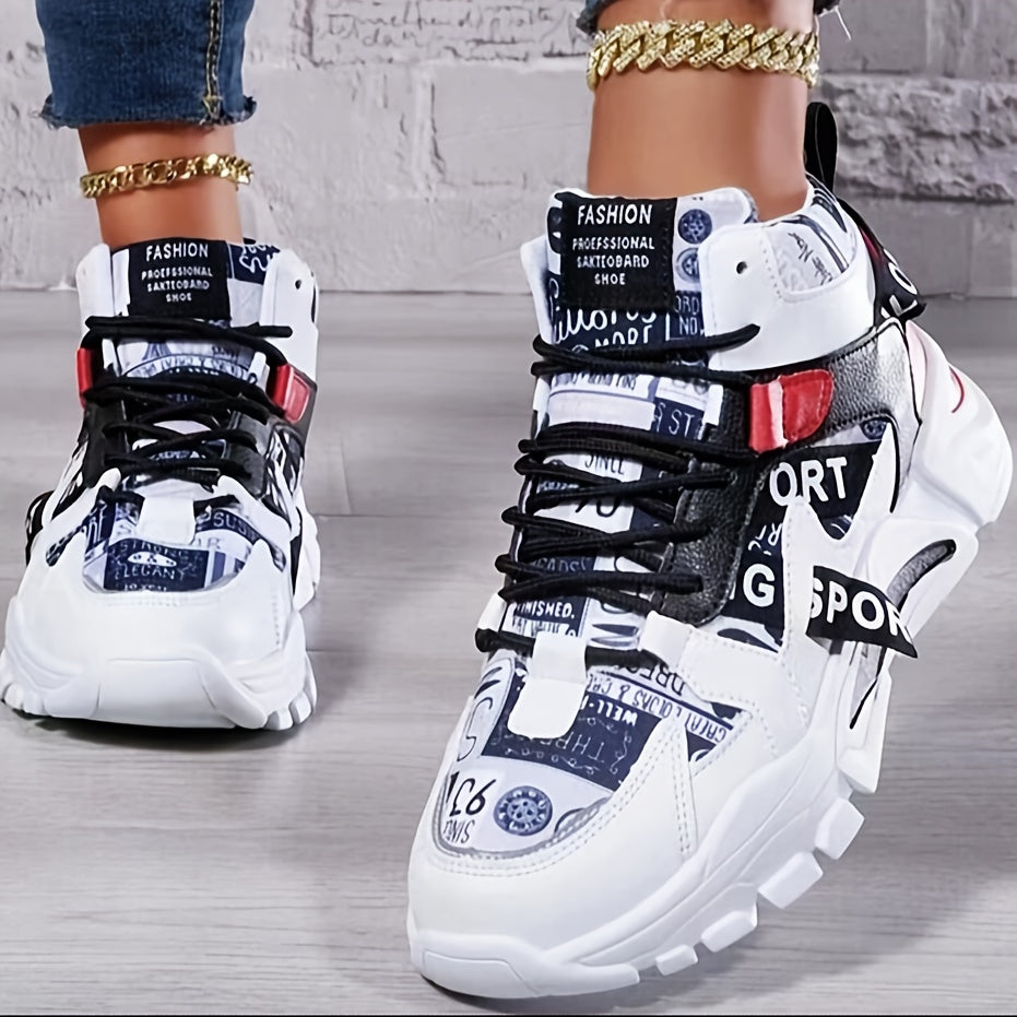 Women'S Comfortable Geometric Patterned Sports Shoes - Lightweight, All-Season, Mid Top, Lace Up, Plain Toe, Polyurethane Upper, Fabric Inner and Insole, MD Sole, Random Printing
