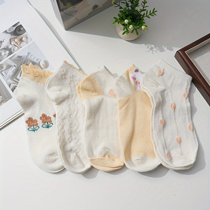 Women's Cute Cartoon Cotton Ankle Socks - 5 Pairs Set, 80% Cotton 20% Elastane, Solid Color & Patterned Designs, Breathable Knit Fabric, Sweat-Absorbent for Spring & Summer