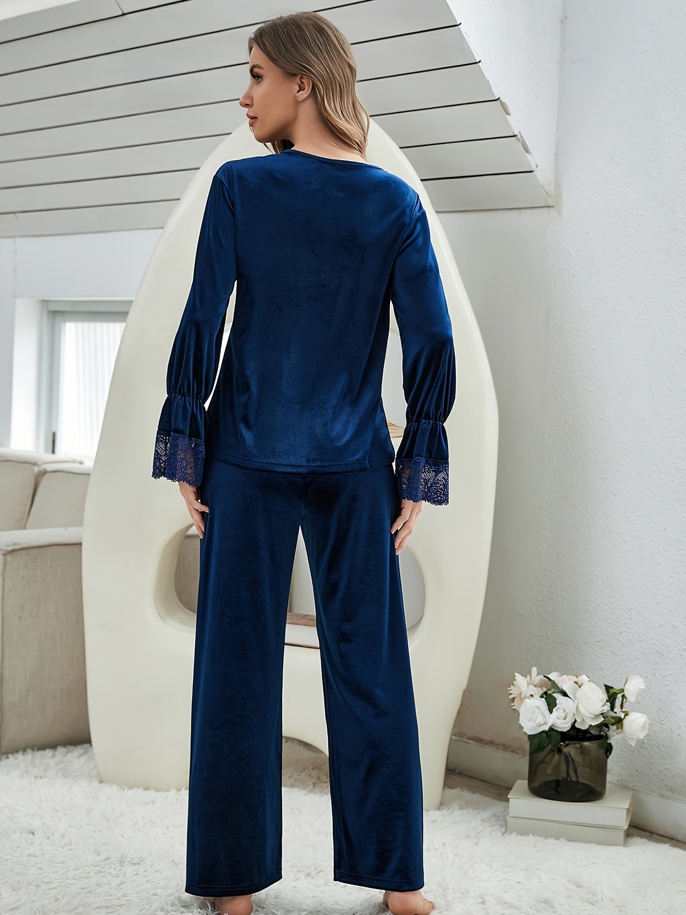 Women'S Elegant Autumn/Winter Soft Comfortable Korean Velvet Pajama Set with Lace Trim, V-Neck, Long Sleeve, Solid Color, Adult Pajama Suit, No Belt, Long Pants, Knitted Fabric