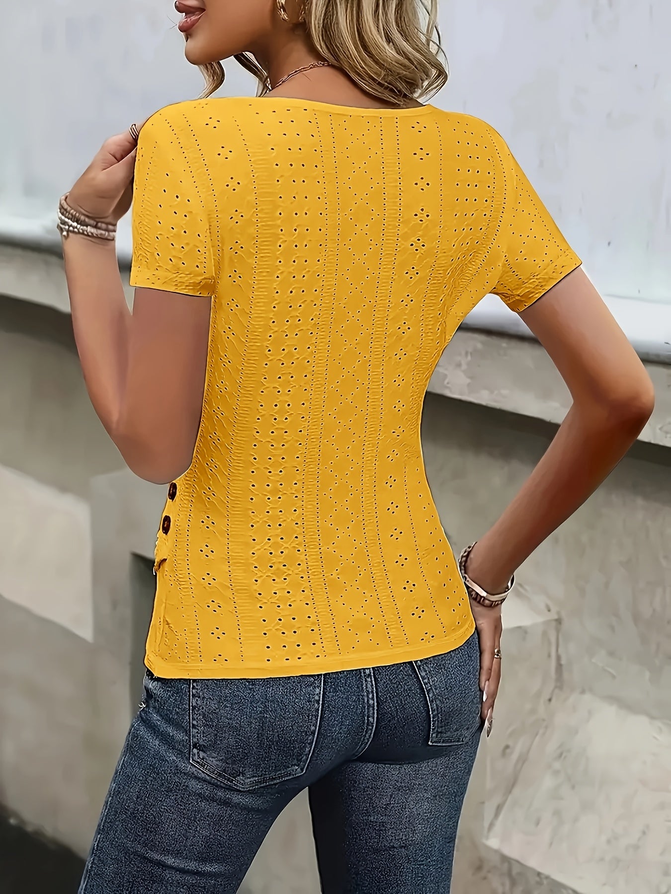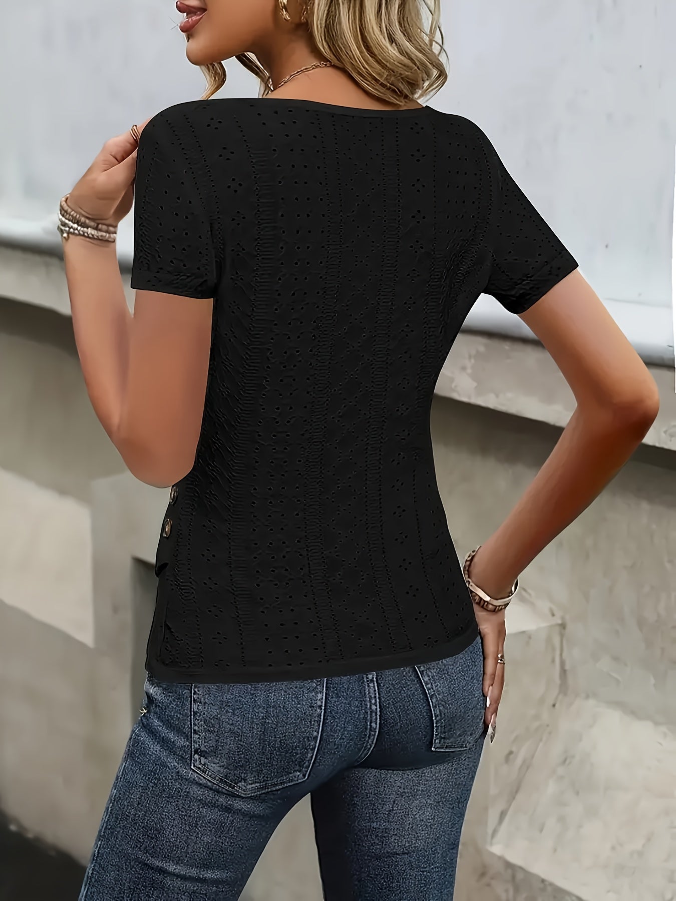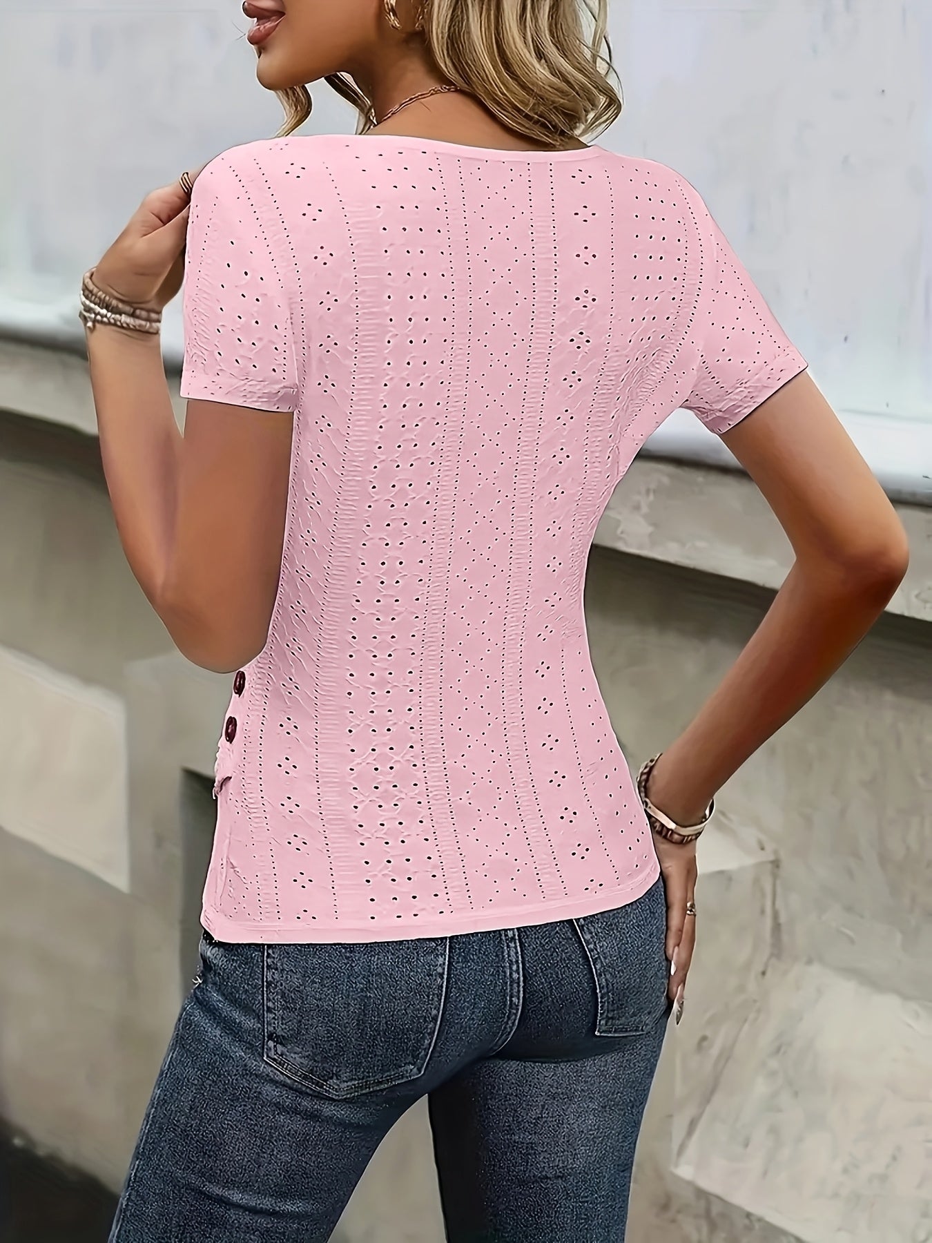 Women's Elegant Deep V-Neck Short-Sleeve Shirt with Cut-Out Details and Button Accents, Breathable Polyester Spring/Summer Top, Perfect for Casual or Formal Wear, Nian Nian Women's Shirts