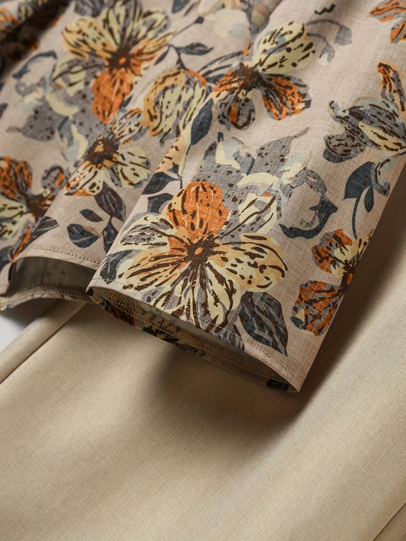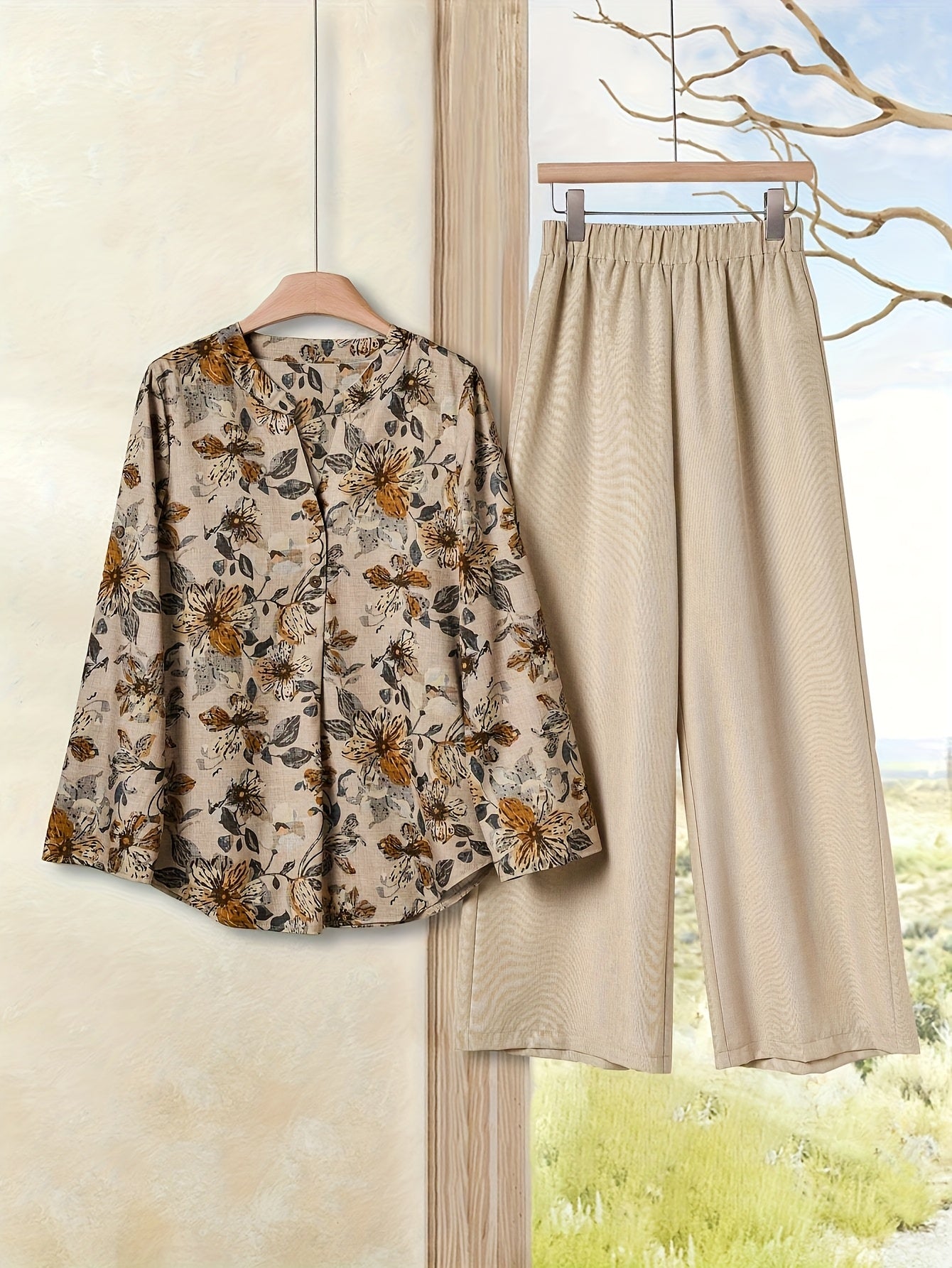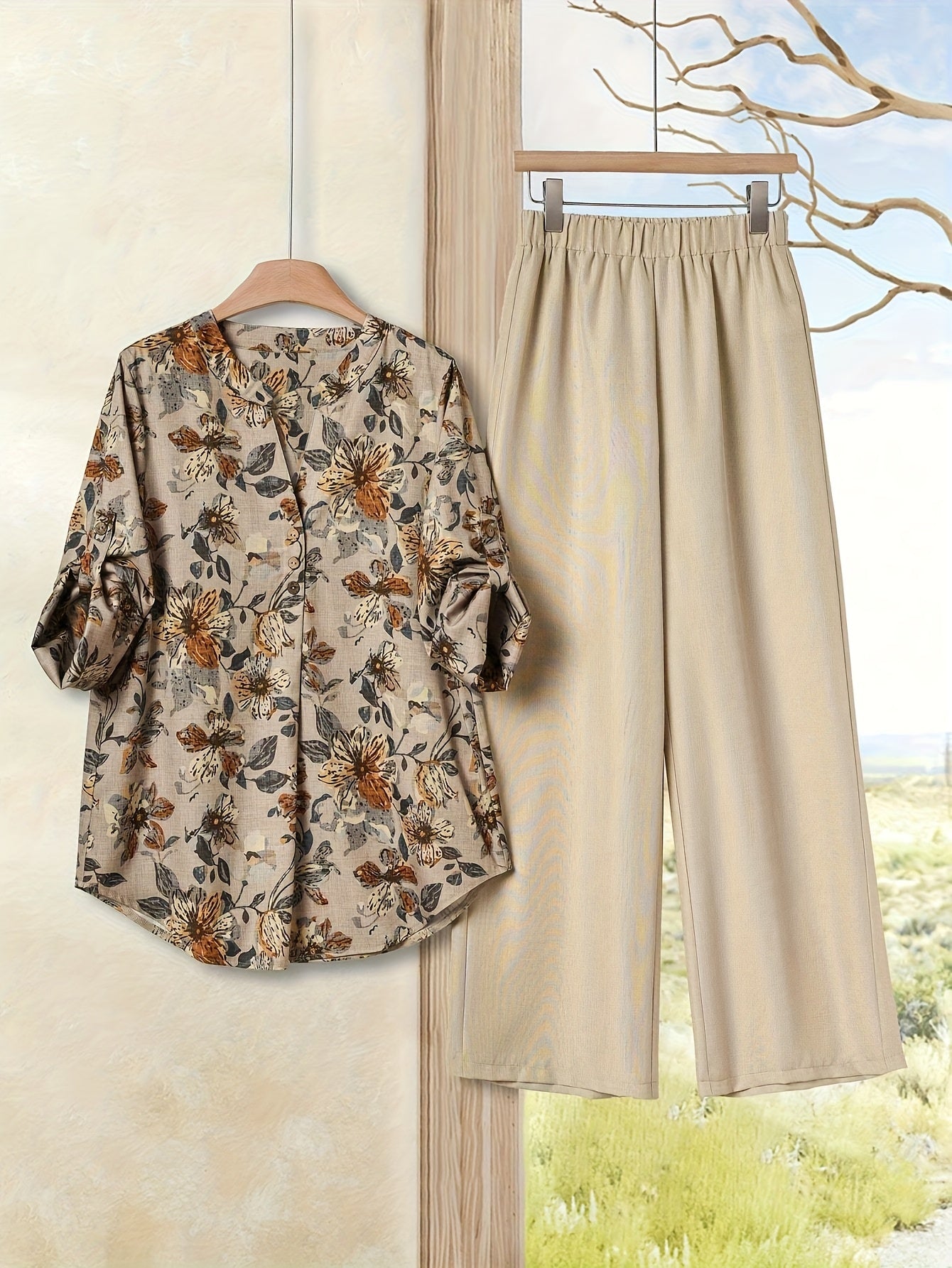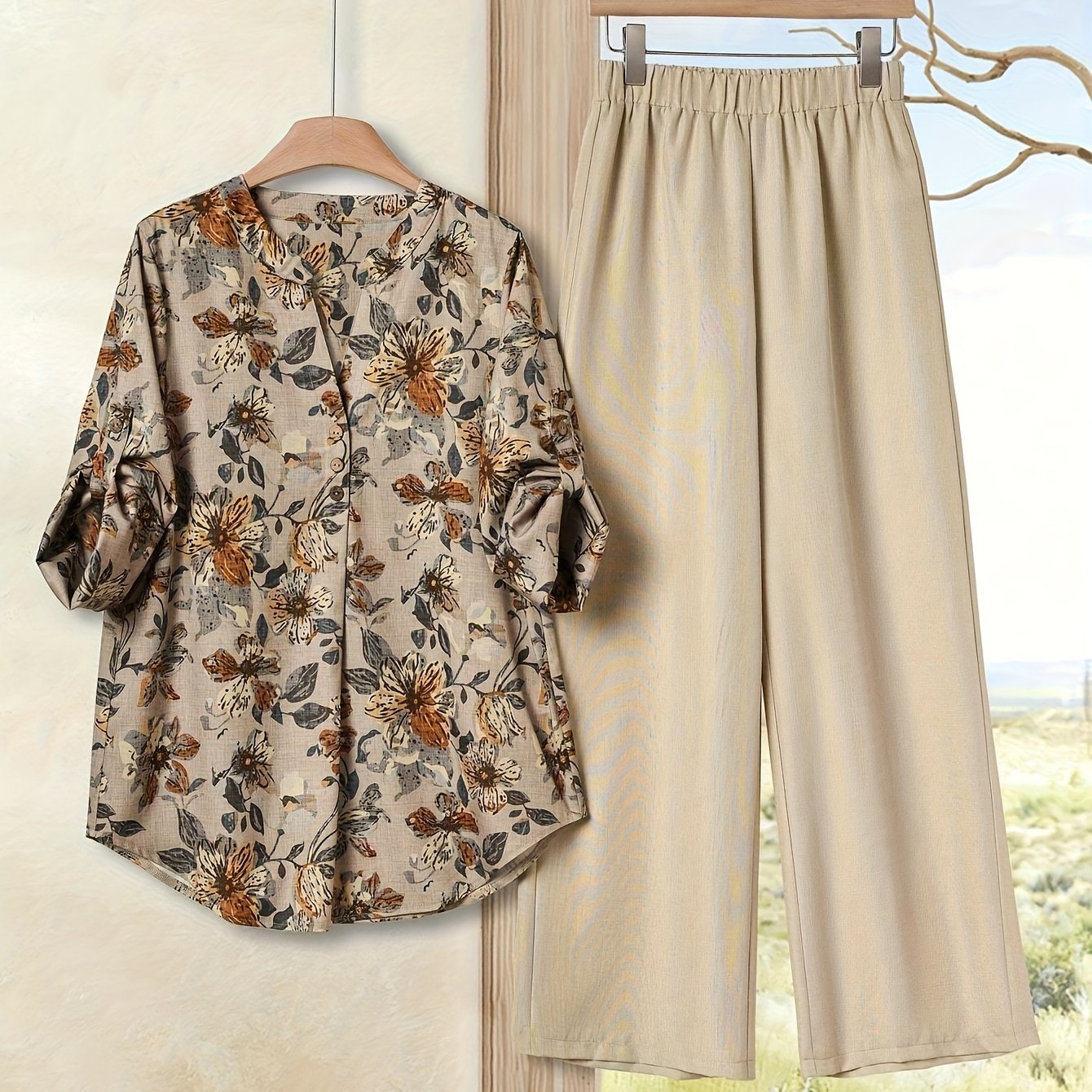 Women'S Elegant Floral Print Blouse & Beige Wide-Leg Pants - Perfect for Spring/Summer, Casual to Semi-Formal Attire, Casual Attire|Floral Print Top|Elegant Blouse