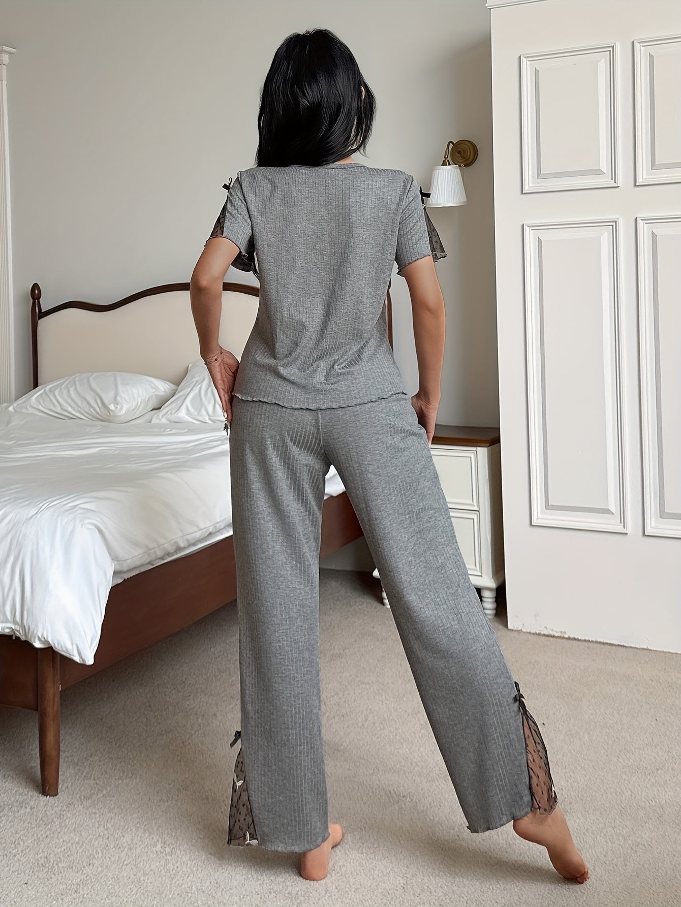 Women'S Elegant Gray Lounge Set with Short Sleeves, Round Neck, and Floral Embroidery - Perfect for Spring/Summer, Includes Matching Shorts and Long Pants, Comfortable Home Wear, Relaxed Fit, Casual Wear | Floral Embroidery T