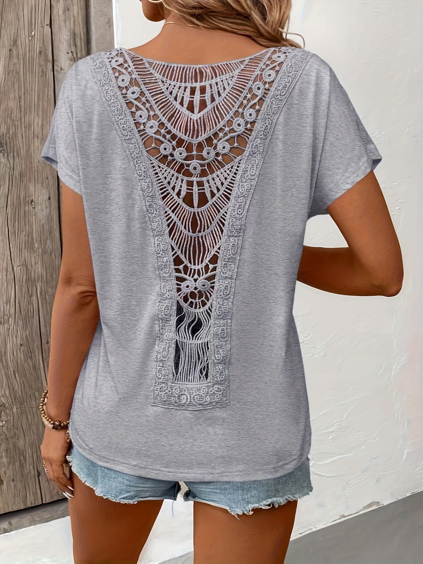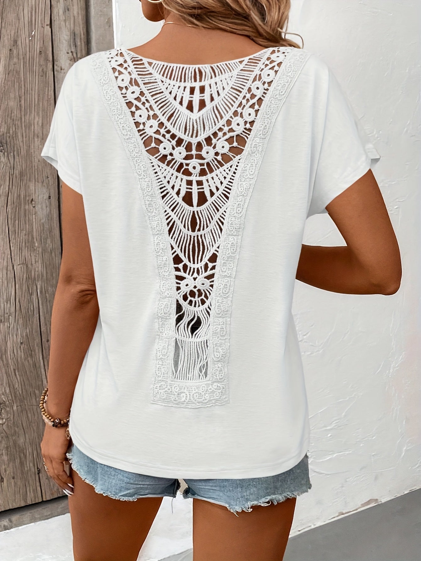 Women'S Elegant Lace Trim Short Sleeve T-Shirt - Chic White Top with Intricate Lace Detail, Round Neck, Lightweight Polyester for Spring/Summer Casual Wear, Ladies T Shirts
