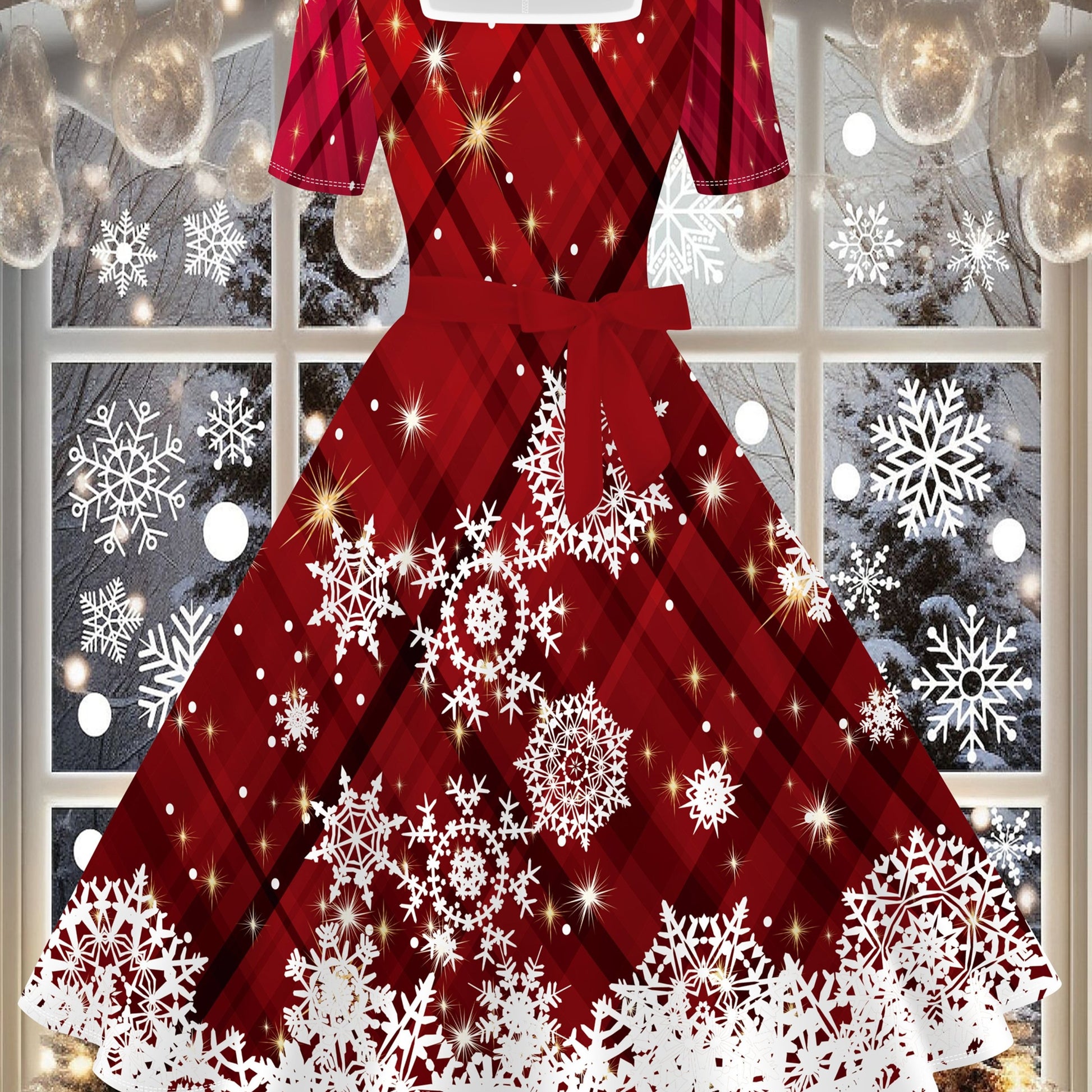 Women's Elegant Red & White Snowflake Print Winter Dress with Square Neckline & A-Line Silhouette - Machine Washable Floor-Length Party Dress for Christmas, New Year's Eve, Everyday & Formal Events - Festive Winter Outfits, F