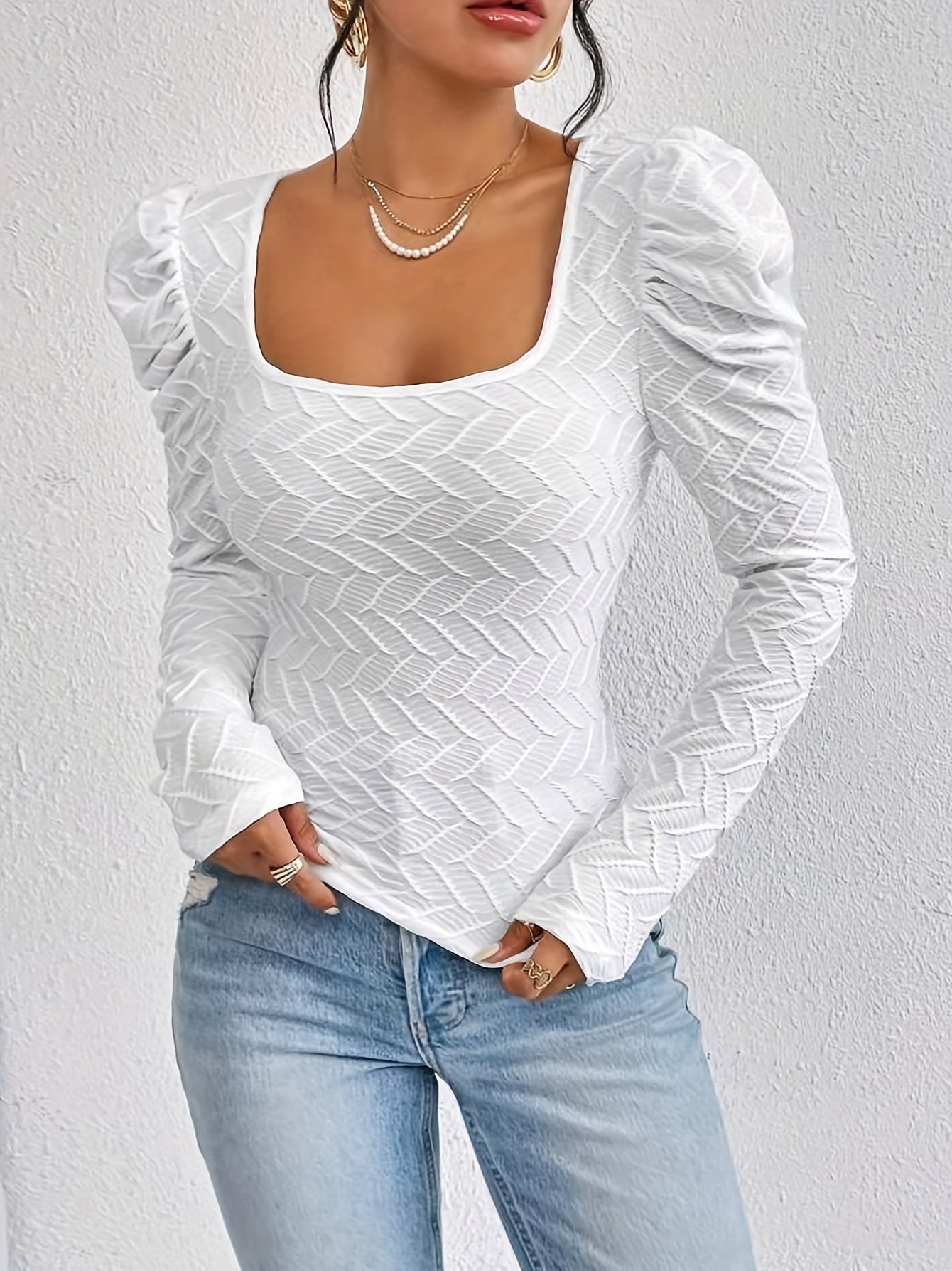 Women'S Elegant Solid Color Square Neck Long Sleeve T-Shirt - Chic Pleated Design, Regular Fit, Versatile for All Seasons