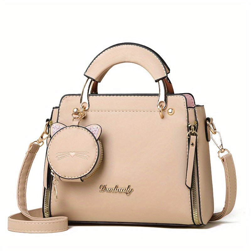 Women'S Fashion 2023 Embroidered Cat Design Messenger Bag, Removable Strap, Zipper Closure, Polyester Lined, Casual Shoulder Handbag with Edge Paint Detail