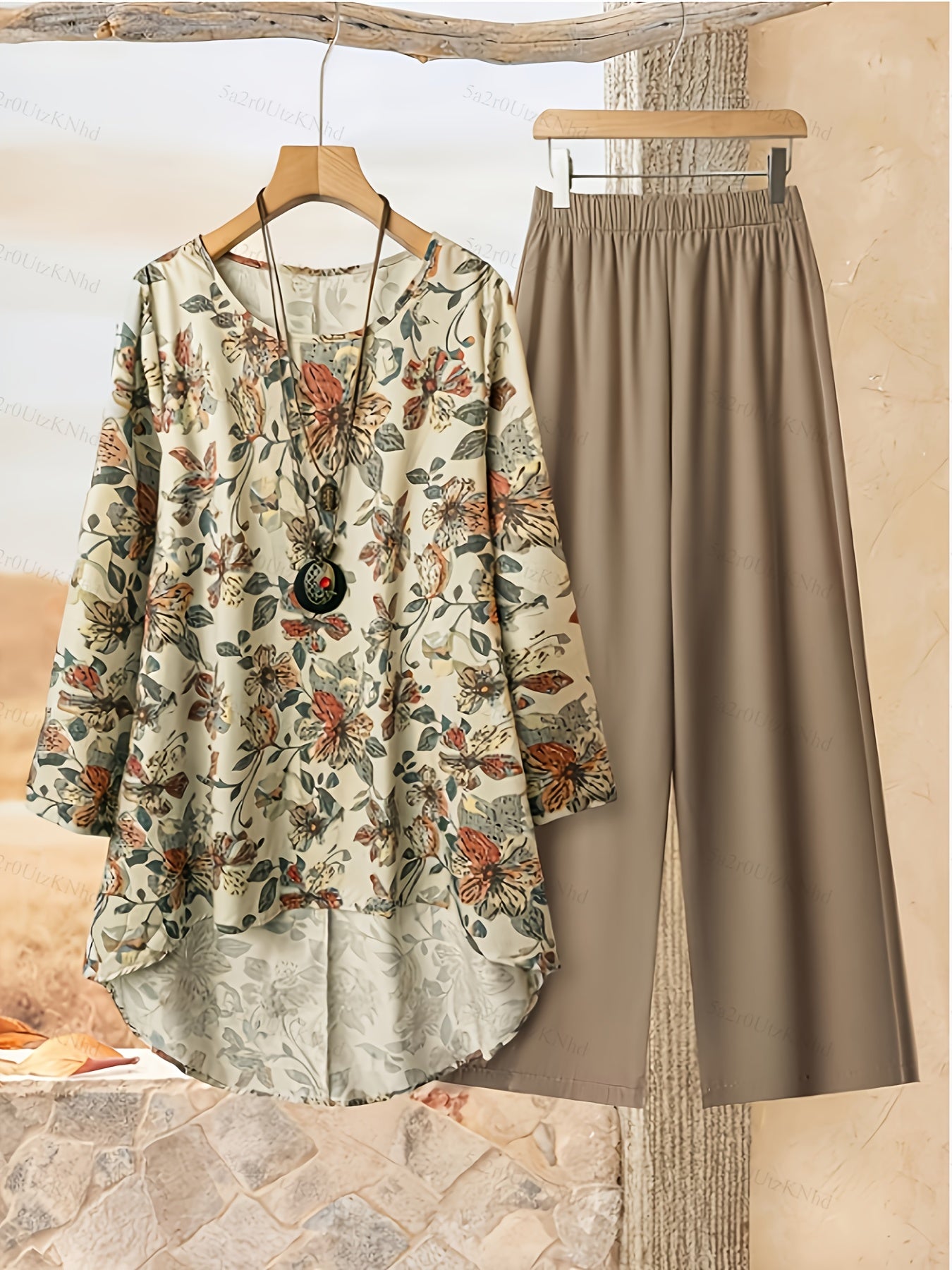 Women's Fashion Set with Floral Print Top and Khaki Pants