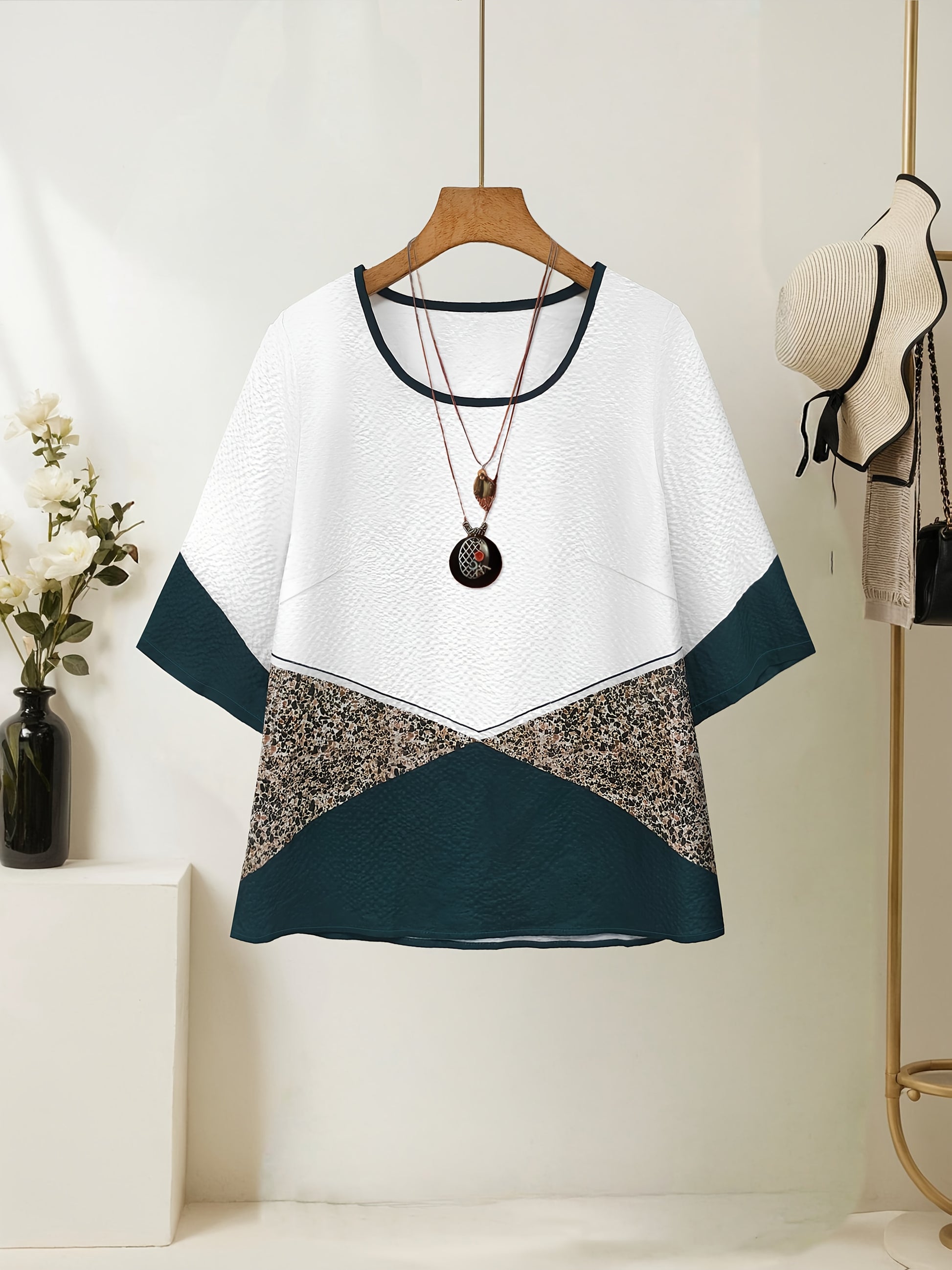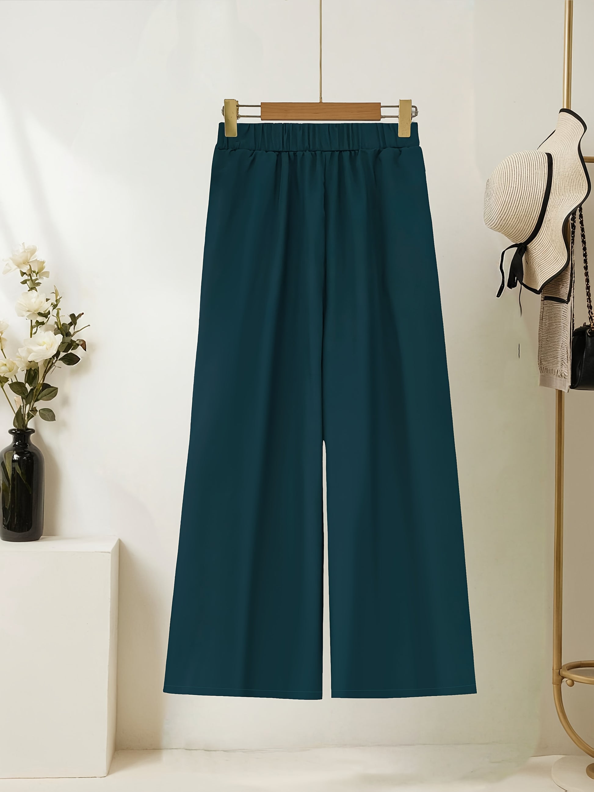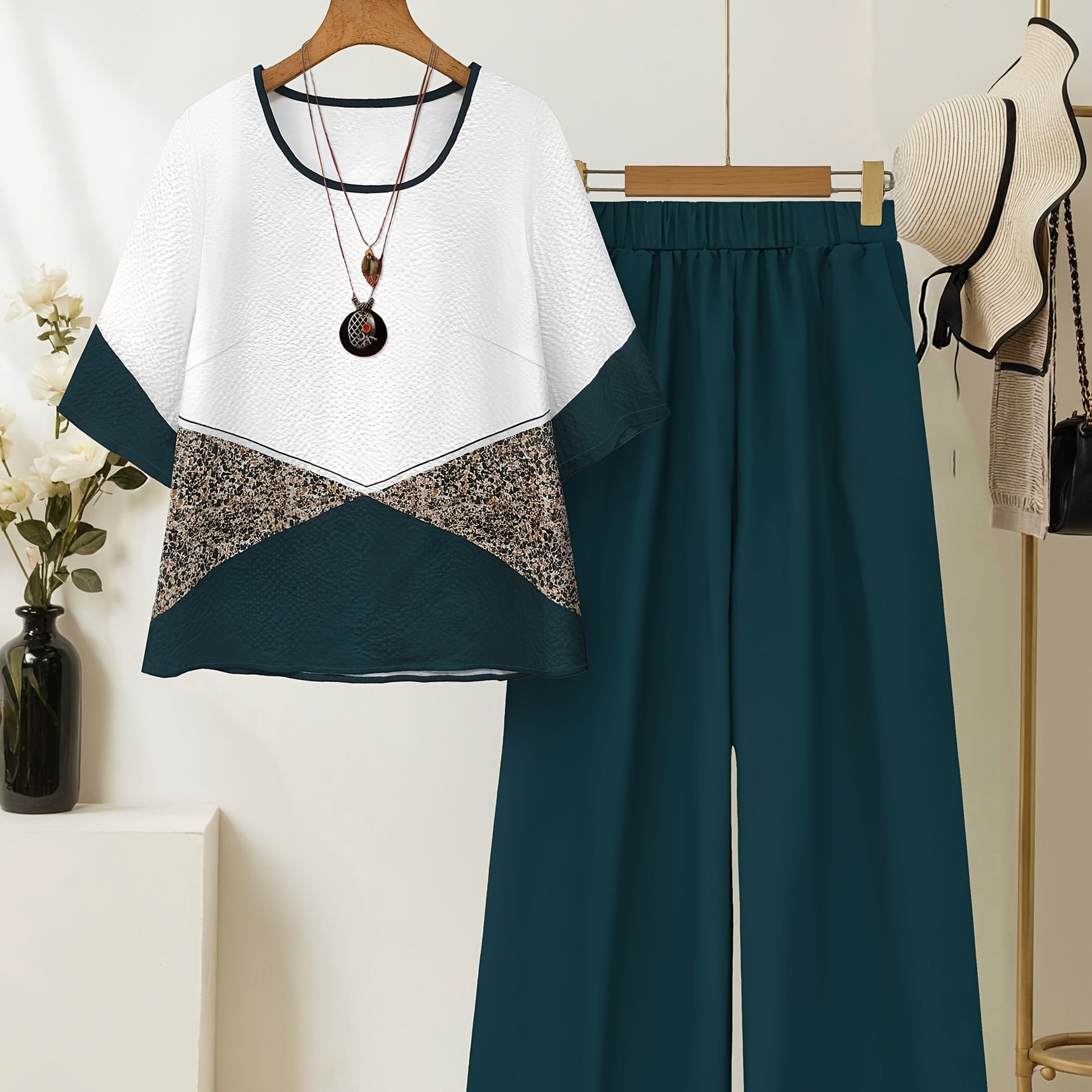 Women's fashionable printed patchwork round-neck top with solid-colored wide-leg trousers