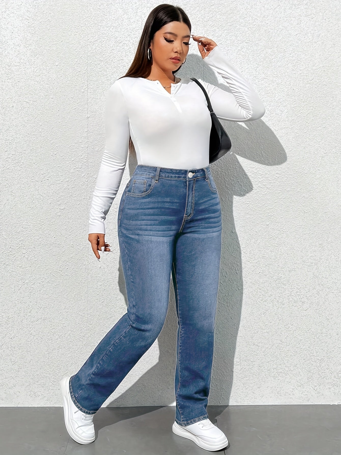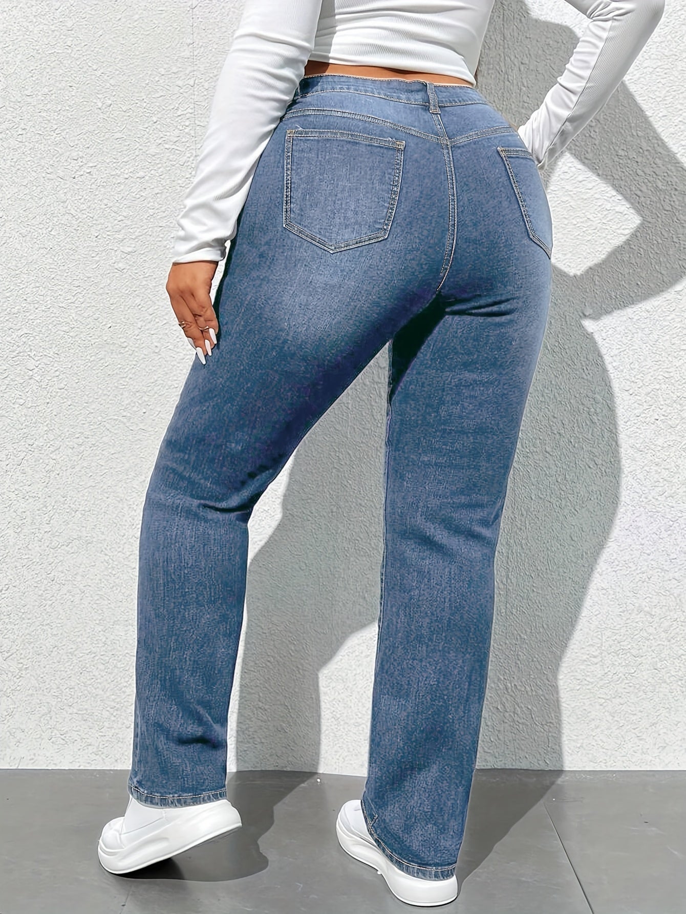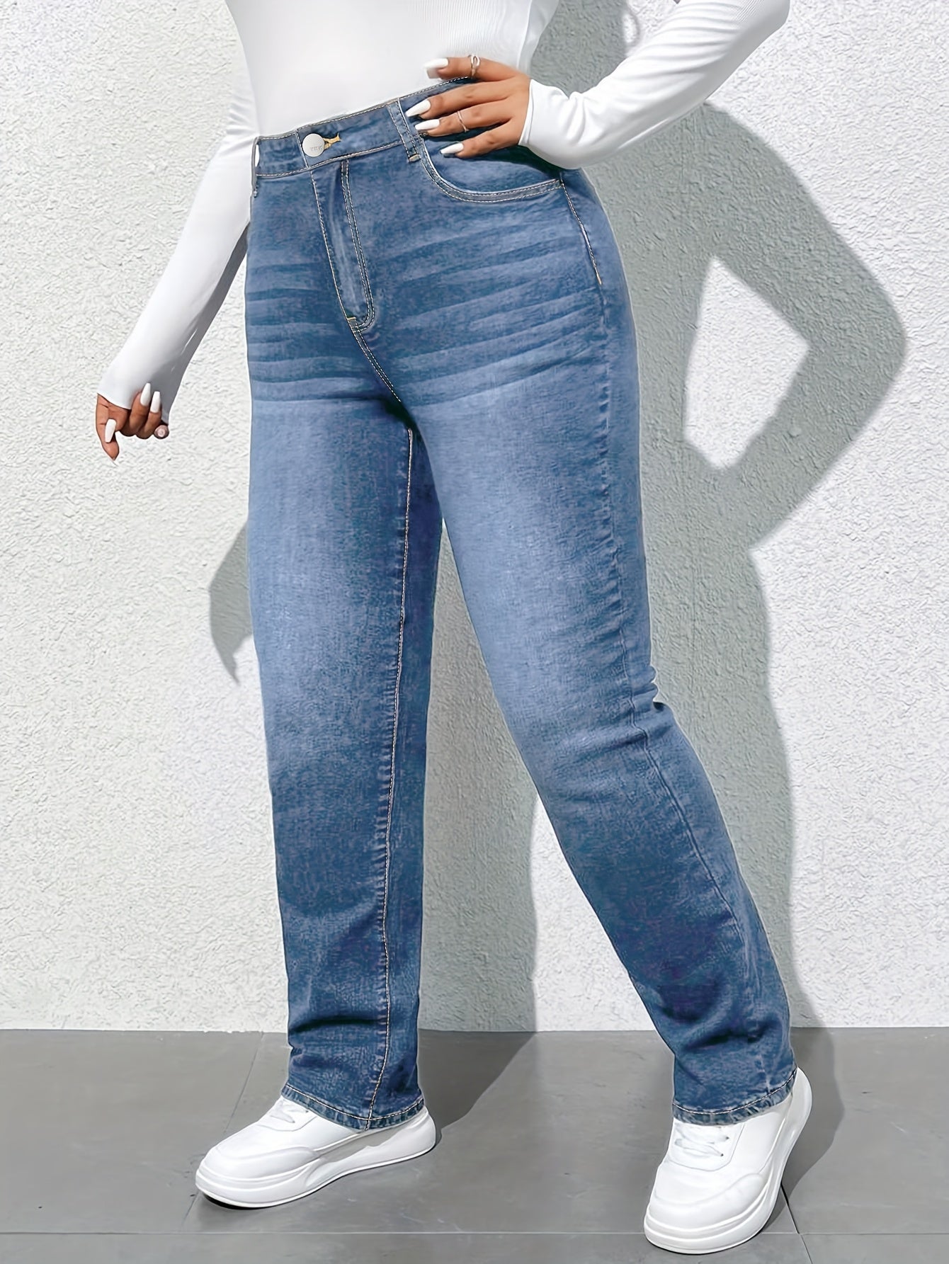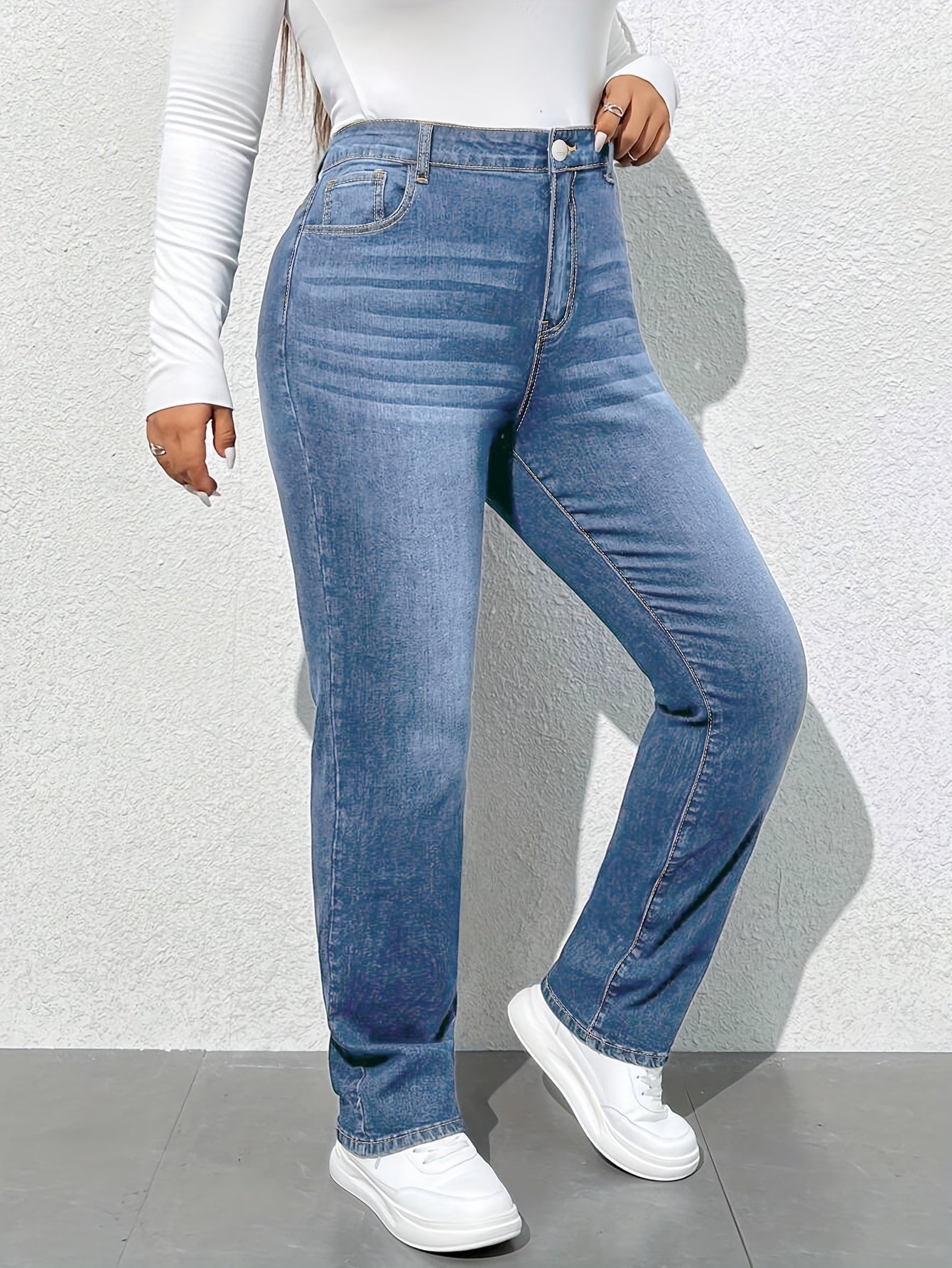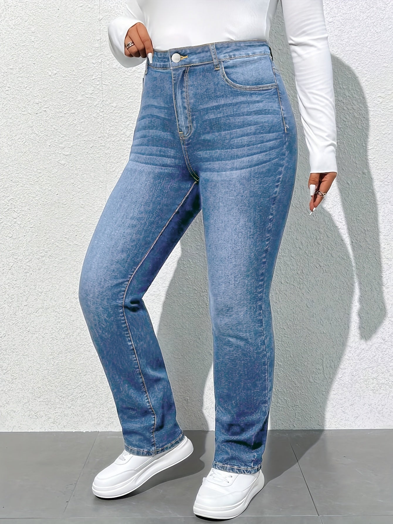 Women'S High-Waisted Straight Leg Jeans, 68.5% 25.7% Polyester 4.3% Viscose 1.5% Elastane, Casual Skinny Fit Denim Pants with Zipper Fly, All-Season Solid Color, 300g/m² Fabric Weight, Long Length - No Belt Required