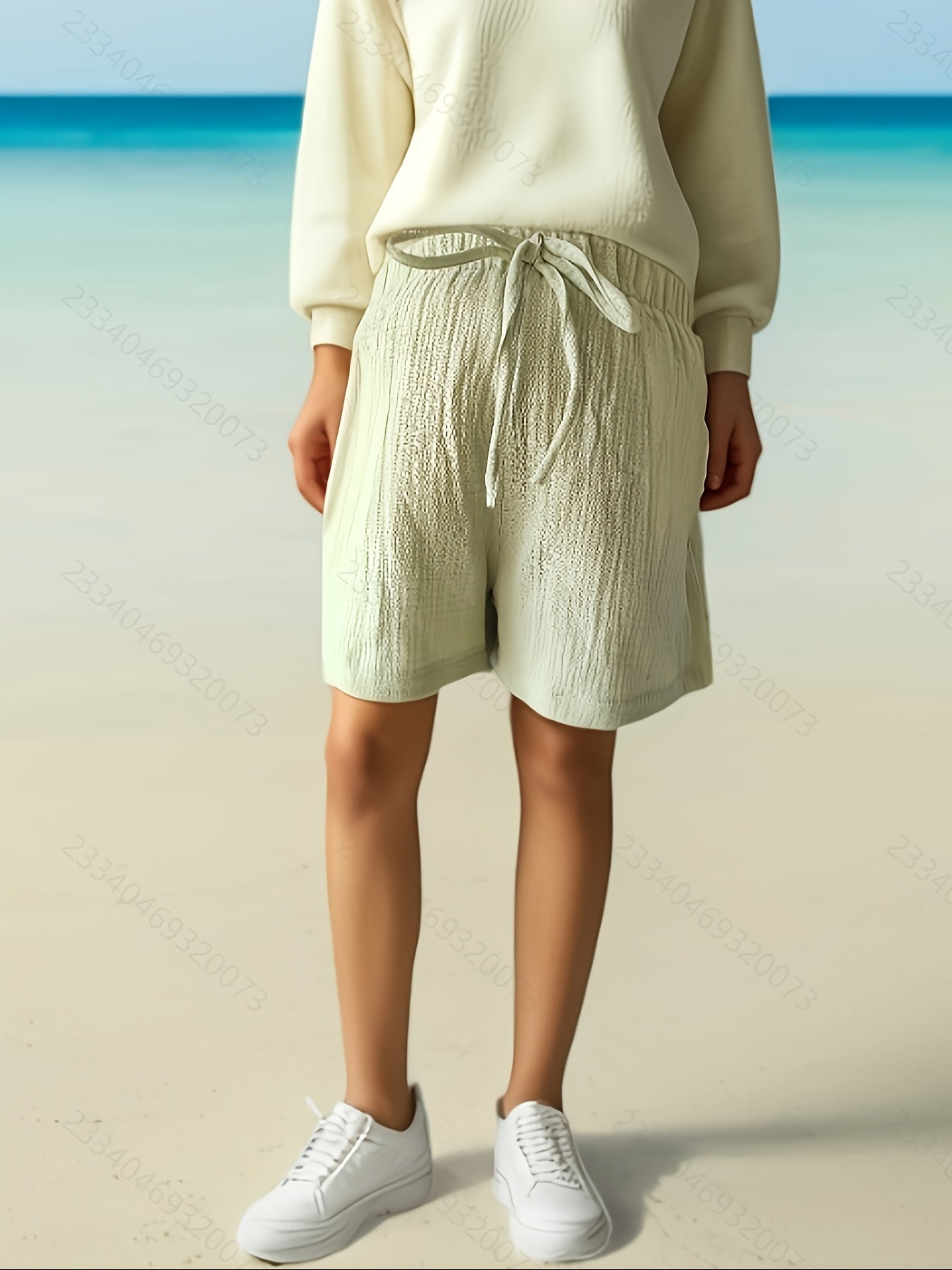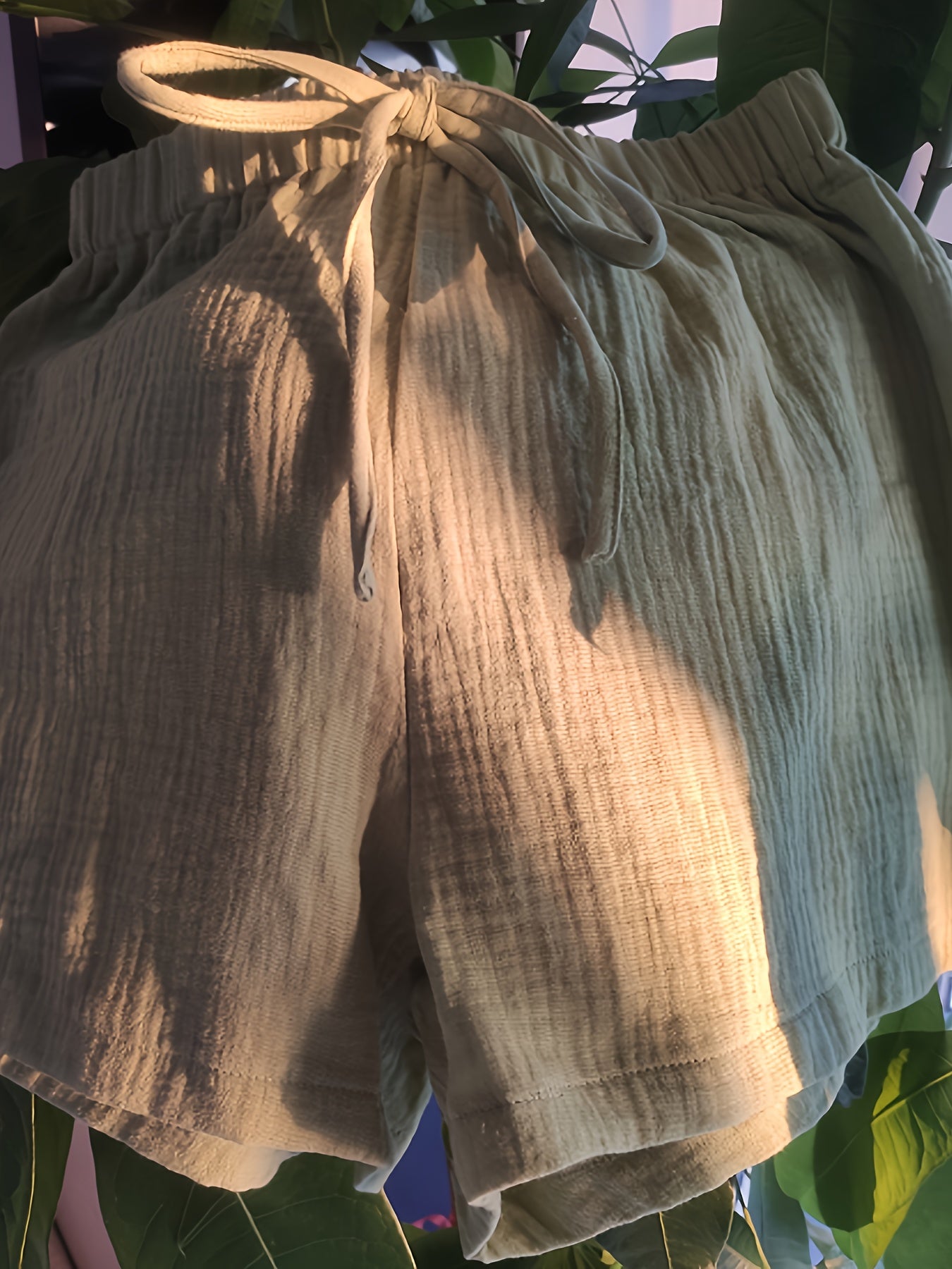 Women's Light Green Double-Layer Crinkle Shorts with Faux Drawstring - Casual, Versatile, and Elegant Design for Spring/Summer/Fall