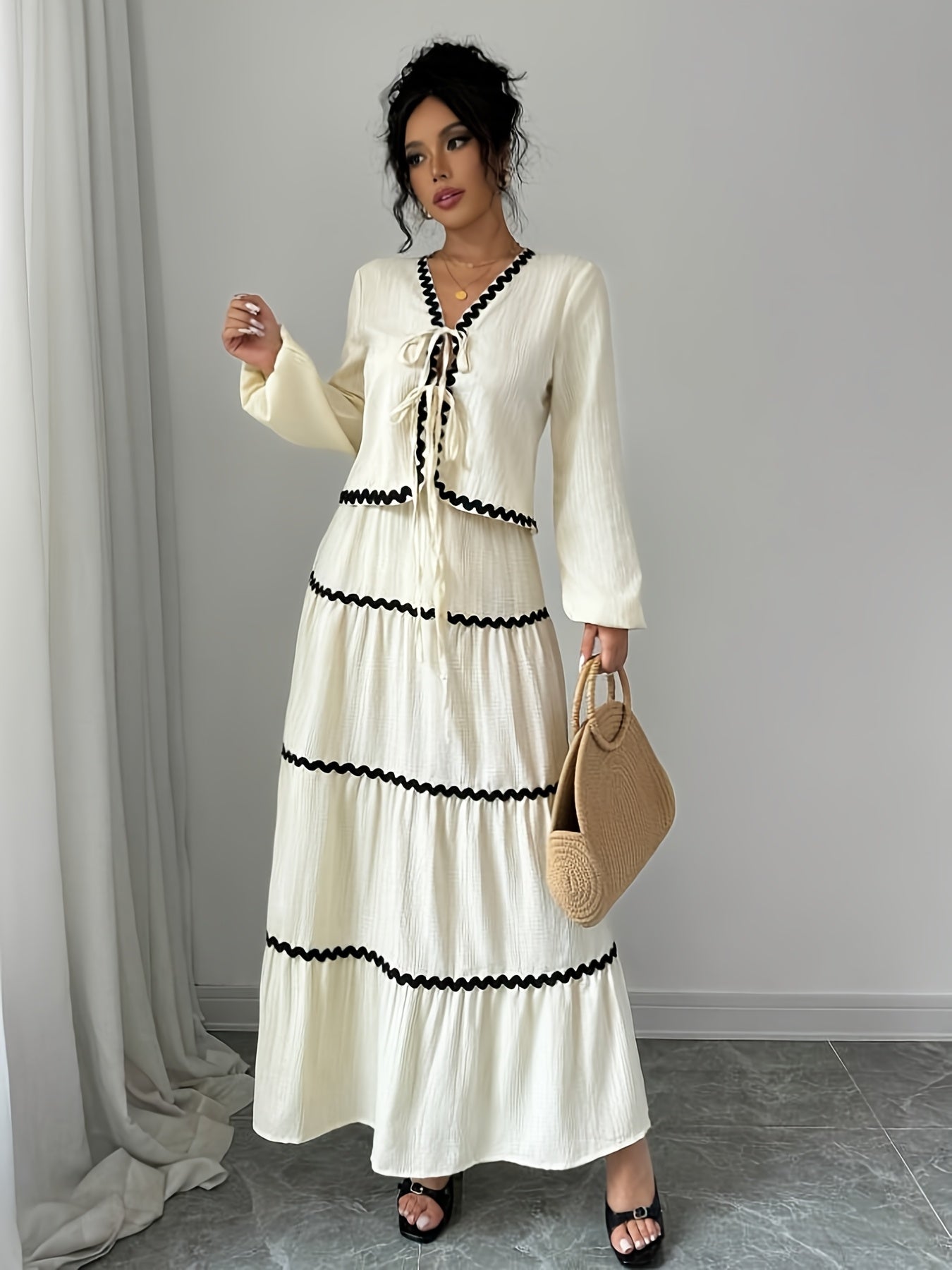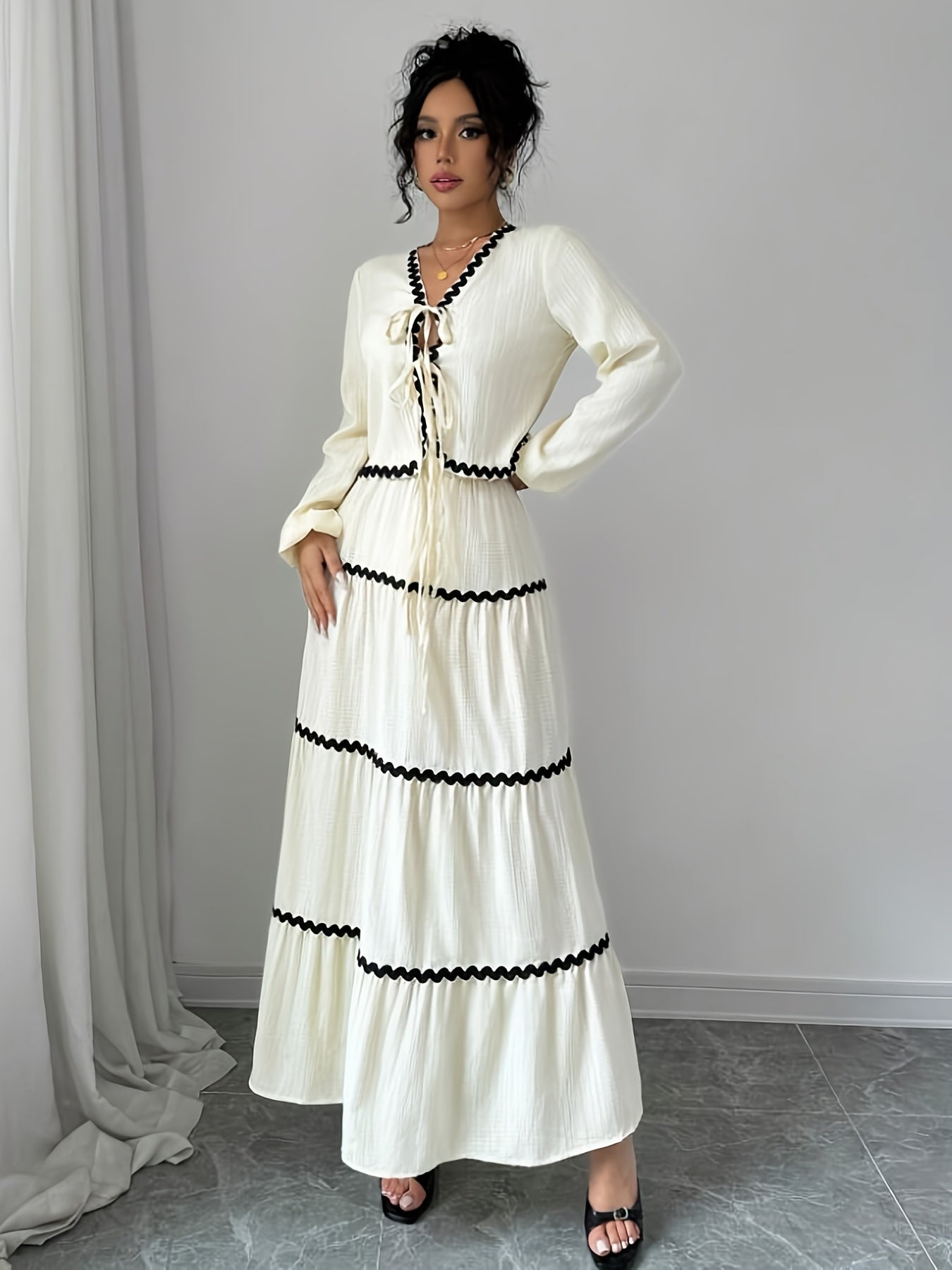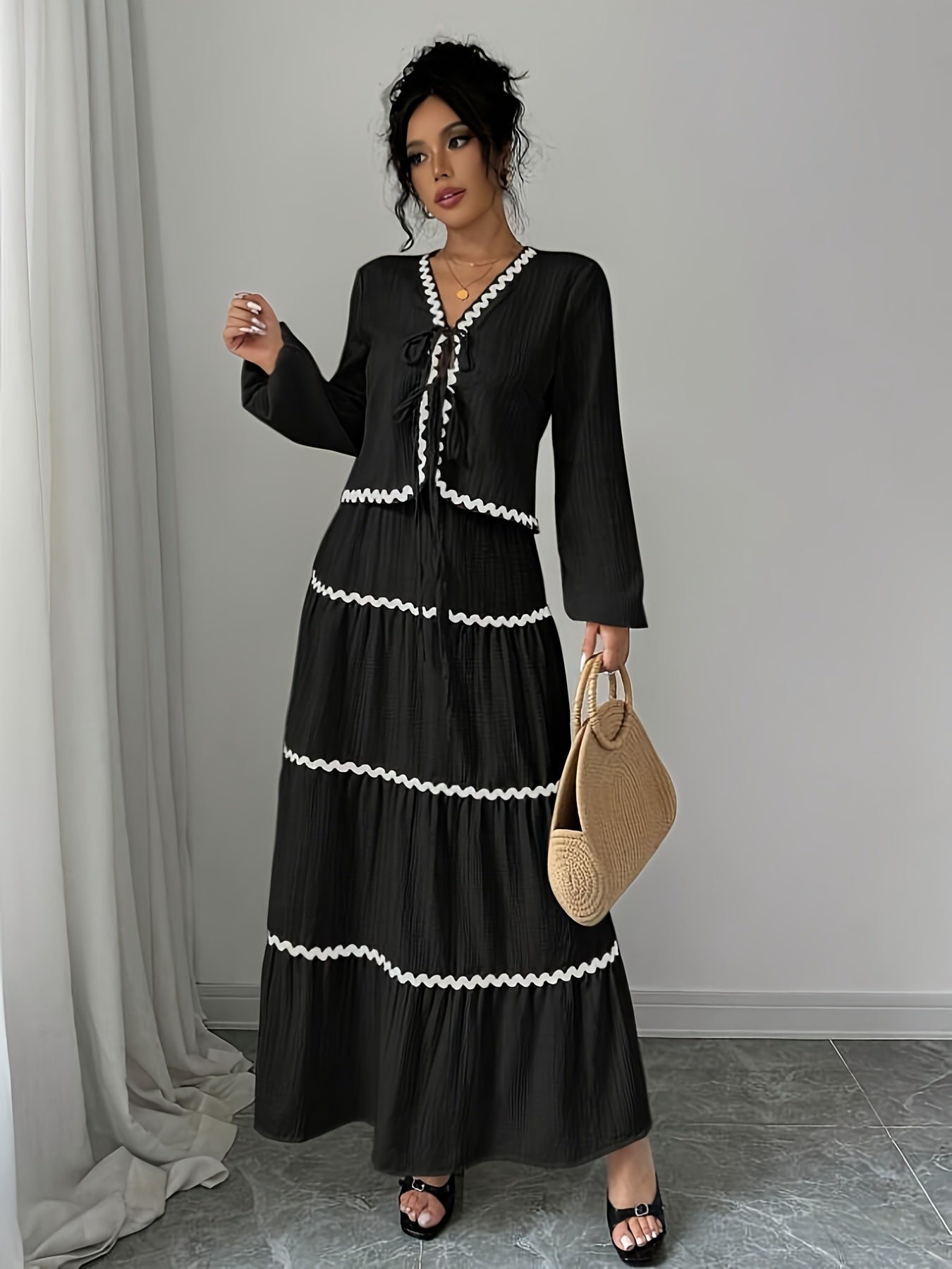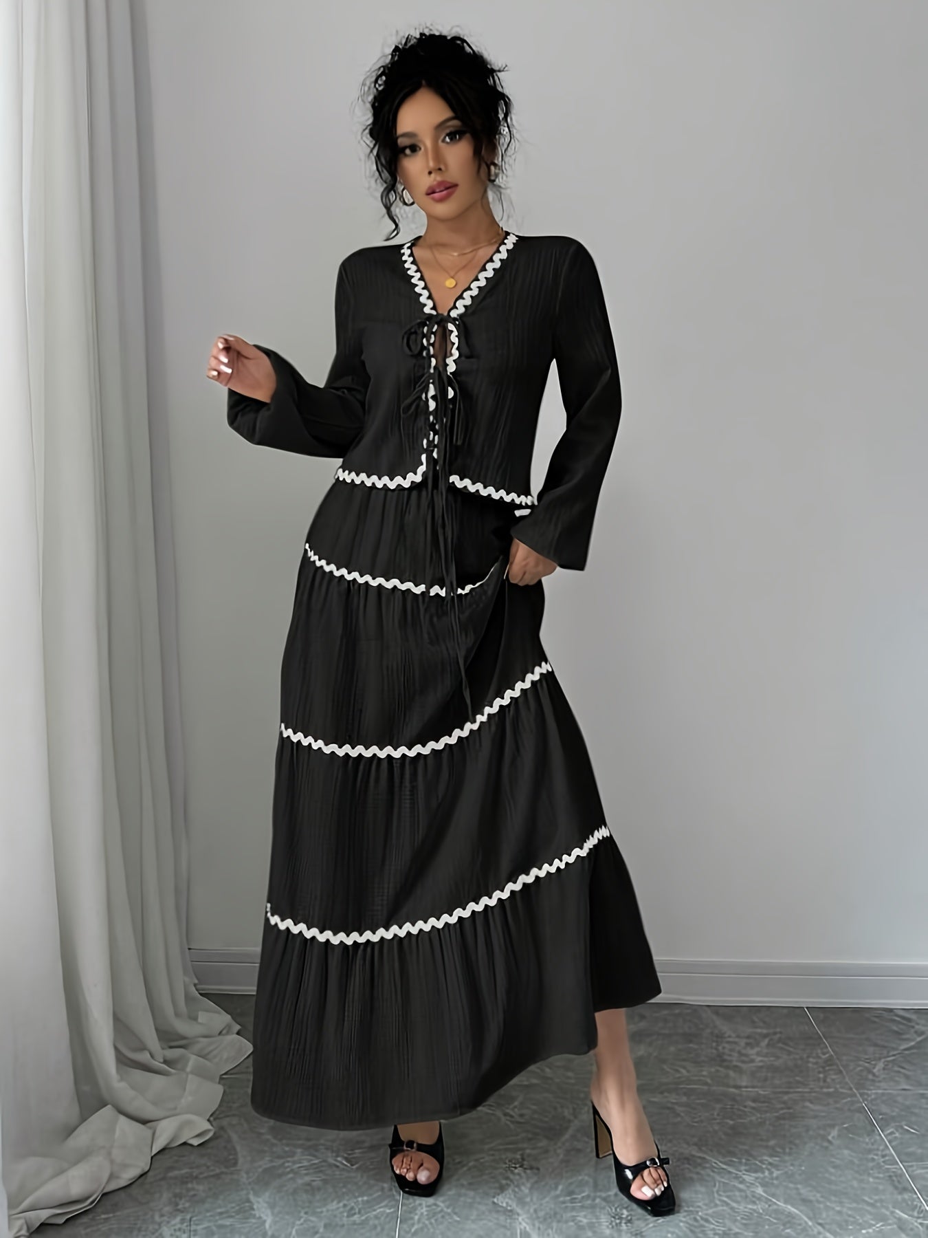 Women'S New Arrival Black and White Ruffled Lace Trim Long Sleeve Shirt with Tie Waist Umbrella Skirt Set, Stylish Elegant Vacation Commute Daily Wear Date Party Two-Piece Outfit Suitable for All Seasons