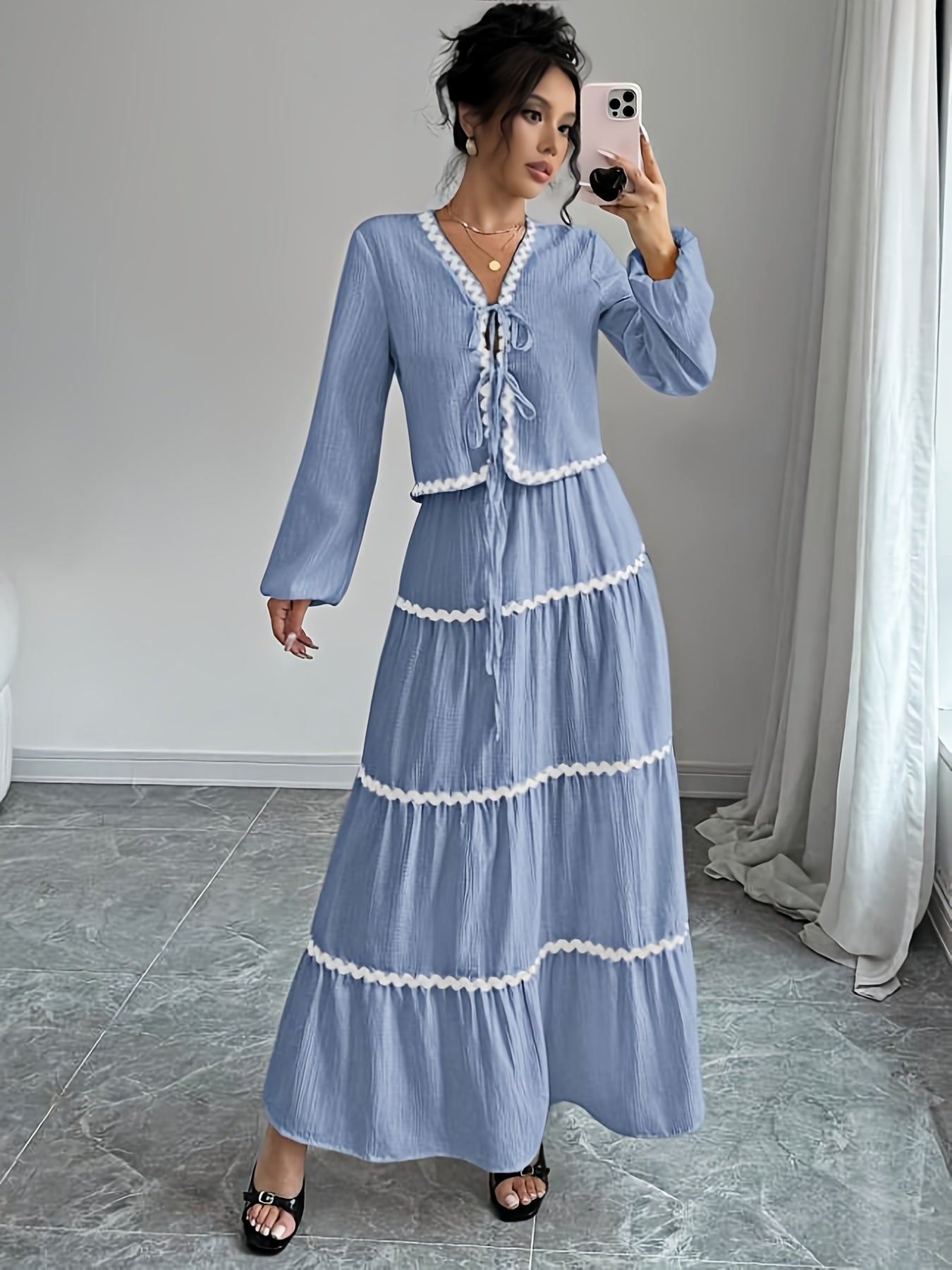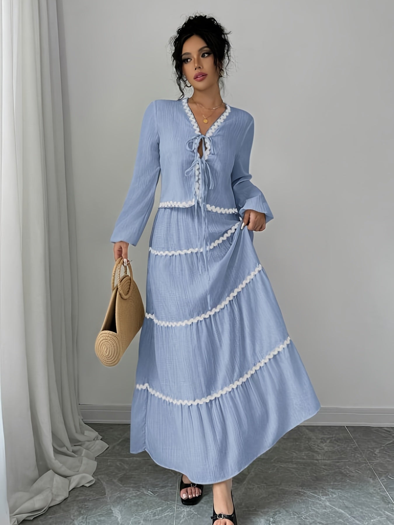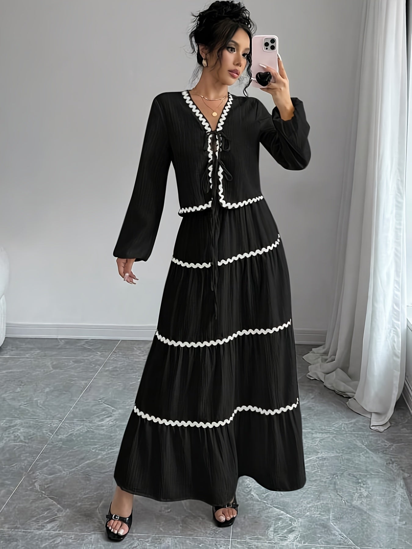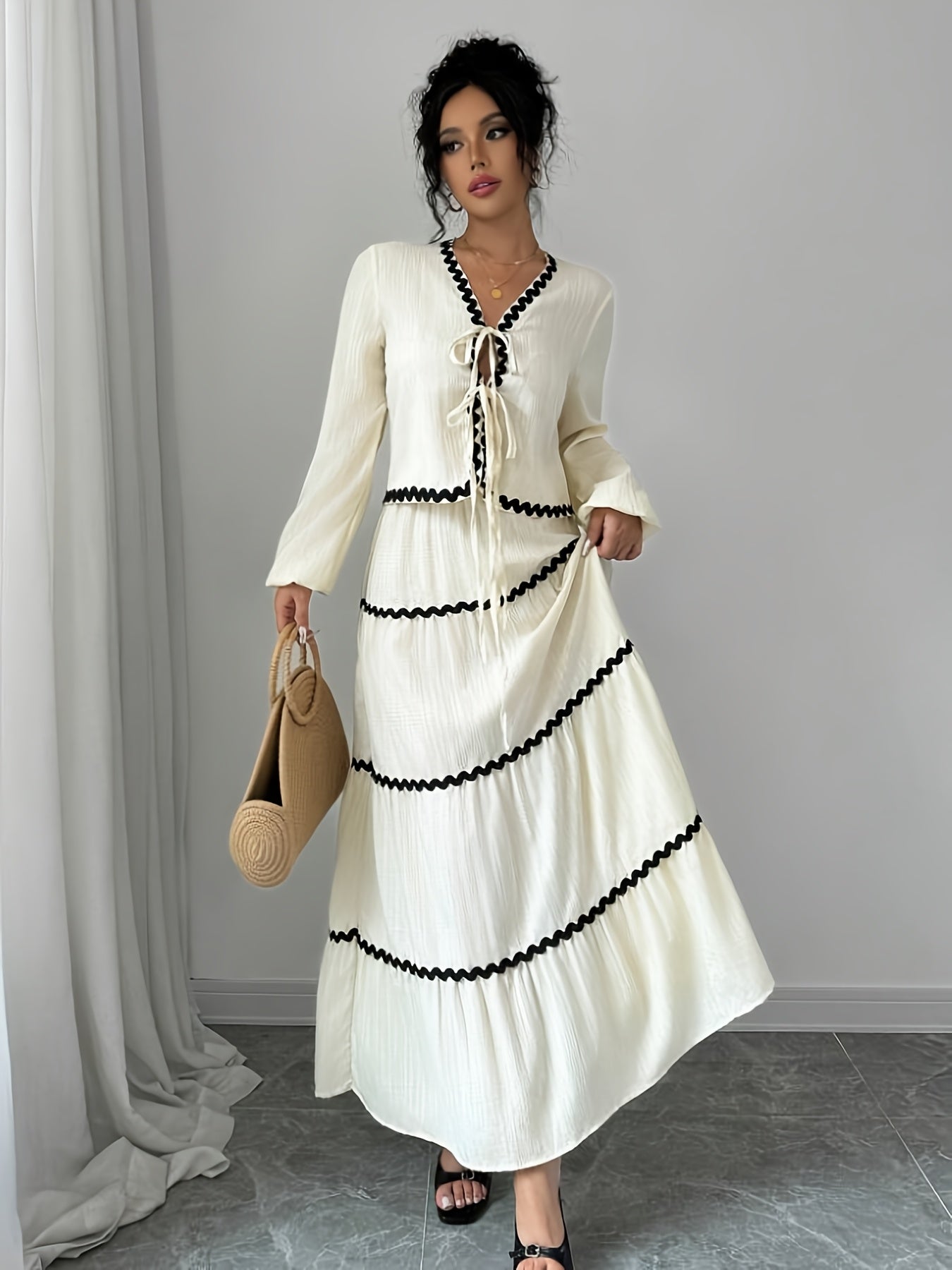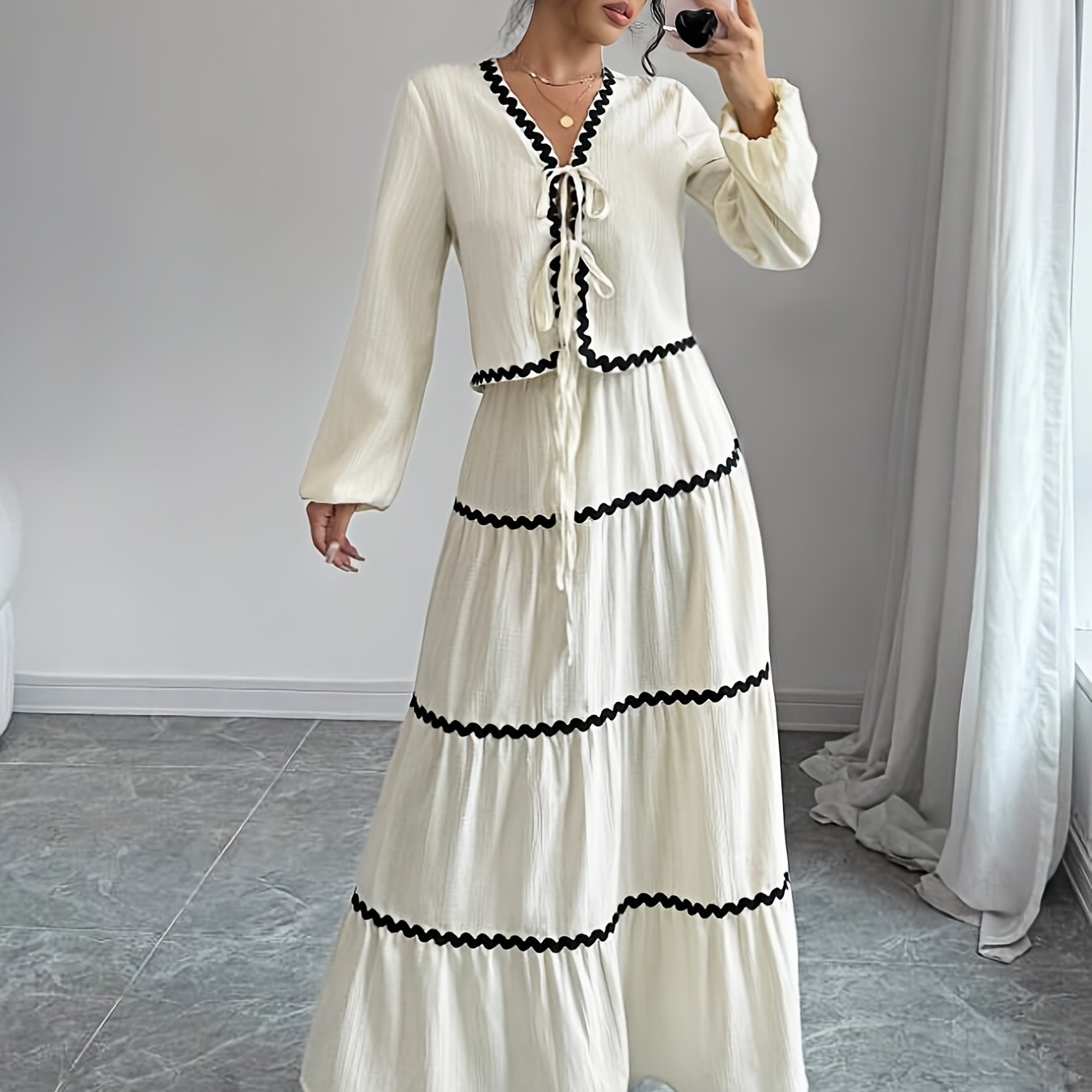Women'S New Arrival Black and White Ruffled Lace Trim Long Sleeve Shirt with Tie Waist Umbrella Skirt Set, Stylish Elegant Vacation Commute Daily Wear Date Party Two-Piece Outfit Suitable for All Seasons