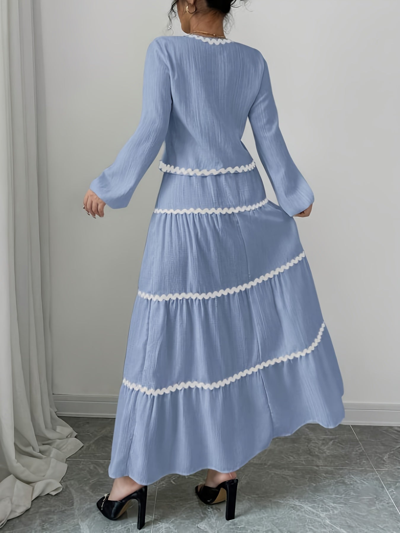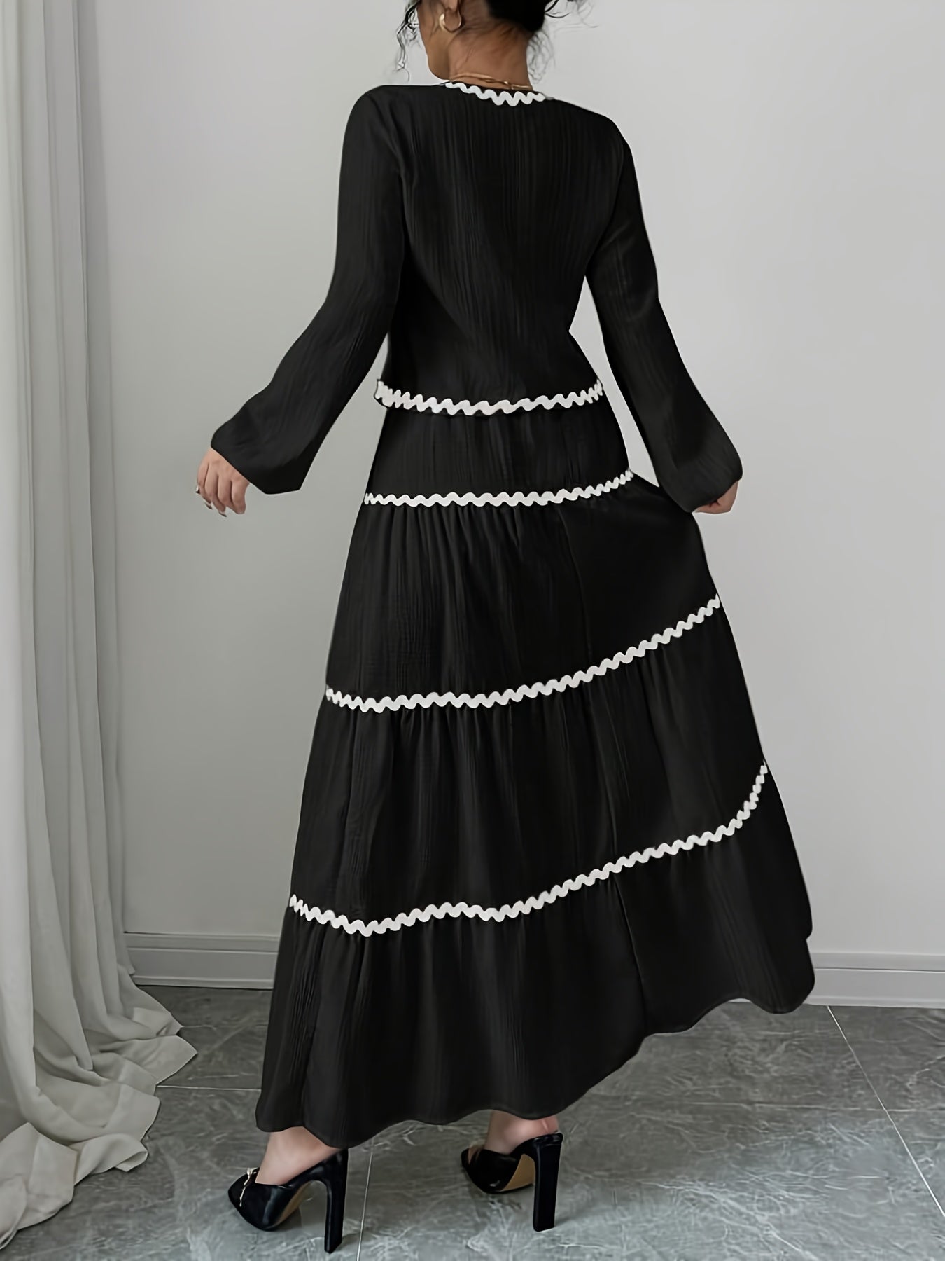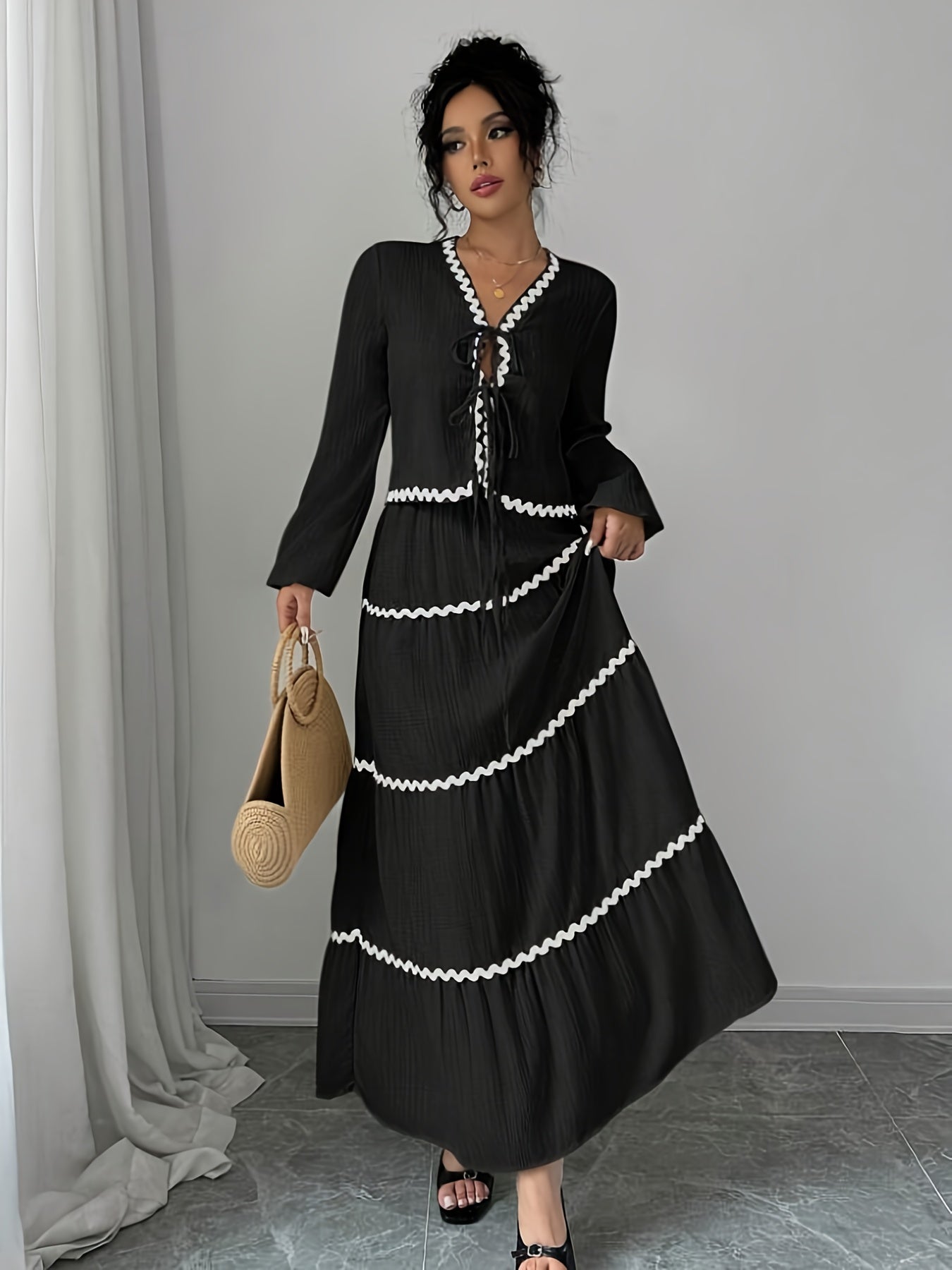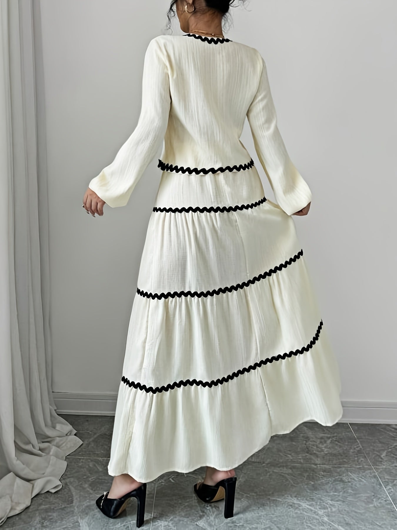 Women'S New Arrival Black and White Ruffled Lace Trim Long Sleeve Shirt with Tie Waist Umbrella Skirt Set, Stylish Elegant Vacation Commute Daily Wear Date Party Two-Piece Outfit Suitable for All Seasons